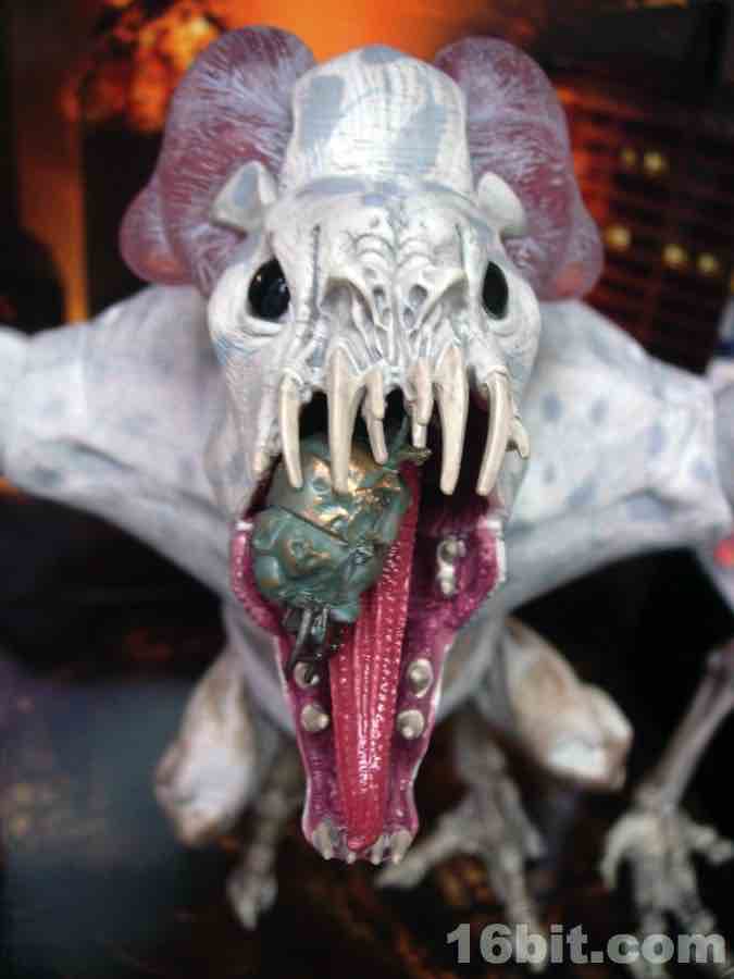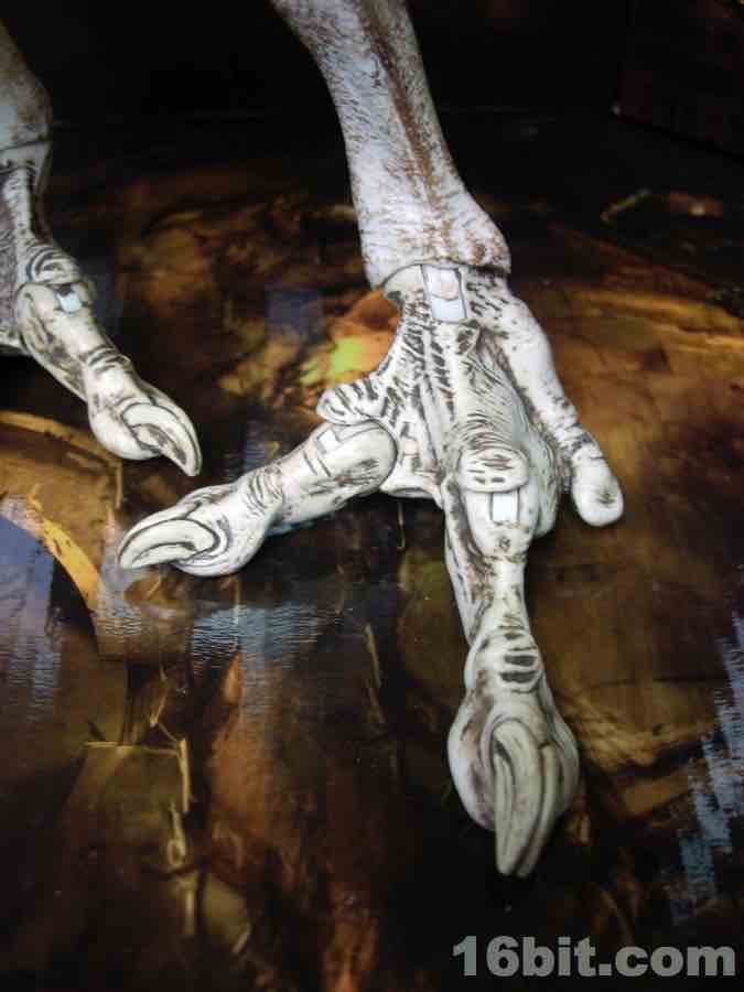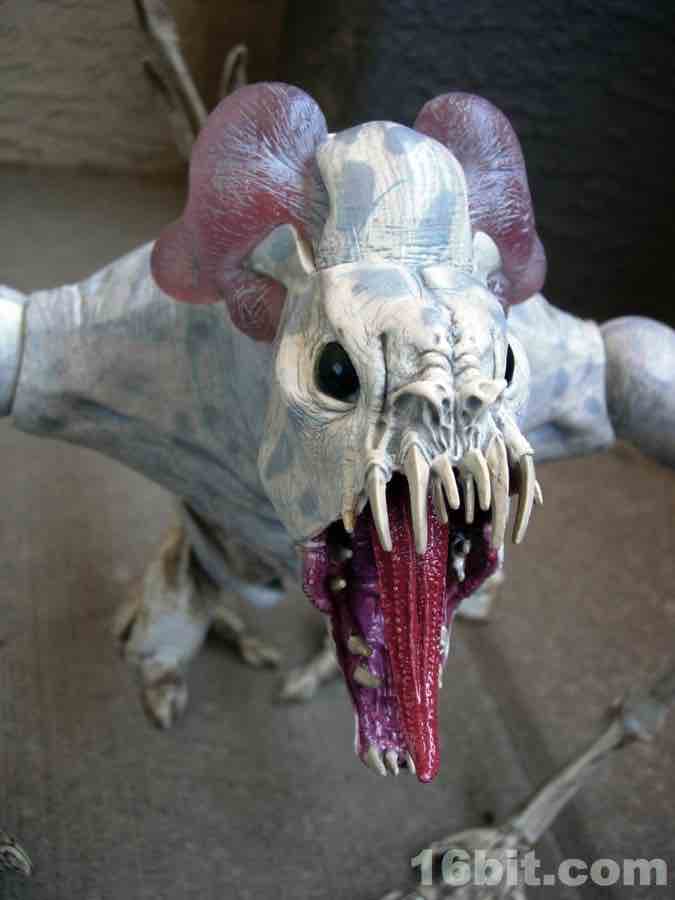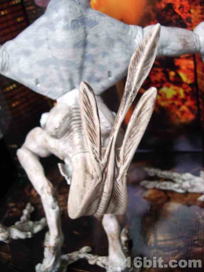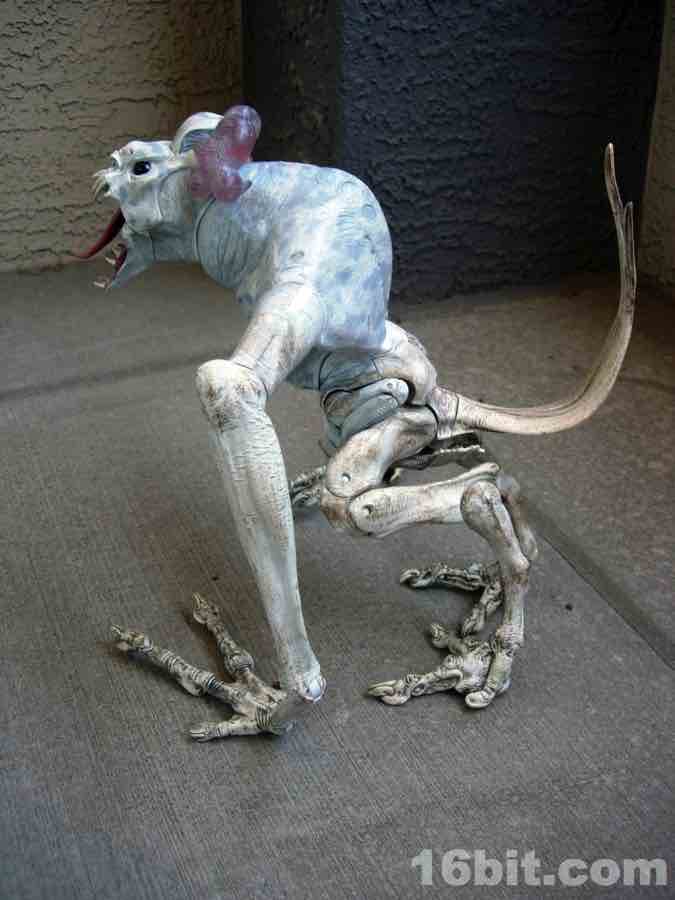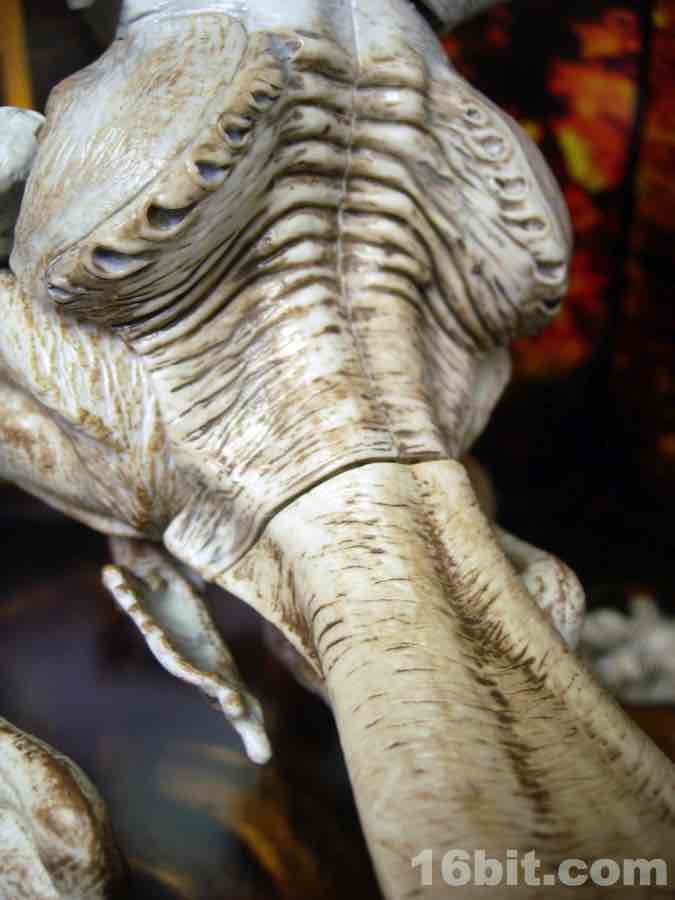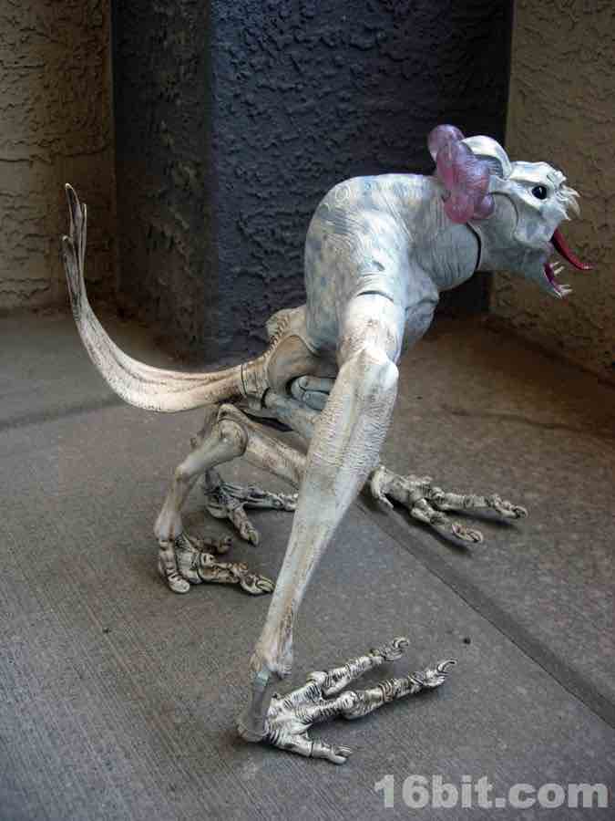 This monster has more articulation than I care to count. On his torso are a couple of smaller arms which are fully jointed and, if I read correctly, designed to be an external part of the digestive system. (They weren't seen in the movie much.) In addition to this, each limb is jointed in several places in addition to the digits. That's right-- not only are the fingers and toes jointed, but they're jointed in multiple places. There's also a tail, plus he has a few extra joints you're going to discover as you futz with him. On the whole this is awesome, but gravity can be a cruel mistress when it comes to displaying the toy. Its weight will, over time, cause him to sag a bit and this may actually cause him to topple over if not leaned or balanced properly.