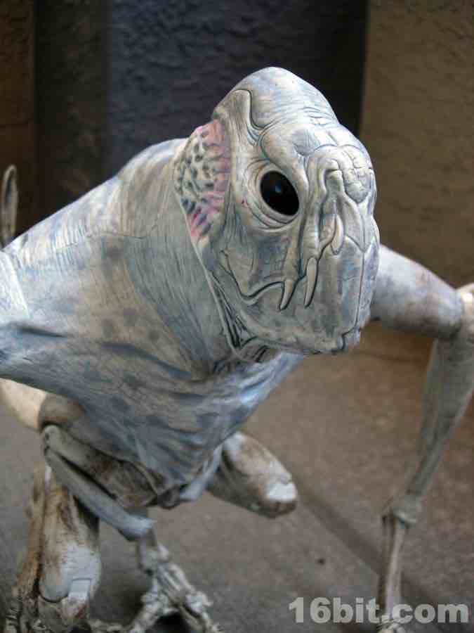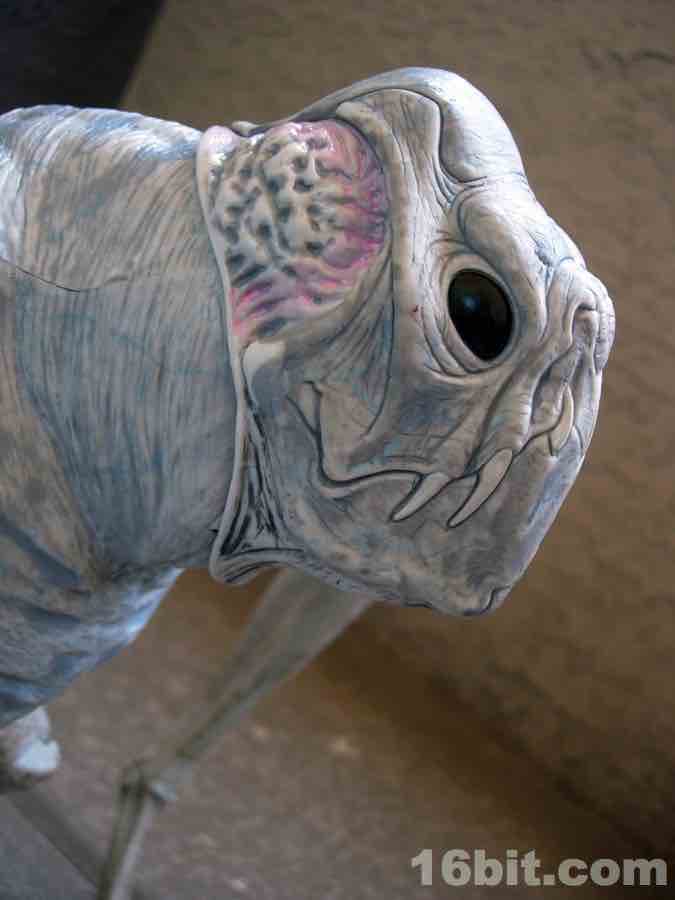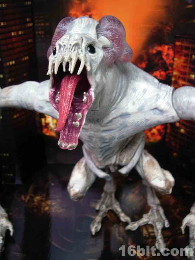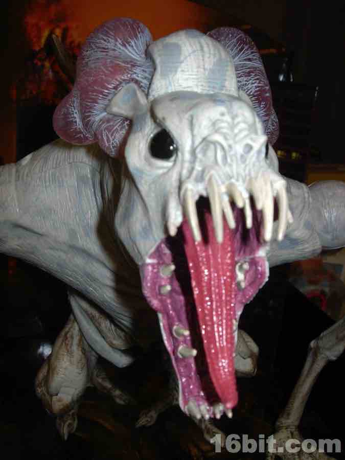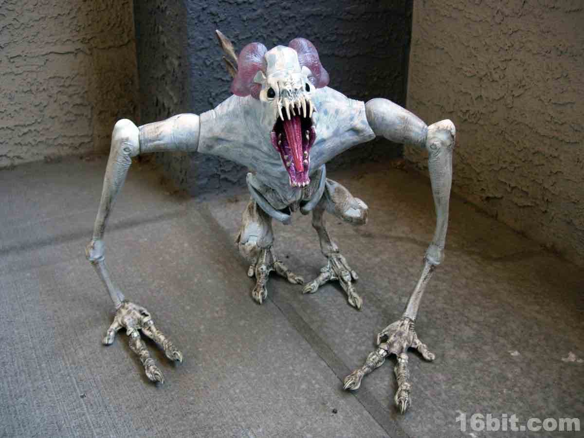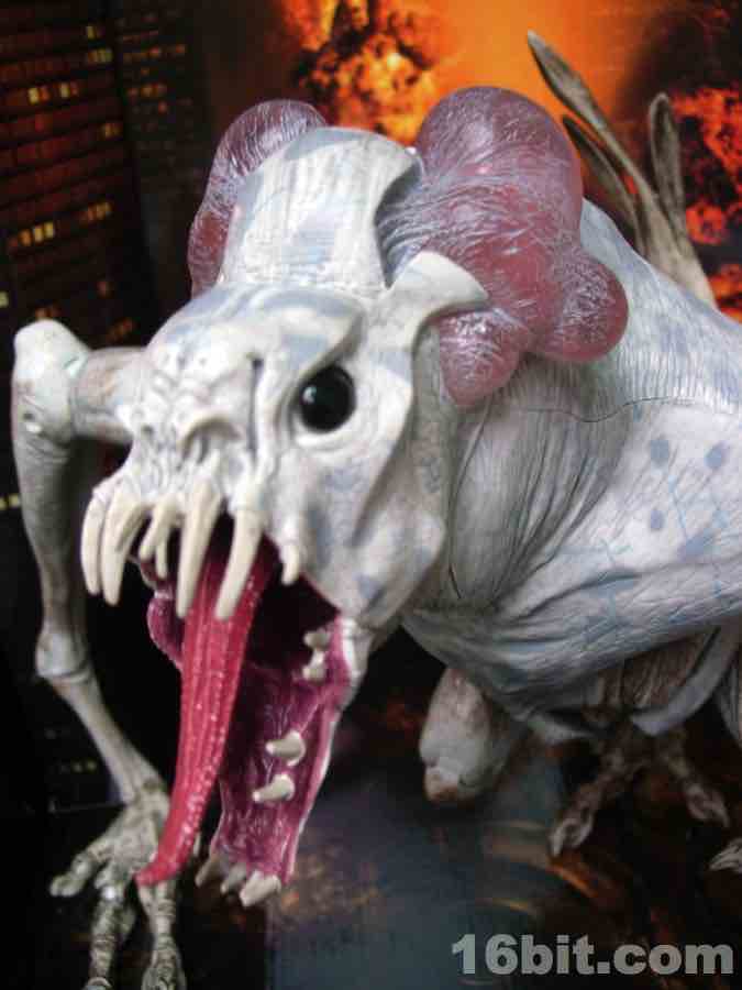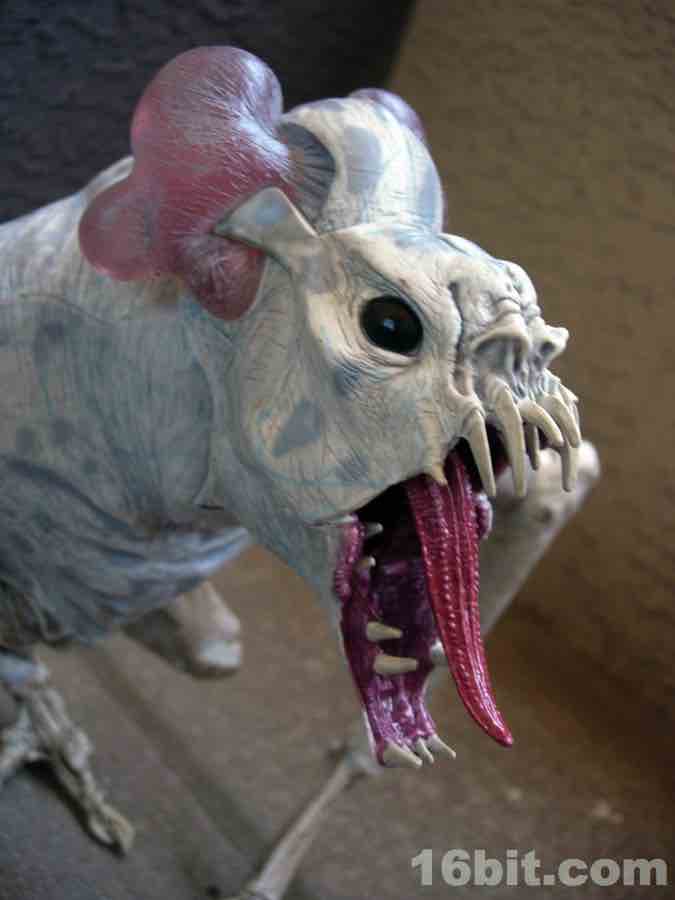 This monster has more articulation than I care to count. On his torso are a couple of smaller arms which are fully jointed and, if I read correctly, designed to be an external part of the digestive system. (They weren't seen in the movie much.) In addition to this, each limb is jointed in several places in addition to the digits. That's right-- not only are the fingers and toes jointed, but they're jointed in multiple places. There's also a tail, plus he has a few extra joints you're going to discover as you futz with him. On the whole this is awesome, but gravity can be a cruel mistress when it comes to displaying the toy. Its weight will, over time, cause him to sag a bit and this may actually cause him to topple over if not leaned or balanced properly.