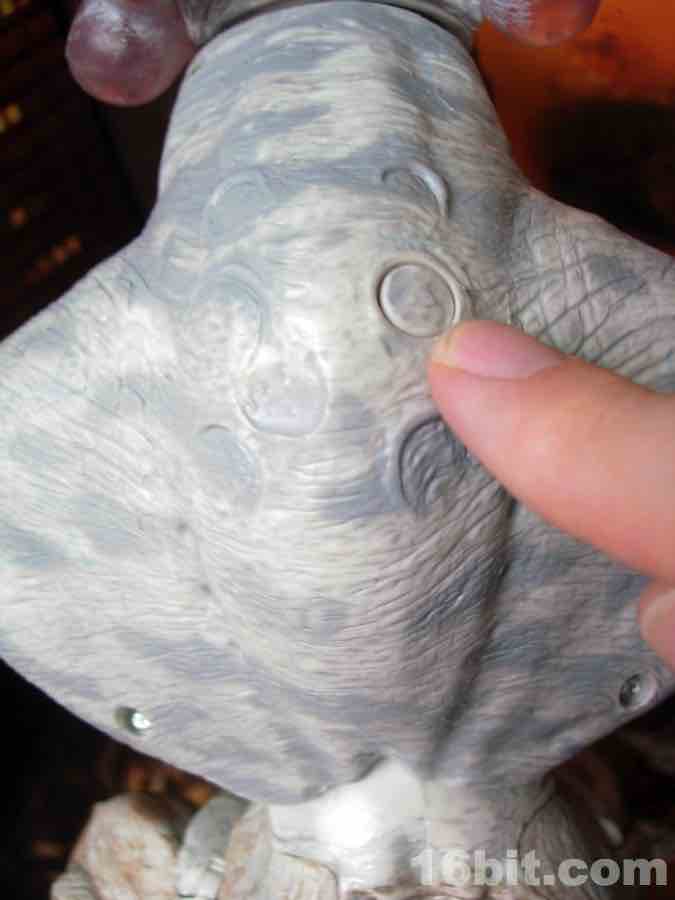 While most toys here just look nice, Cloverfield actually does stuff. For starters, he has two different heads, each of which has a different action figure. The calm/curious head not only looks adorable, but it doubles as a parasite storage container. If you pop off his head (see far below) you'll notice a little compartment, just big enough to put some of the miniscule parasites inside. The angry/furious head has engorged... uh... head things plus his tongue sticking out, revealing a fully-opened mouth full of sharp teeth and fear. The tongue doubles as a button to activate the toy's one electronic roar, which may also be activated by a switch in the figure's back, should you ever lose the head. Impressive! Oh, and I should note the included Statue of Liberty head does fit in his mouth.