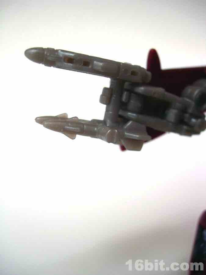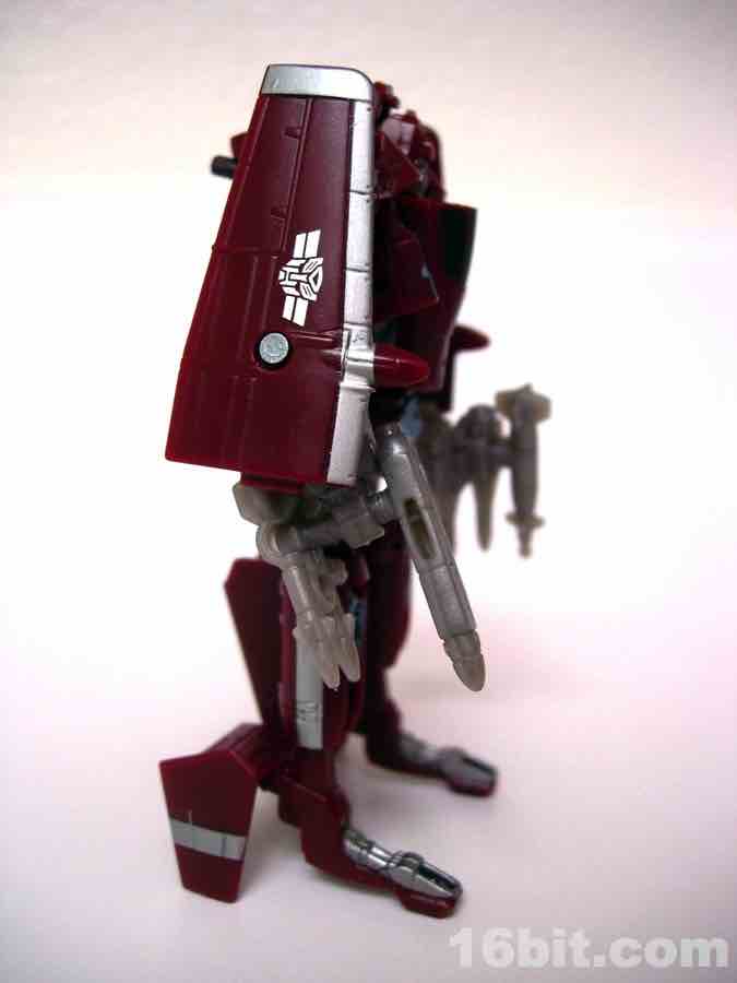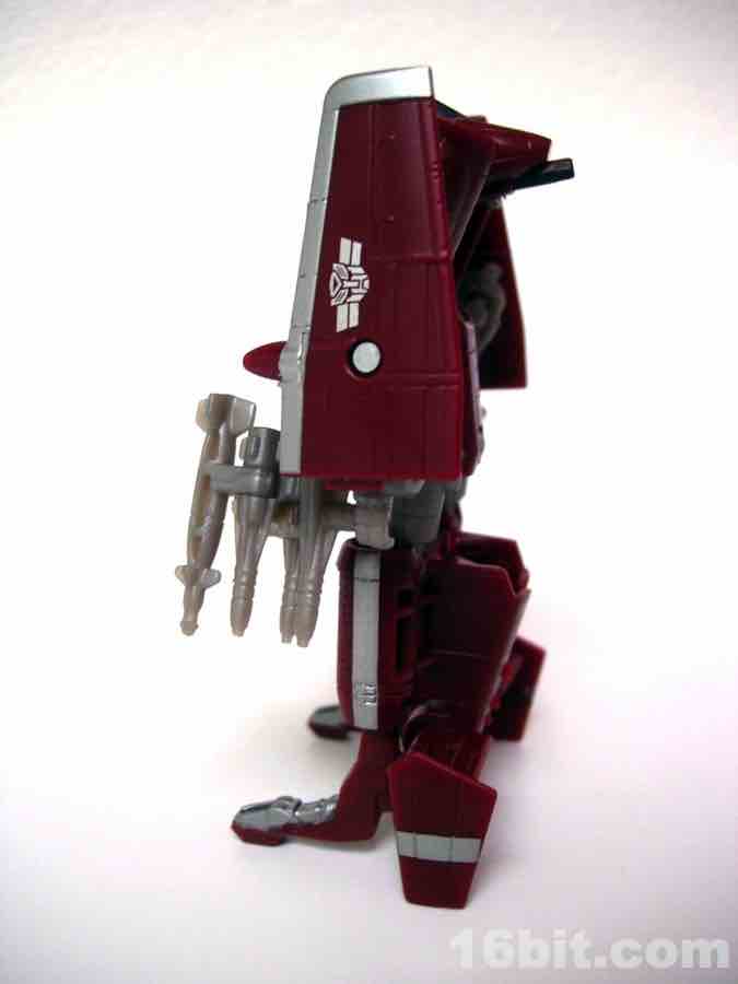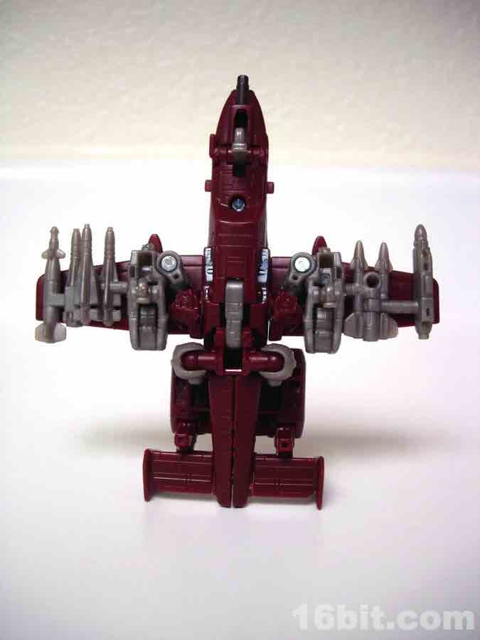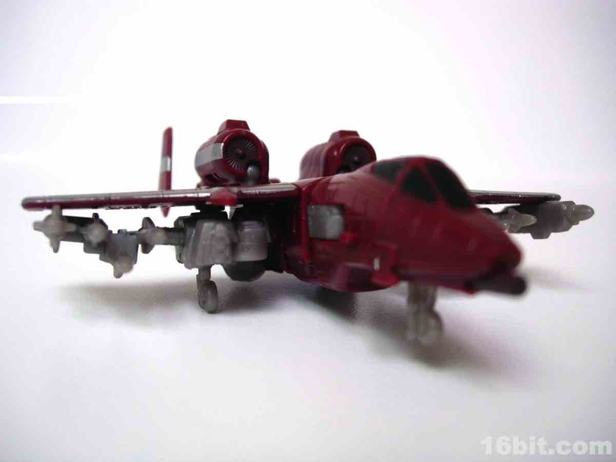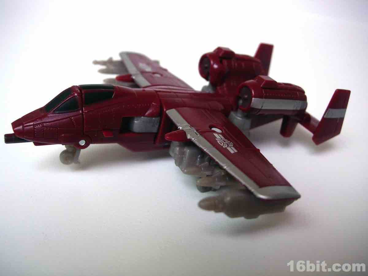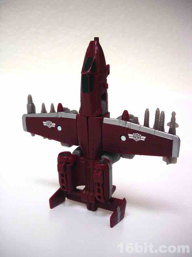 The plane mode looks a lot like an A-10 Thunderbolt colored to match the previous Wal-Mart exclusive Powerglide from 2009. There are some neat silver designs on his wings, including stripes to make the plane go faster, which should do well for everybody.