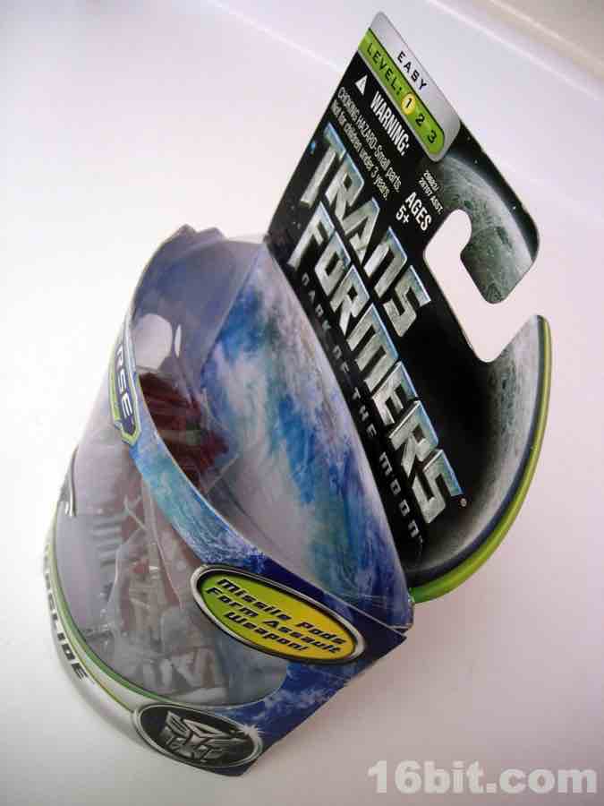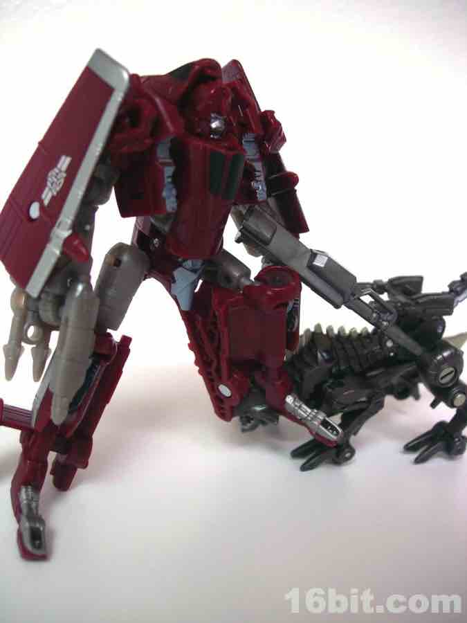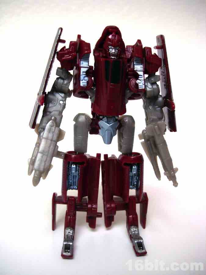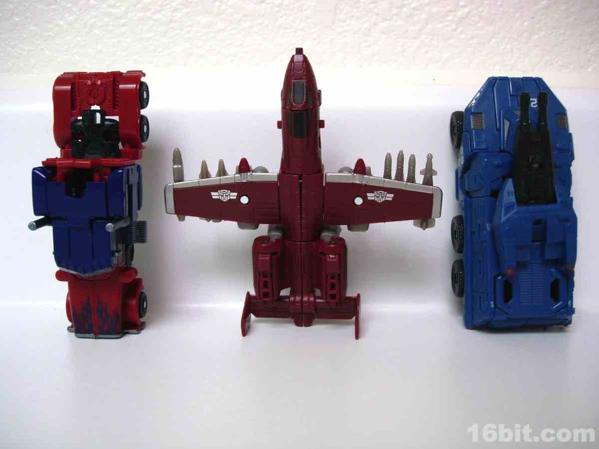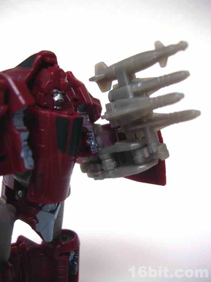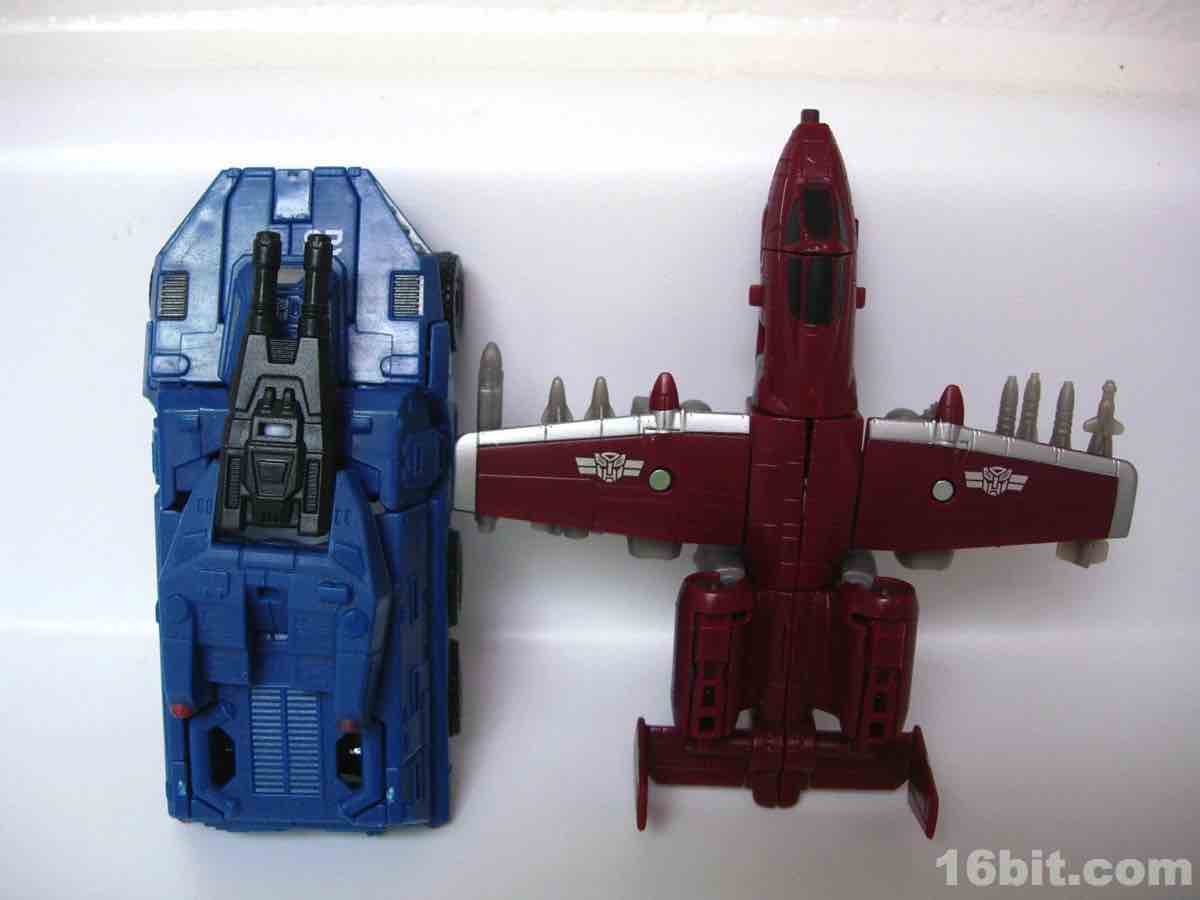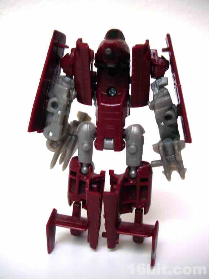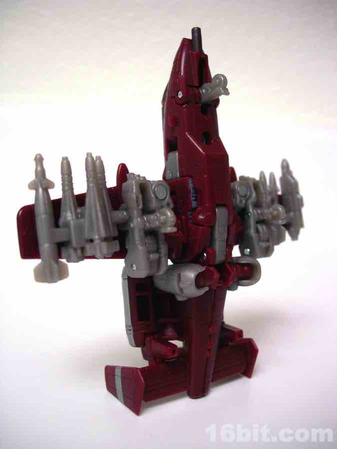 The plane mode looks a lot like an A-10 Thunderbolt colored to match the previous Wal-Mart exclusive Powerglide from 2009. There are some neat silver designs on his wings, including stripes to make the plane go faster, which should do well for everybody.