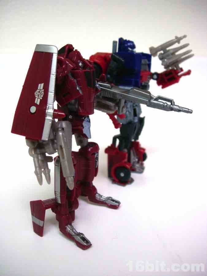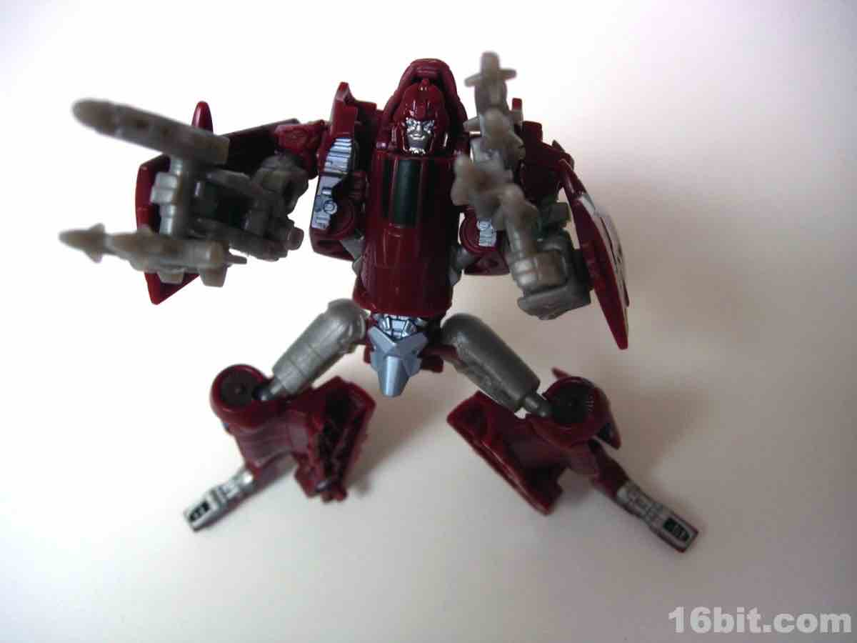 As a robot, he's a mixed bag-- the head is decidedly old-school, and I appreciate that. The legs feel like a random smattering of parts, particularly the feet. This is one of the things I disliked about the movie, as I actually always liked the more durable looking and incredibly blocky look of the original toys. Still, the new one stands fairly well, and the ball jointed hips are solid enough to keep him standing upright. With jointed knees and elbows, there's not a whole lot to complain about, but it does feel a little kibbly in places with wings and other plane parts getting in the way of some movement.
