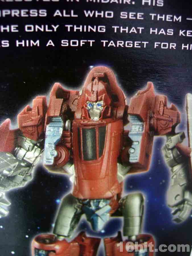Part of Hasbro's Cyberverse line, the toy is essentially a slightly larger "Legends"-class toy. It's small, thin, has a few awkward points, but is a pretty decent small-scale item for kids and collectors-- it's also one of very few original characters to appear in Cyberverse and, according to most sources, not the movie. The plane is the same size as your average Scout-class toy (previously "basic") with fully retracting landing gear-- a nice touch at this scale. The weapons under his wings are removable, and fold into hand weapons. He can't hold them both particularly well without posing his wrists oddly, but hey, at least his wrists are jointed for the transformation. But I digress.