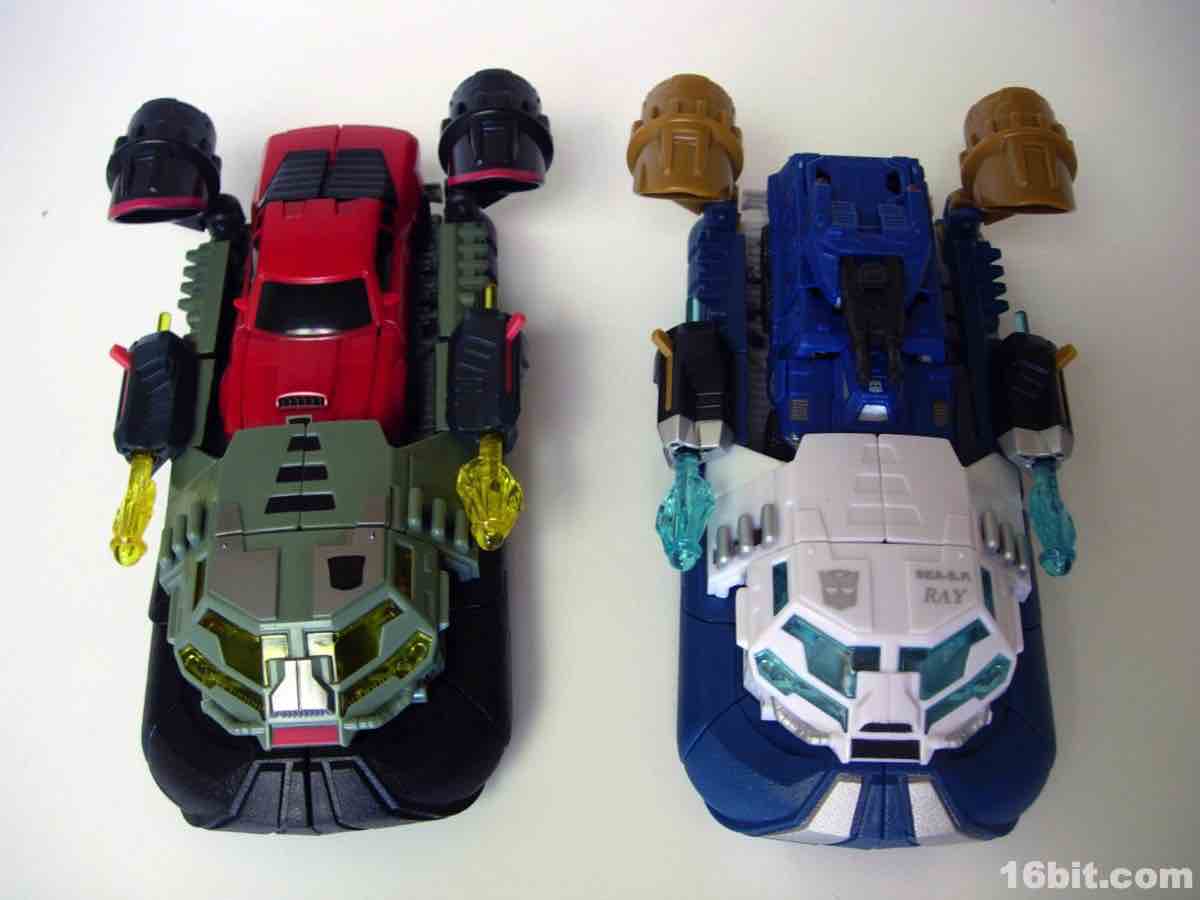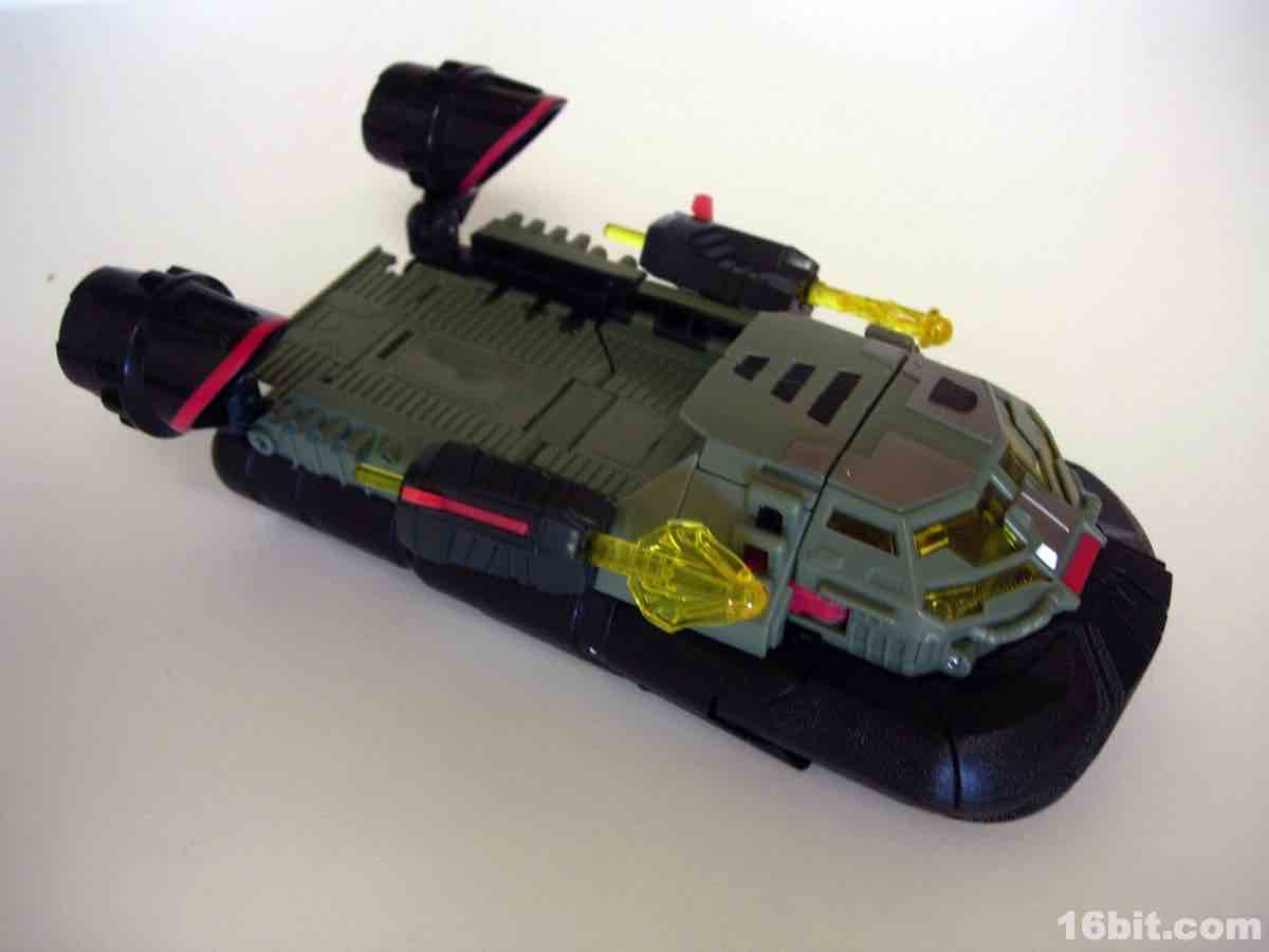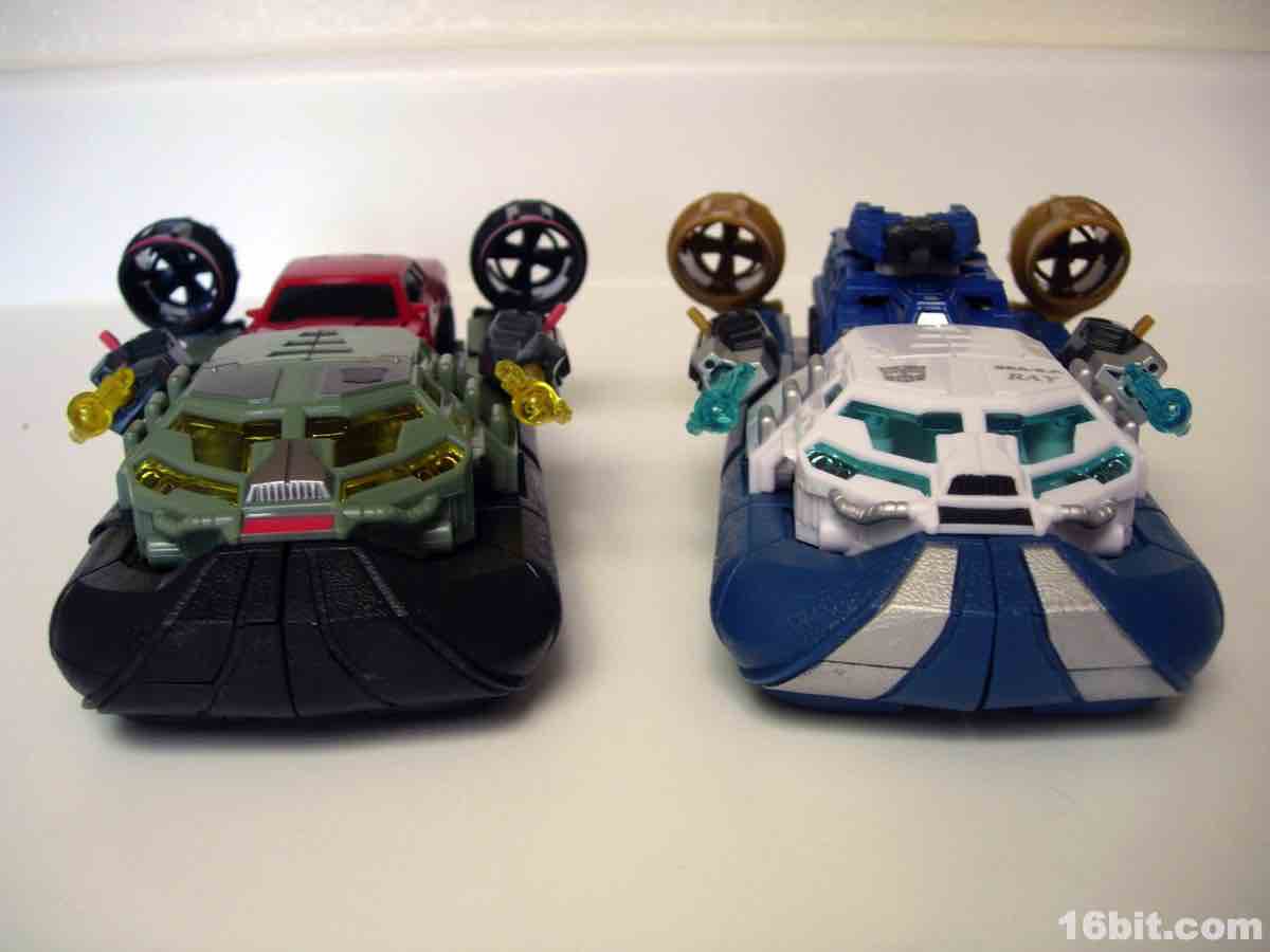 Not being one to waste molds, Hasbro quickly repainted its 2010 Sea Spray toy in very dark colors, with grey, more grey, a little yellow, silver, and some more grey to bring you the new character Deep Dive. (Or maybe it's more of a green. Whatever. It's murky and swampy.) Some saw the coloring as a reference to the G.I. Joe Killer W.H.A.L.E. toy and... eh, maybe. They're fundamentally different kinds of aquatic vehicles, while both are hovering vehicles with big fans on them, one is more of a troop transport and the other is a vehicle transport. Deep Dive retains the little wheels on the bottom of Sea Spray and the same basic mechanisms, although he's a little stiffer and some elements of the transformation process border on stressful, in all senses of the word.