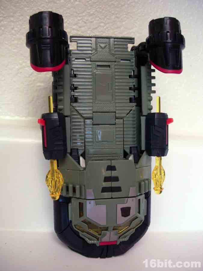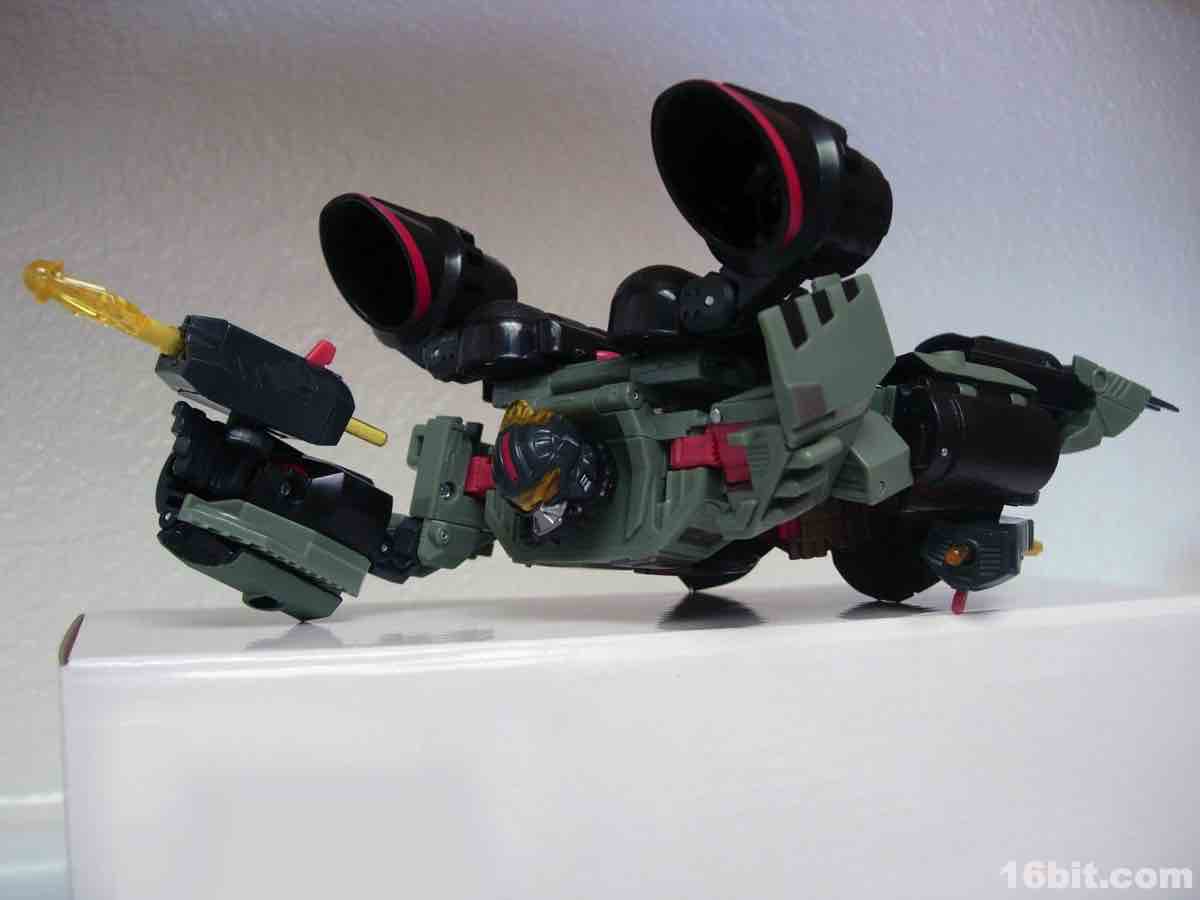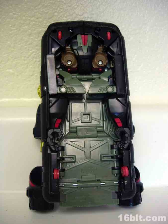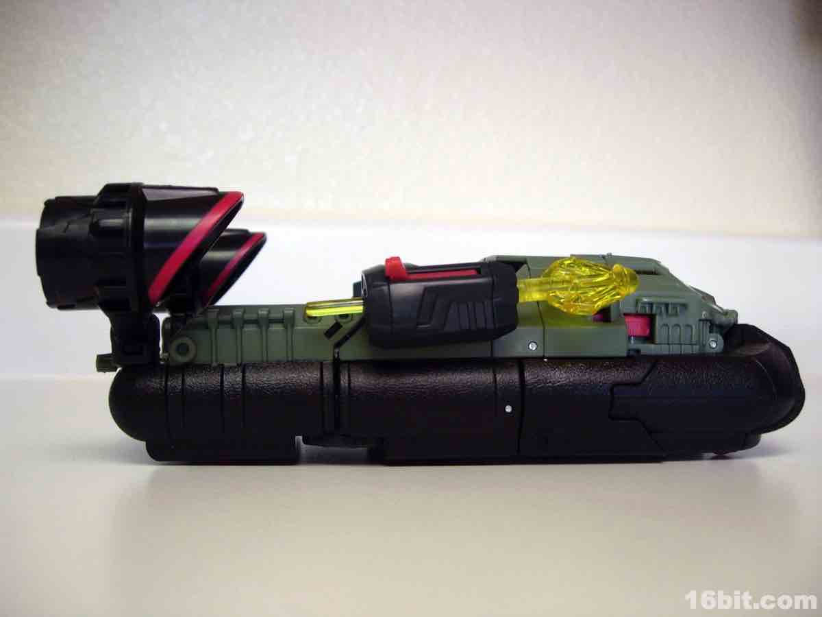 Not being one to waste molds, Hasbro quickly repainted its 2010 Sea Spray toy in very dark colors, with grey, more grey, a little yellow, silver, and some more grey to bring you the new character Deep Dive. (Or maybe it's more of a green. Whatever. It's murky and swampy.) Some saw the coloring as a reference to the G.I. Joe Killer W.H.A.L.E. toy and... eh, maybe. They're fundamentally different kinds of aquatic vehicles, while both are hovering vehicles with big fans on them, one is more of a troop transport and the other is a vehicle transport. Deep Dive retains the little wheels on the bottom of Sea Spray and the same basic mechanisms, although he's a little stiffer and some elements of the transformation process border on stressful, in all senses of the word.