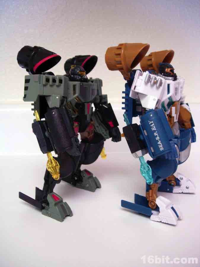 In robot mode, his "Reveal the Shield" sticker appears on his chest, much like how Sea Spray's symbol (and name) appear on his torso. The character gains more color in the robot form, with red paint and plastic becoming visible as well as his bright yellow eyes. The firing rockets can be mounted to the bottom of his forearms, or held in his large and open hands. My favorite feature about this guy are his flip-out swim fins. It's so ridiculous that a giant robot would need little flippers on his feet, but it's adorably goofy and so endearing that it's almost sad these guys didn't get a shot at TV stardom in the cartoons or in the comics.