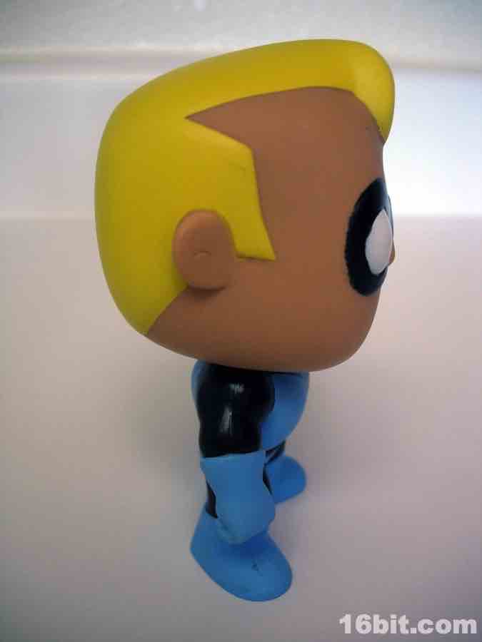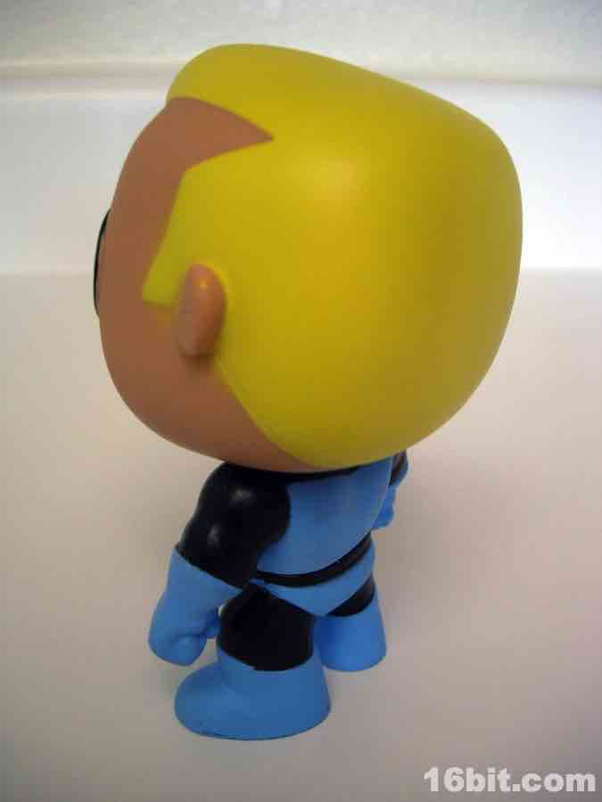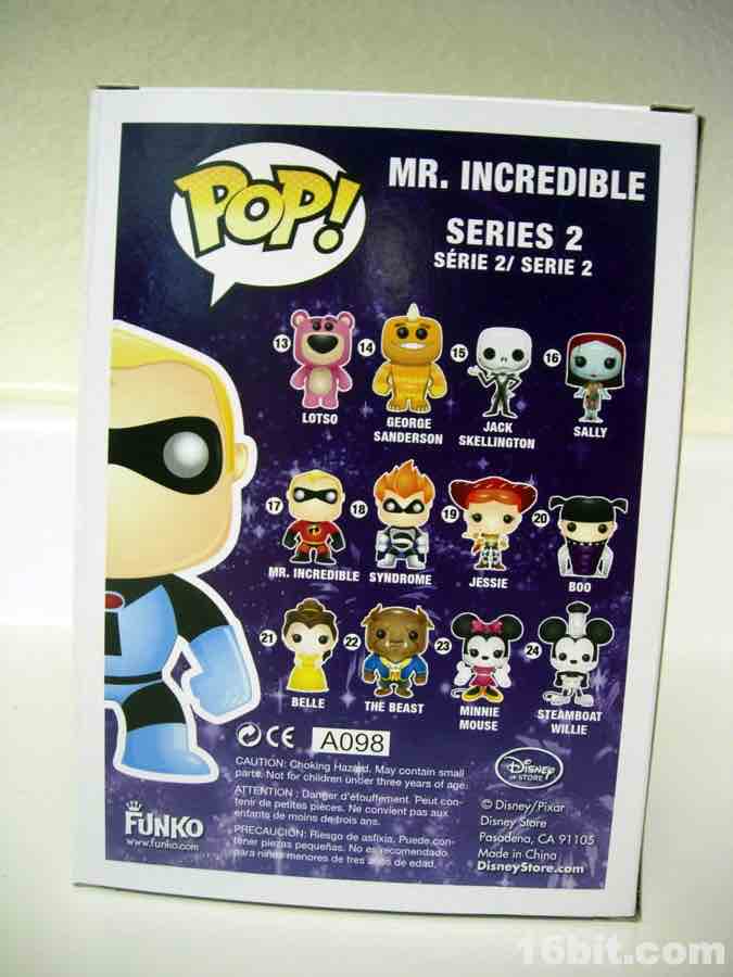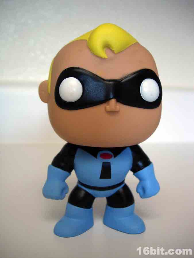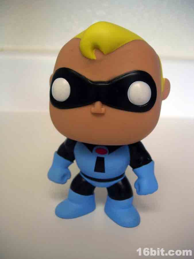 The 4-inch figure has an articulated head and while he lacks the long, strong chin of the movie design he does retain the mask, nose, and "classic" Mr. Incredible outfit in blue and black. The store version should be red and black, consistent with the rest of the family and his own "new" uniform from later in the film. This hobo suit sports the distinctive curl of blonde hair and the big red dot over the "I" on his chest, and he has an exquisitely-sculpted nose. Most figures in this line drop the noses, you'll note that his box art lacks this feature.