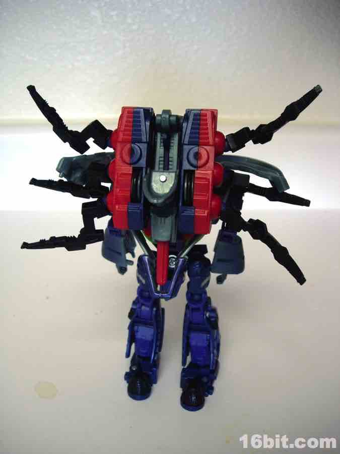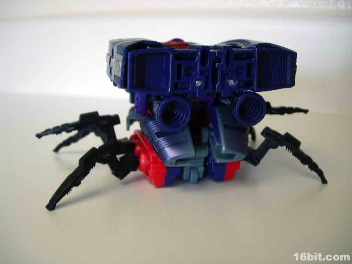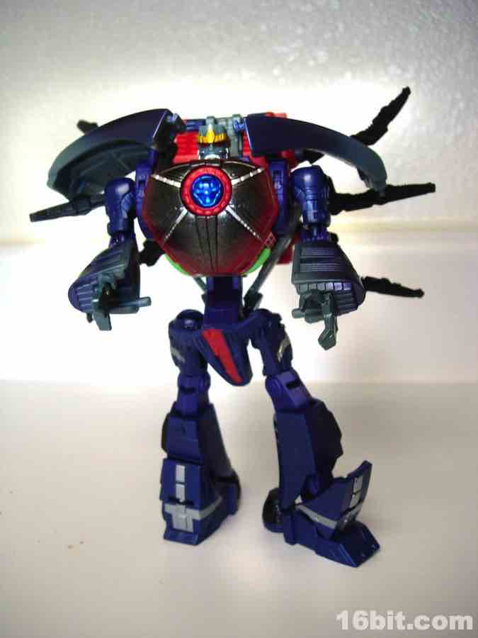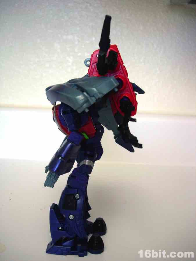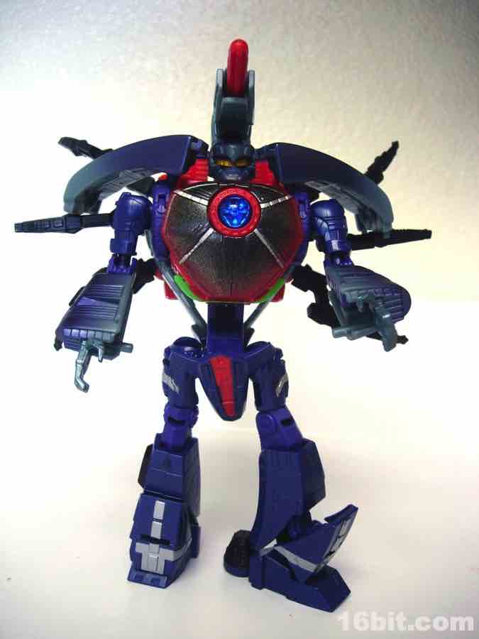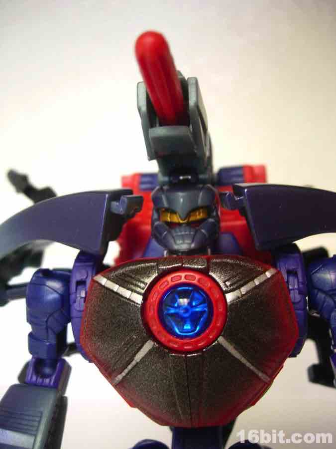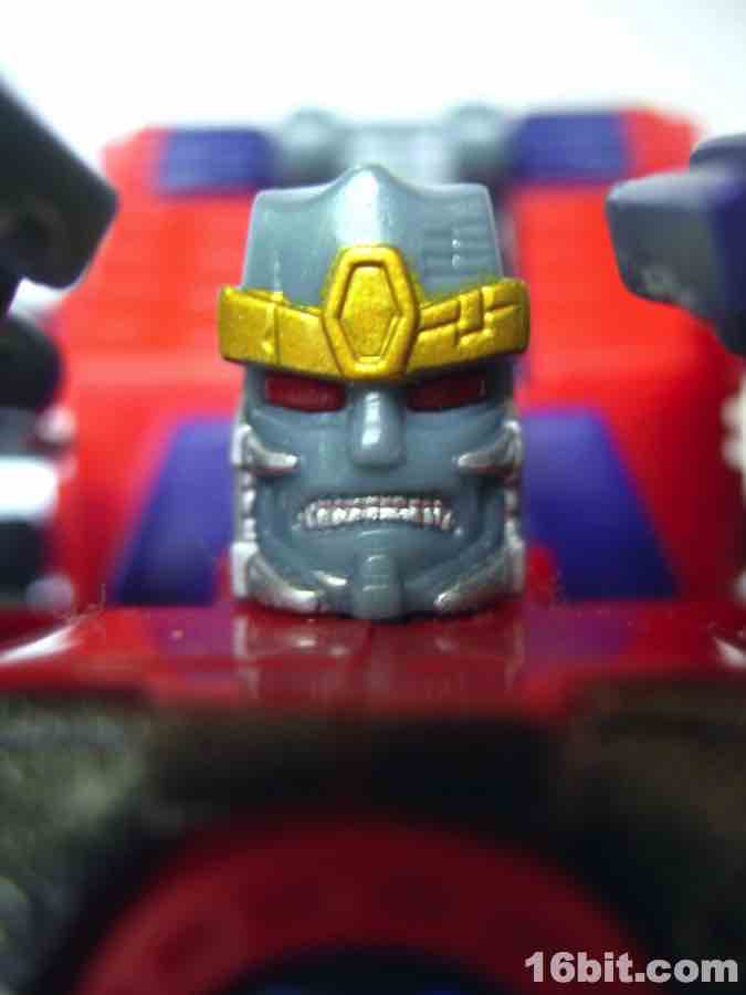 The articulation in robot mode is quite good, and the arms and legs are worth noting for their nifty design incorporating plates and panels without appearing overly kibbly. Little jet engines become heels, and parts of the side of the "giant head" face become armor on his feet. With roughly 15 points of articulation, most of which being in the legs, it's a quality piece. The metallic purple paint, bright red, and pale blue are nicely offset by additional deco details like the gold crest on his head or the Megahead mode's cripplingly bright green eyes. Heck, the robot mode even has sculpted teeth, painted white in a menacing grimace befitting of a crazed robot terrorist which conquered an entire planet and stripped its residents of their bodies. (Beast Machines is, at is core, actually quite grim.)
