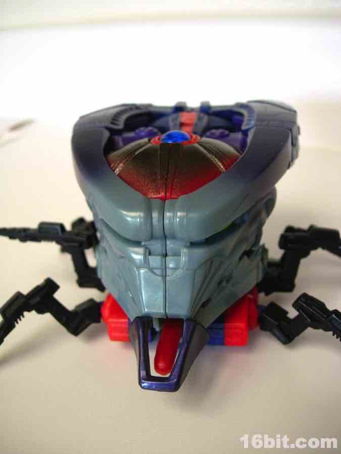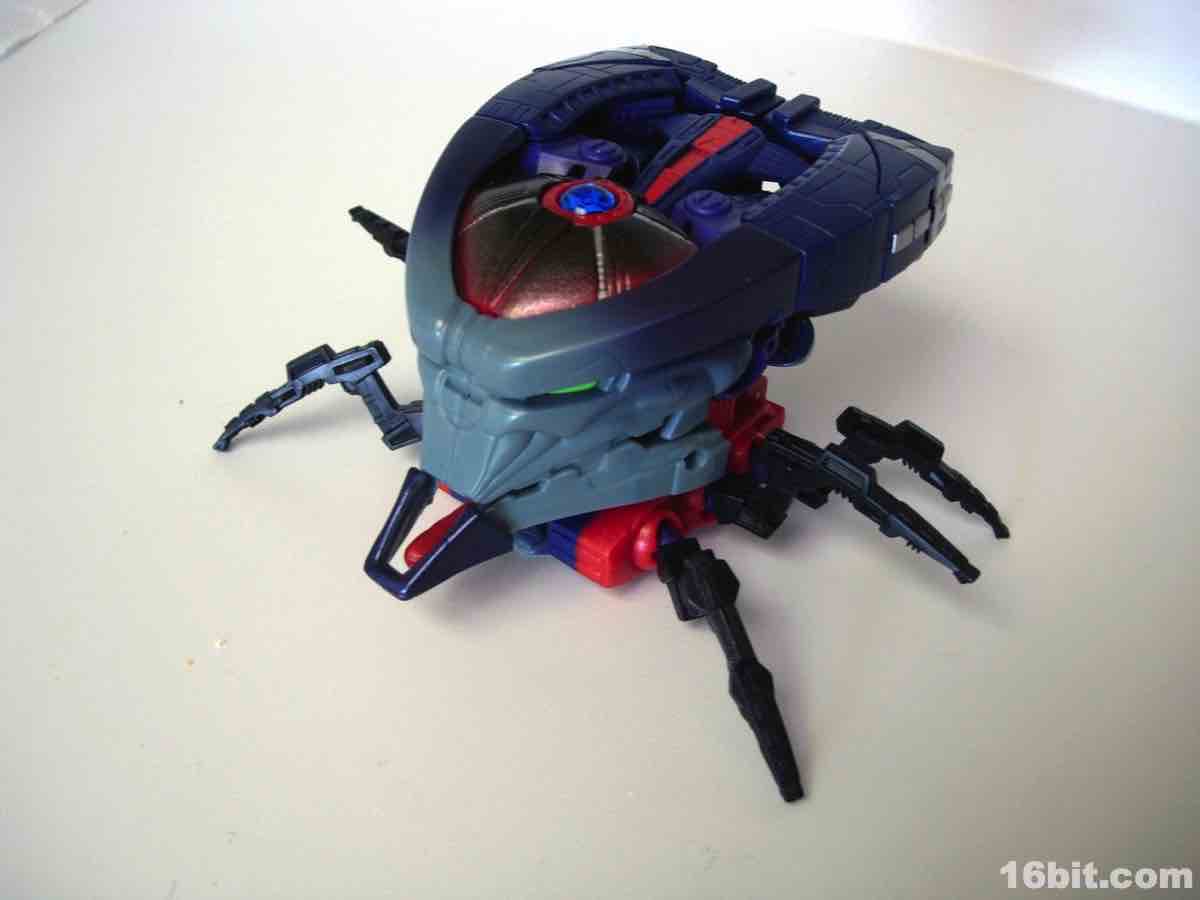 The robot mode is more similar to his previous form, but it's still vaguely accurate to the TV show. (The Japanese release, naturally, was the one that got it best.) In head form, the thing rolls around and has moving legs. It also looks weird, plus has a hint of overly bright colors which served as a trademark of toys in the 1980s and 1990s, a sign that the thing you're playing with was designed for a young audience. It's essentially a WYSIWYG form, so if you don't like the look of it, well, it sits there and looks cool. There's also an exposed Vehicon Spark Crystal on top, which was a common feature in the later Beast Machines toys frequently used to activate whatever action feature the toy may have. (In Megatron's case, it reveals a rocket launcher in his robot form.)