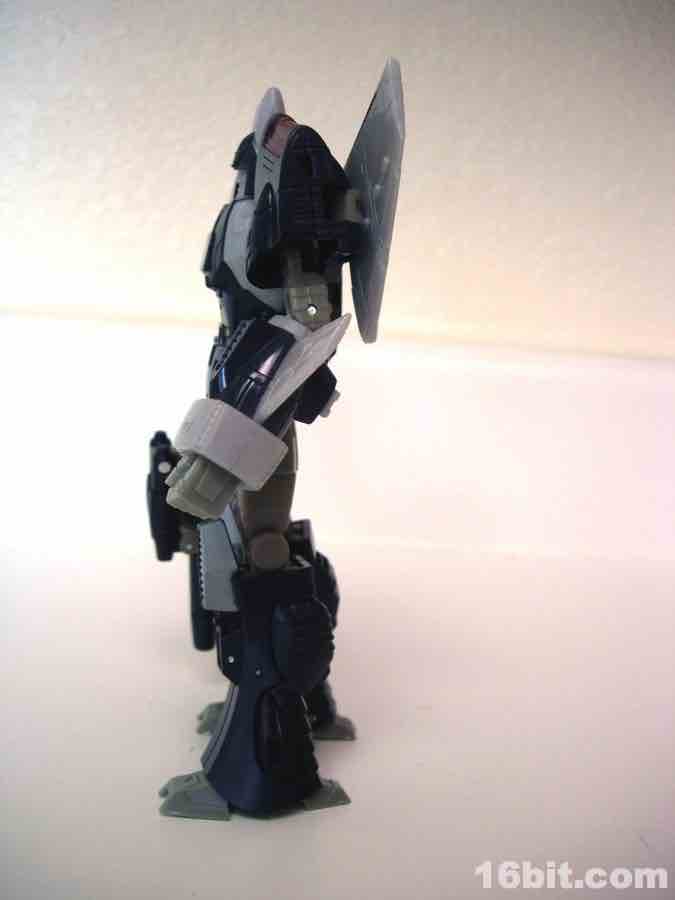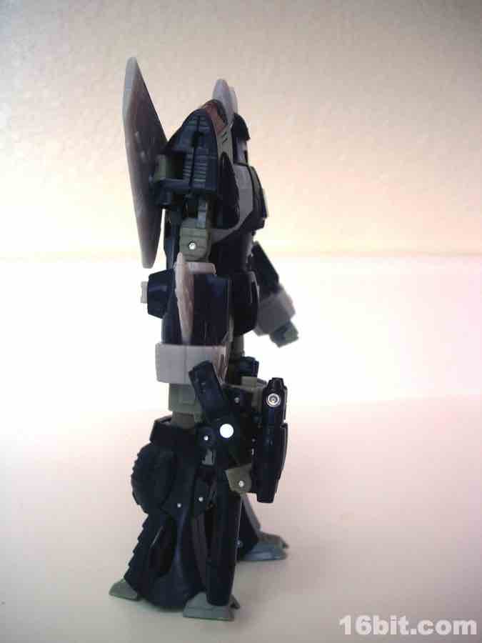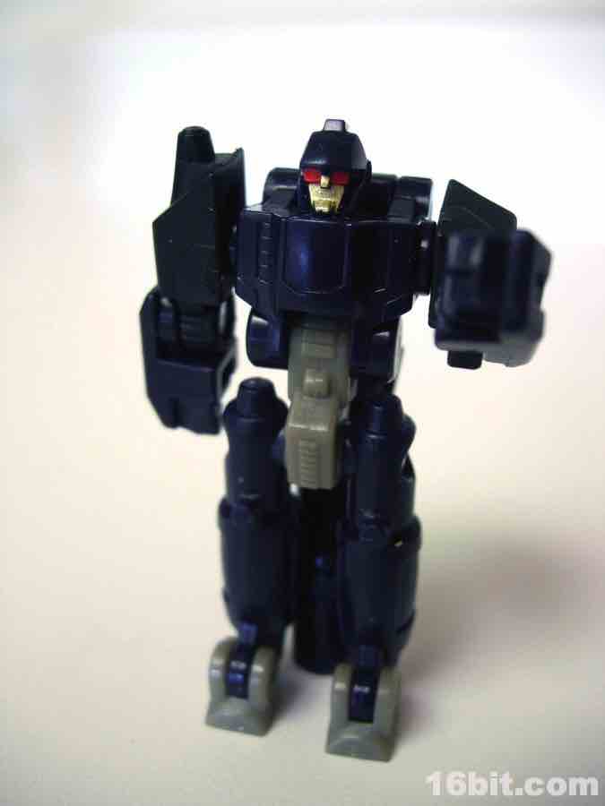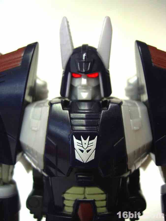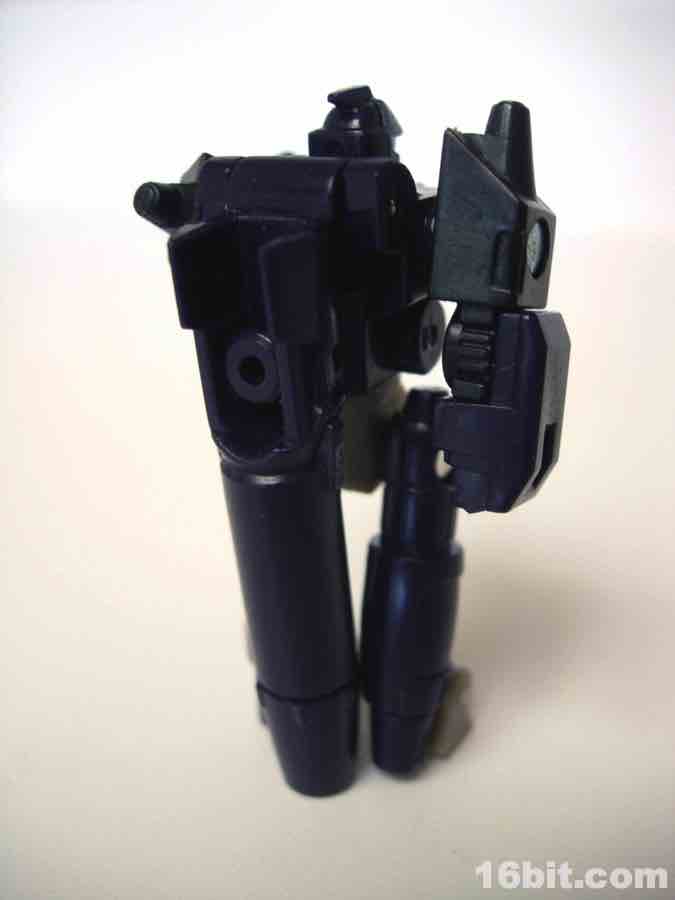 His red eyes glow nicely given a proper light source, bringing life to an otherwise bland face. The sculpt is actually quite nice, but certain colors of plastic-- quite often bright colors and greys-- tend to do a good job at making it tough to see some of the facial features. (Painting it usually fixes this, as can be seen on the rereleases.) Also, the silver Decepticon logo may float your boat, but I have a soft spot in my heart for the rubsign or a purple painted symbol. It stands out better than either of those, but sometimes old school wins out simply because it's familiar and not necessarily as mind-blowingly striking as the silver one. Depending on how you want to count, this 6 1/4-inch figure has north of 13 points of articulation.