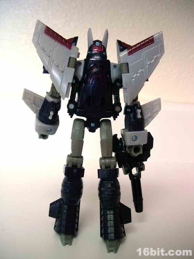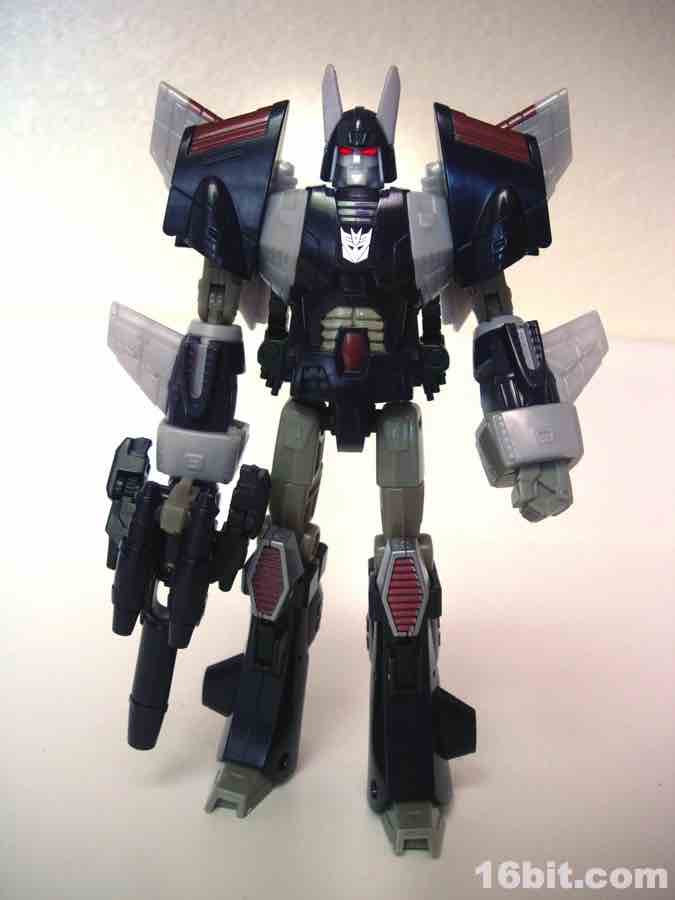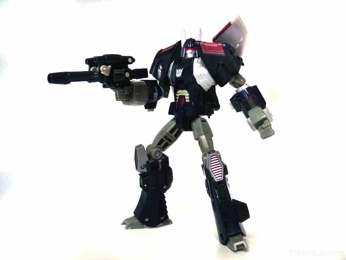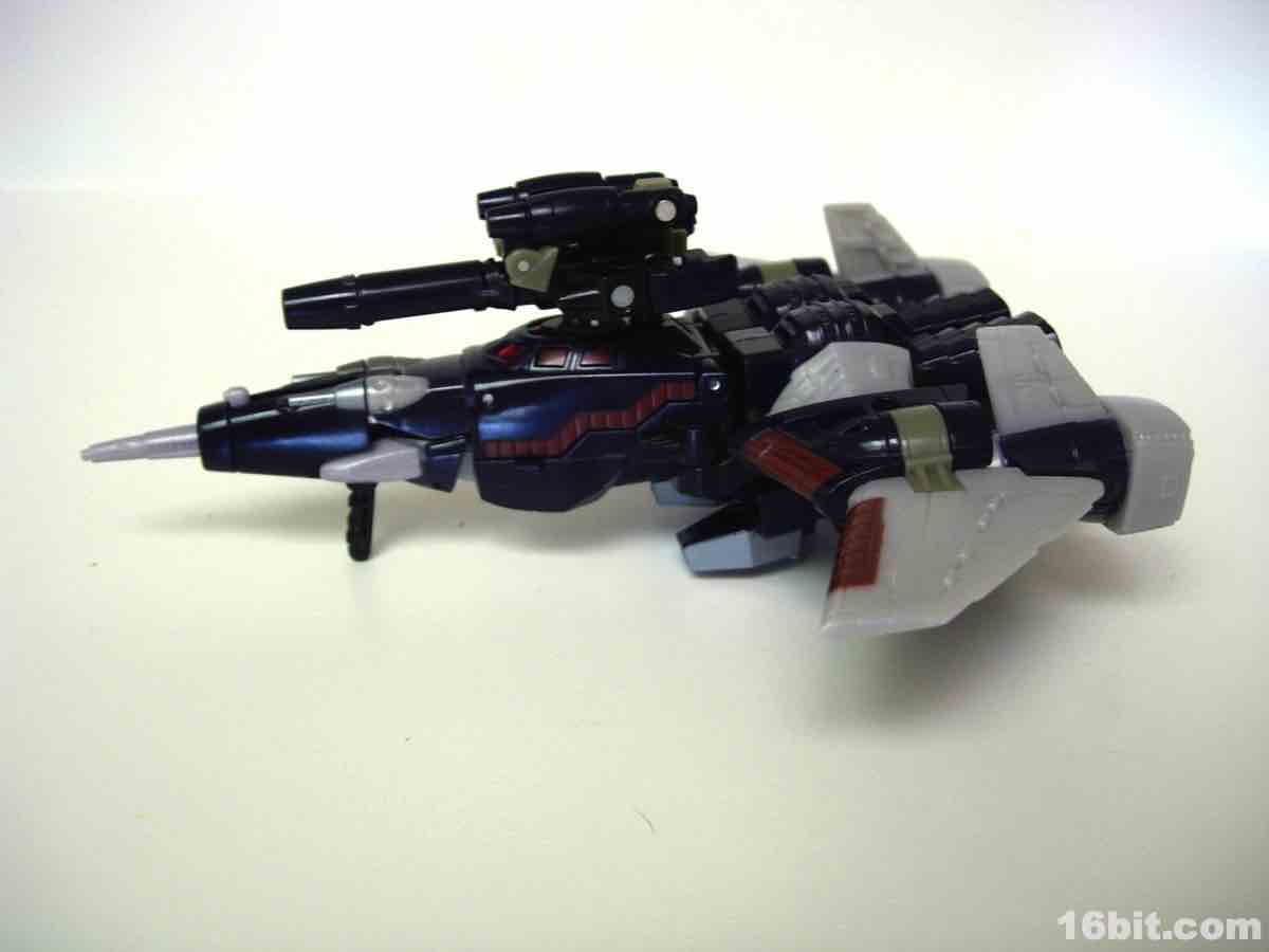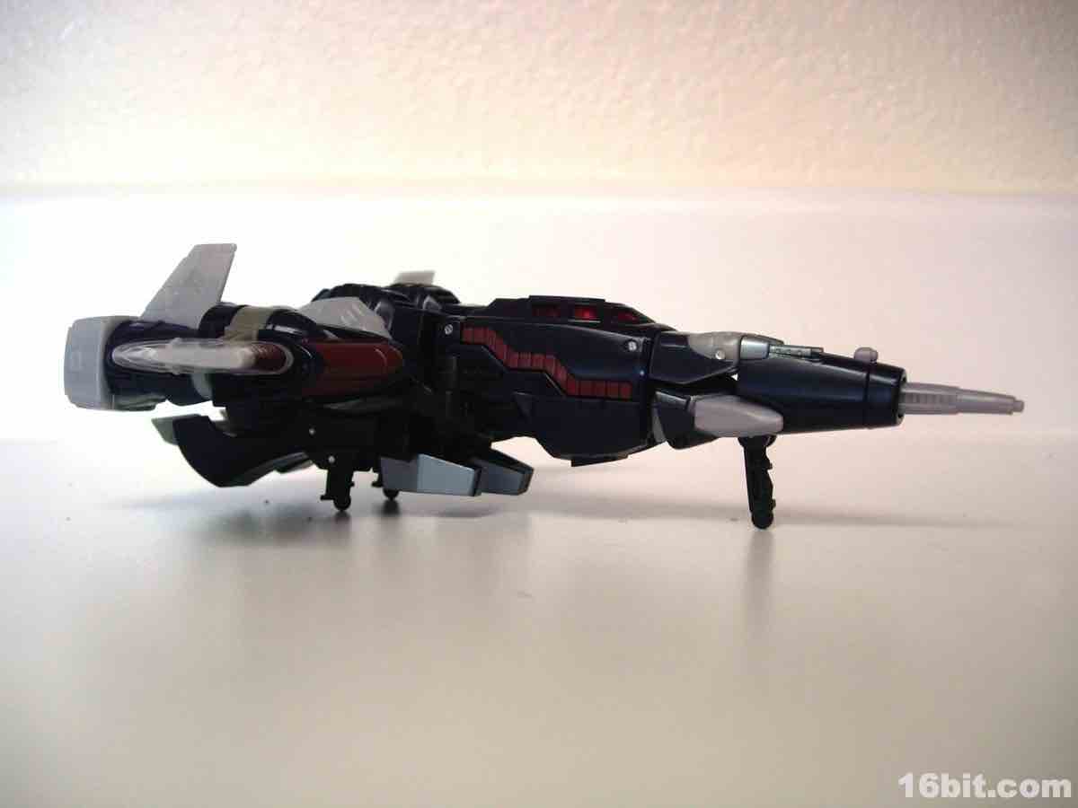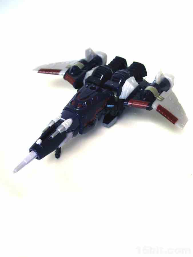 If you like this mold as much as I do, take note, there are tons of releases. There's this one, the HenKei Japan release with metallic wings, the China Universe release, the Reveal the Shield 2-pack release, the Transformers Collectors Club Shattered Glass release, and another Japan-only repaint as the Autobot character Strafe. It's too bad Scourge isn't getting that kind of attention, you could use an army of that one. In early 2011, Japan got a clear purple version in a 3-pack with Galvatron and Scourge. There's one more special version: the pre-release photography showed a slightly different production deco with more grey plastic, which shows up on the nosecone of the vehicle mode and the Targetmaster Nightstick figure. Few (if any) actually shipped to US stores with this variant, which was famously shown in official Hasbro product photography. I've seen a few in private collections, so some definitely got out somehow.