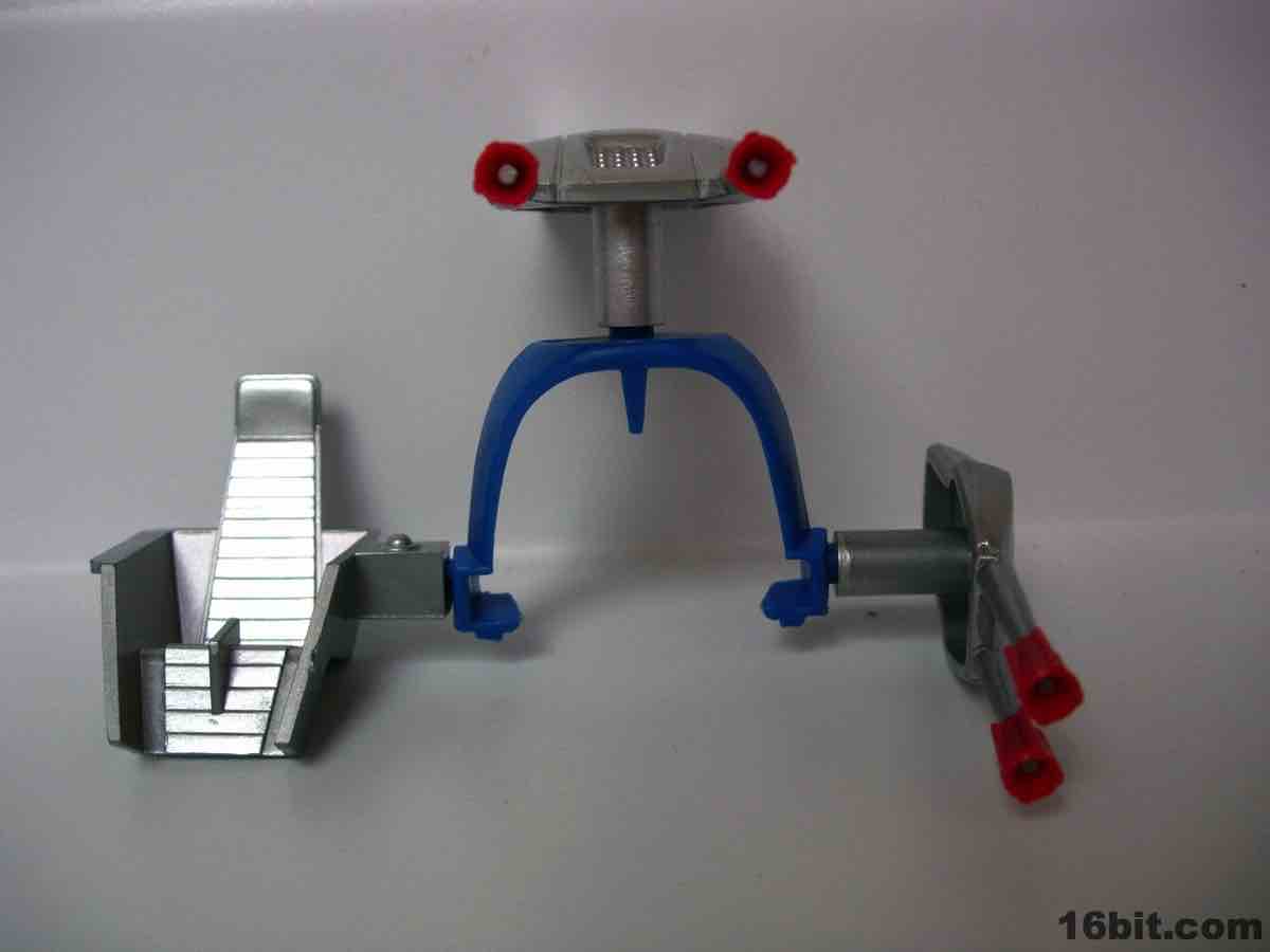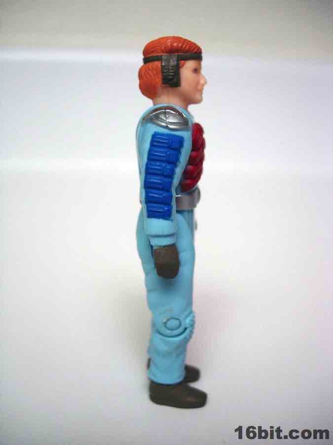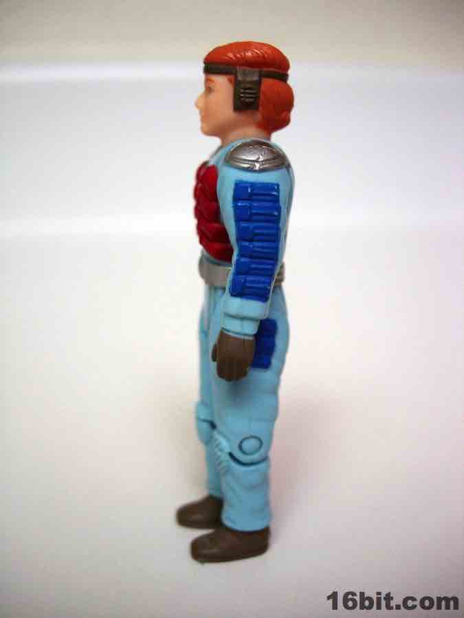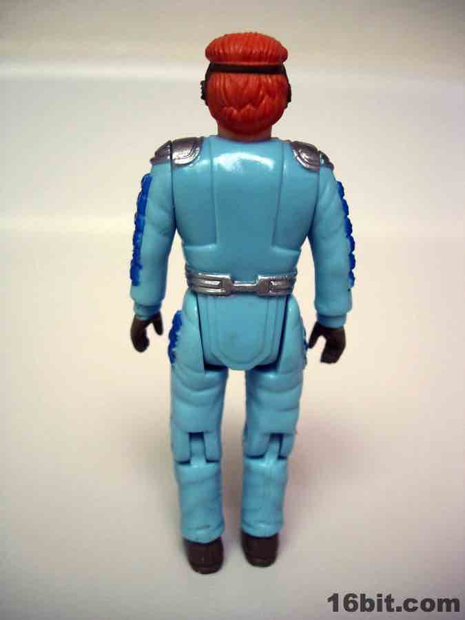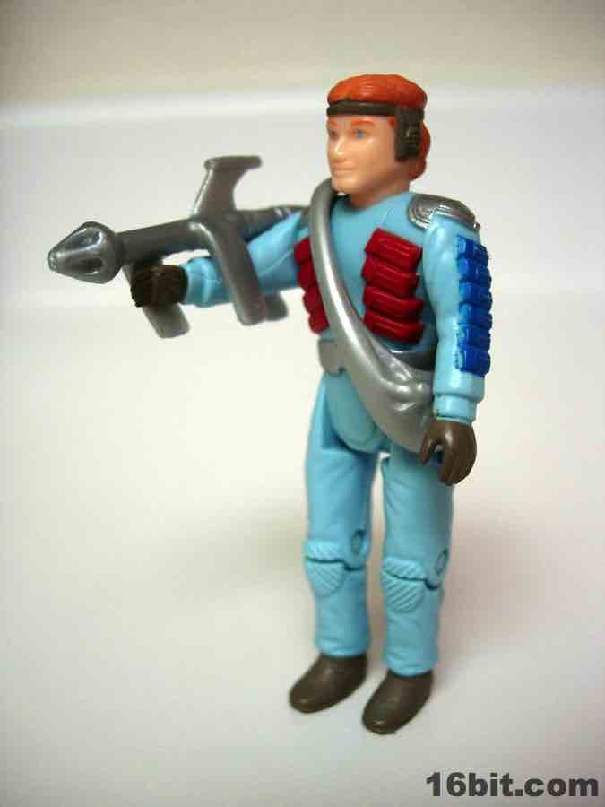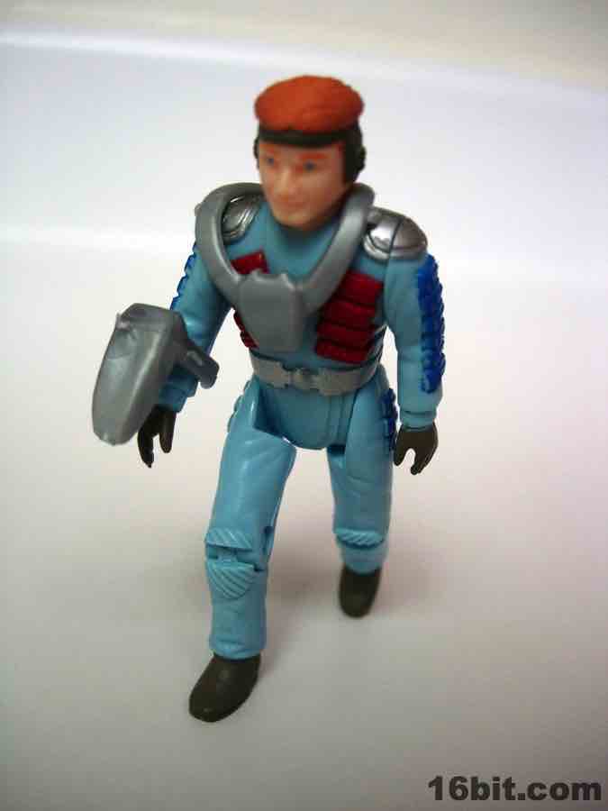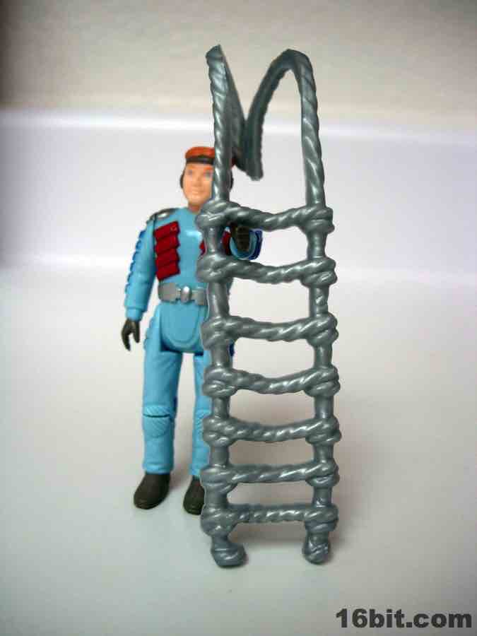 Turret has orange hair (the Japanese release has black hair) and pretty good articulation. Much like M.A.S.K. and Starcom, the figure has 7 points of articulation-- the basic 5 of the 1980s (neck, shoulders, and hips) plus knee joints which were increasingly common on the smaller-scale figures which were packaged with vehicles in the late 1980s. With a slightly oversized head and a nicely detailed outfit, the baby blue costume had added silver, red, blue, and grey bits to bring it to life. The headset matches the boots and gloves, and naturally, it looks ridiculous as any good 1980s toy should. The figure won't amaze you and his hands are not sculpted to hold weapons, so his guns (which were the same as all good guy sets and cut from a plastic tree) just clipped on to his arms. His various necklaces and pouches also just hung on his body, but I can't say I entirely get why this set required a silver ladder accessory. It's here but too large to be genuinely useful.