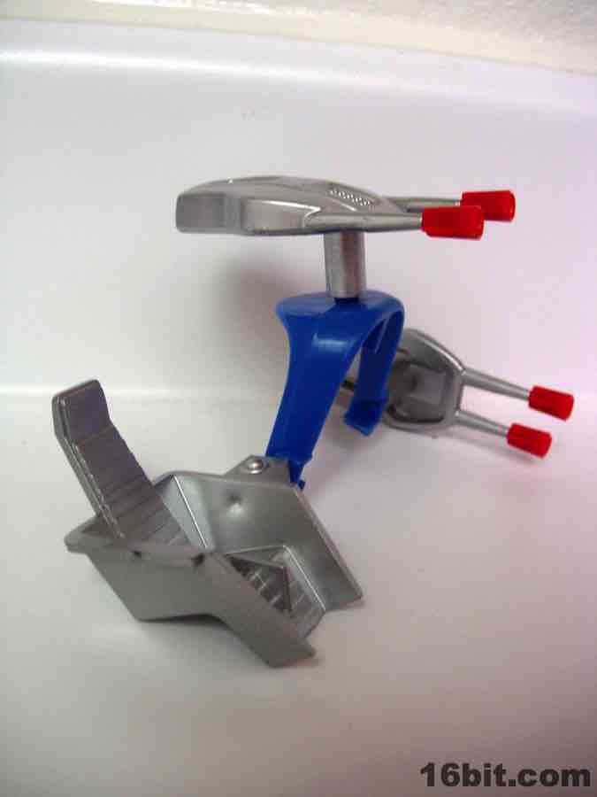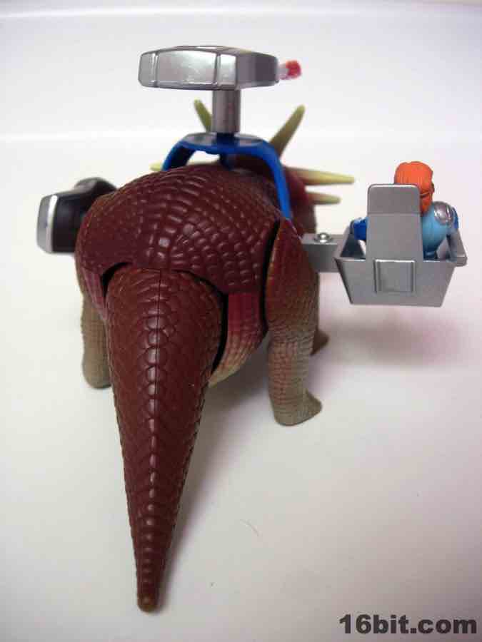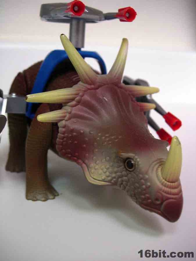 Unlike real life, this guy could have a giant harness fitted on his back with a chair and two big silver guns. When I pulled this set out to review, an onlooker asked "Is it supposed to look like that?" Yes, yes it is, and it's awesome. The blue harness has little tabs which peg into holes on the side of the dinosaur, locking into place. The silver chair and two cannons are actually painted silver, which is a mixed blessing: they look gorgeous, but they can get scraped up easily with age. The red cannon tips are removable, and are frequently lost or broken on most samples. The guns are jointed, so you can rotate them to point at things, while the seat just stays there for your action figure. And in this case, the guy's name is Turret.