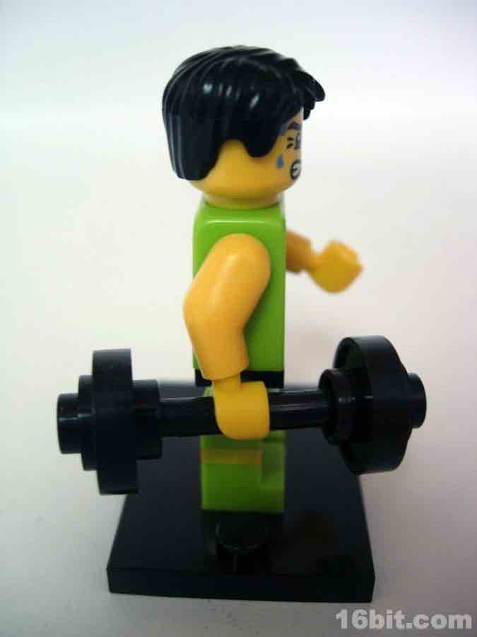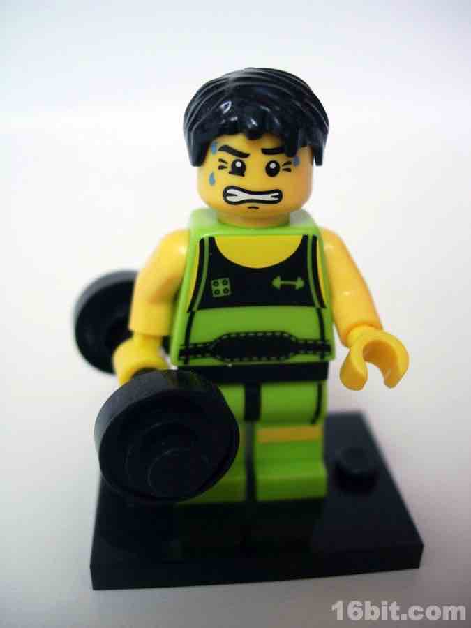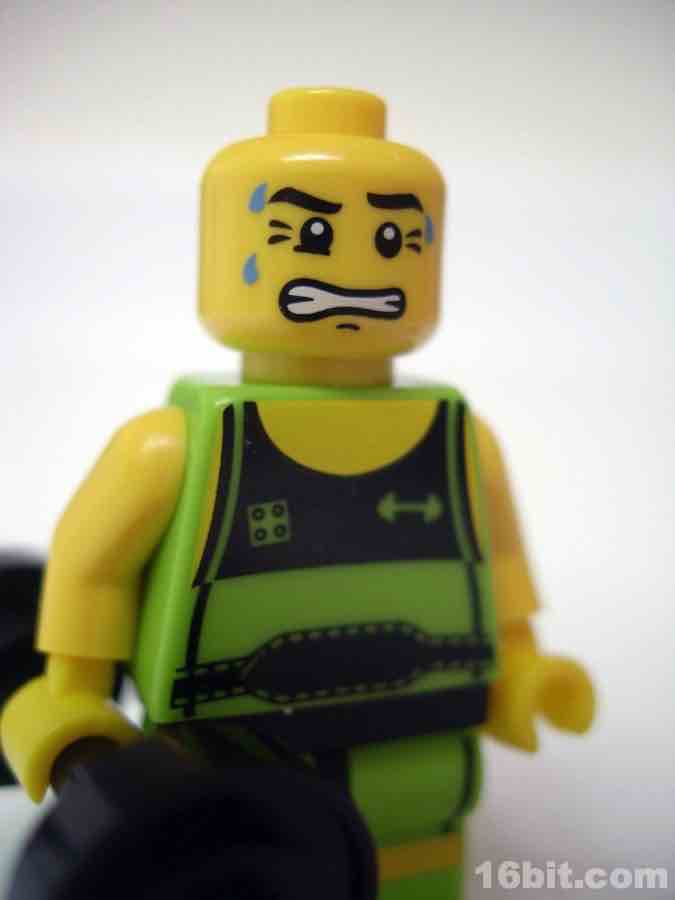 I'm not going to lie to you-- I was not excited at all about the prospect of a LEGO Weightlifter at first. Some dude in some workout clothes? And only one weight to lift? Dull. He has a fairly ornate outfit with bright colors, and while I can get behind neon green there's one feature I particularly loved about this figure once I got my hands on it-- the head!