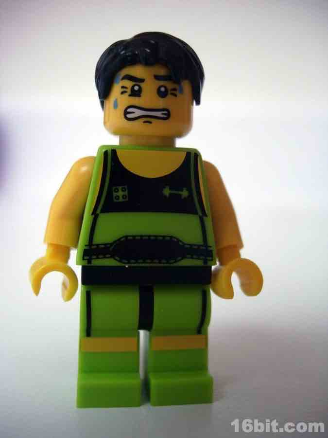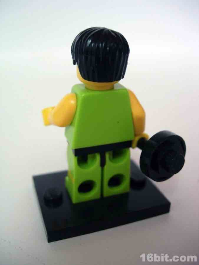 The figure's look is normal LEGO fare-- no nose, yellow face, standard articulation. His workout outfit is pretty interesting though-- on his right is a tiny 2x2 LEGO brick for some reason, and on his left is a replica of his weights. A little bit of yellow is splashed on his chest and part of where his arms go to further give him a little more skin, but the bulk of the figure is green and black. To give the illusion of shorts, much like on the cheerleader, some yellow stripes were added to his legs. A nice touch. While I wouldn't suggest tracking this one down for his own merits, this figure's head is reason enough to get one. If you're ever planning on doing a LEGO bathroom in your town, how can you possibly resist picking up this one?