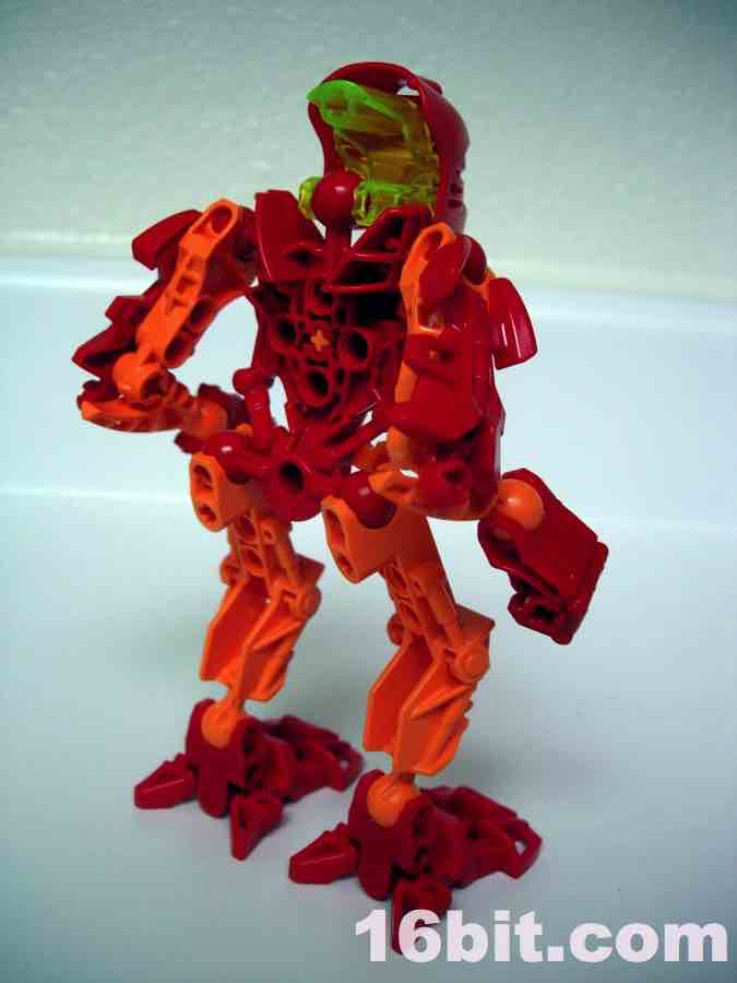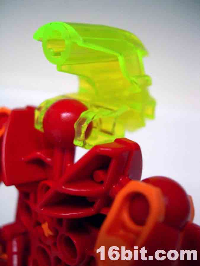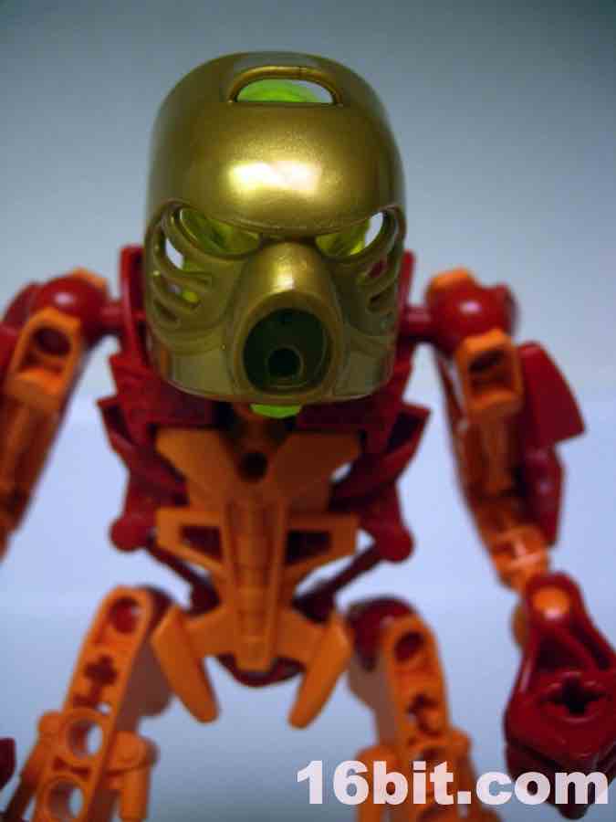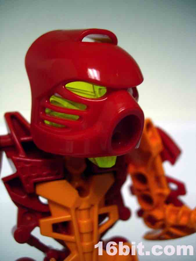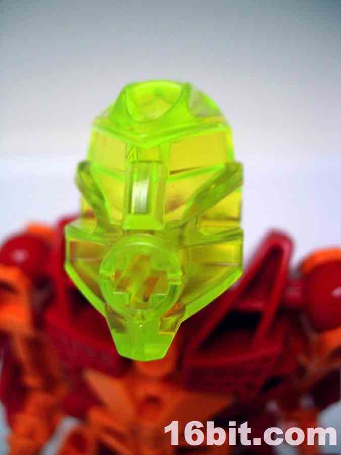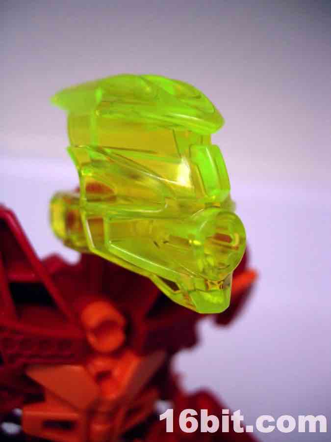 LEGO Bionicle Stars 7116 Tahu Action FigureWhile retaining the original toy's orange and red color scheme, Tahu's eyes are now green instead of red like the original. It looks good but it also means his entire head under the mask is green, and that's tough to photograph well. Many of the parts are repurposed from existing sets, the body is mostly recolored parts from Glatoran sets, the sword is recycled, but most surprisingly is the mask-- it's a new mold. The mask it a little longer in the back, has a cross rather than a circle where it connects to the head, and barely (but not really) fits on the original Toa heads. Basically, it'll fit, but it starts to slide off on its own due to plastic tolerance issues... it squeezes itself free.