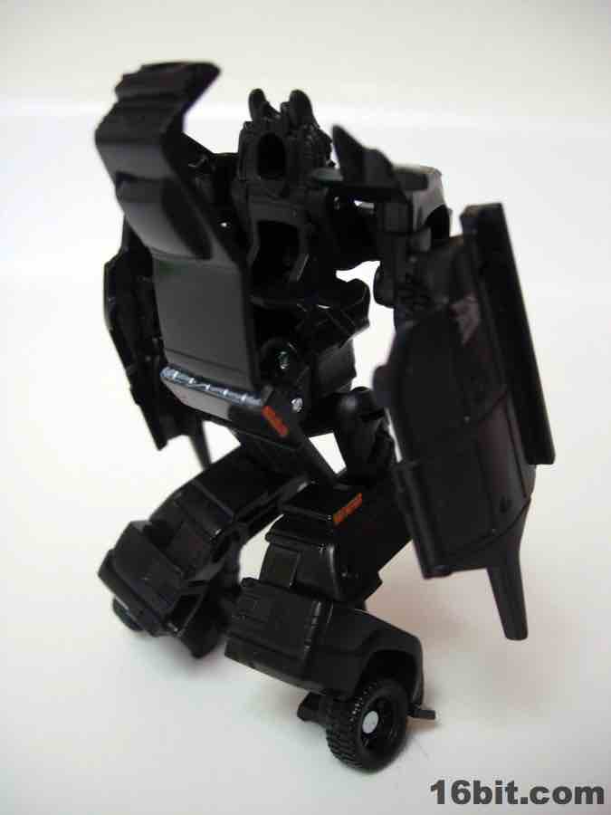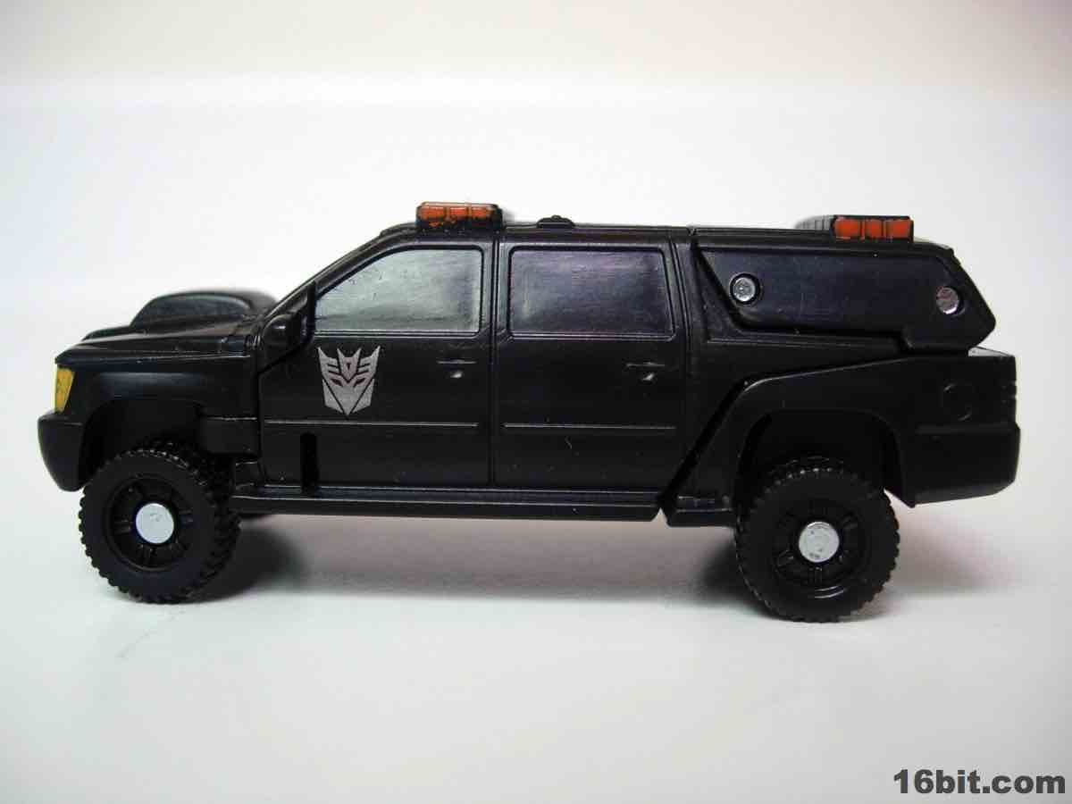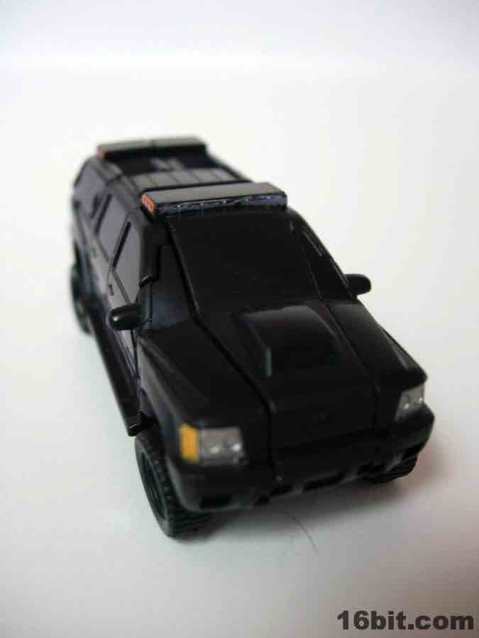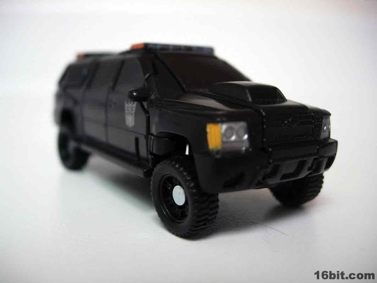 The vehicle is Chevorlet's Suburban, so now you have an evil spy robot in his own nondescript black van. Really, that's about perfect. The paint detail is a little weak-- the orangey lights on the roof on the sides is pretty sloppy-- but there are headlights, a Decepticon symbol, and even little yellow lights where the turn signals presumably are. It's a nice car, nothing supremely cool or weird unfortunately, so I wouldn't suggest picking this one up just because the Chevy Suburban is some amazing piece of automotive engineering. The toy is pretty solid, the wheels roll freely and nicely, and this is one of the better toys in this scale I've played with as of late. For $5, it seems a smidgen small, but that's true of the entire line. If you have a few bucks burning a hole in your pocket and love small toys, this is a worthwhile purchase. (The deluxe-class toy, though, is only twice as expensive at retail and is significantly more impressive.)