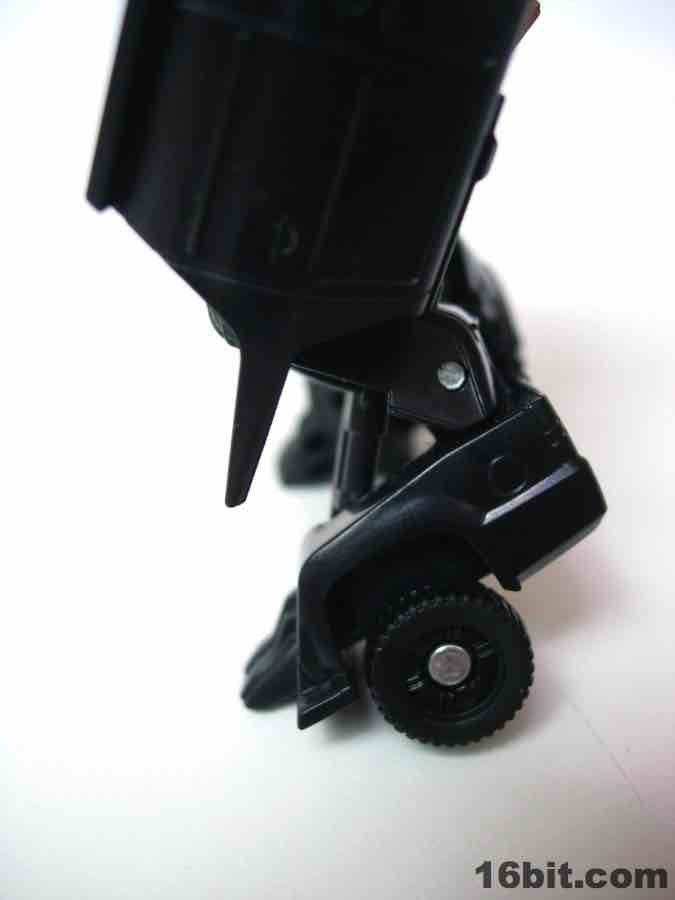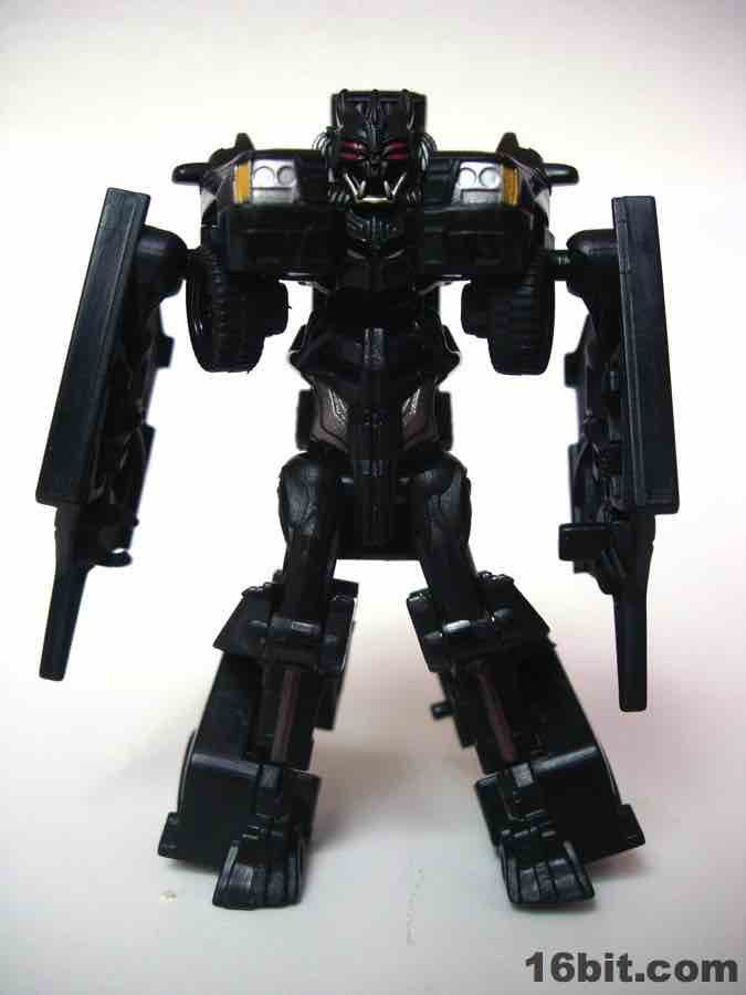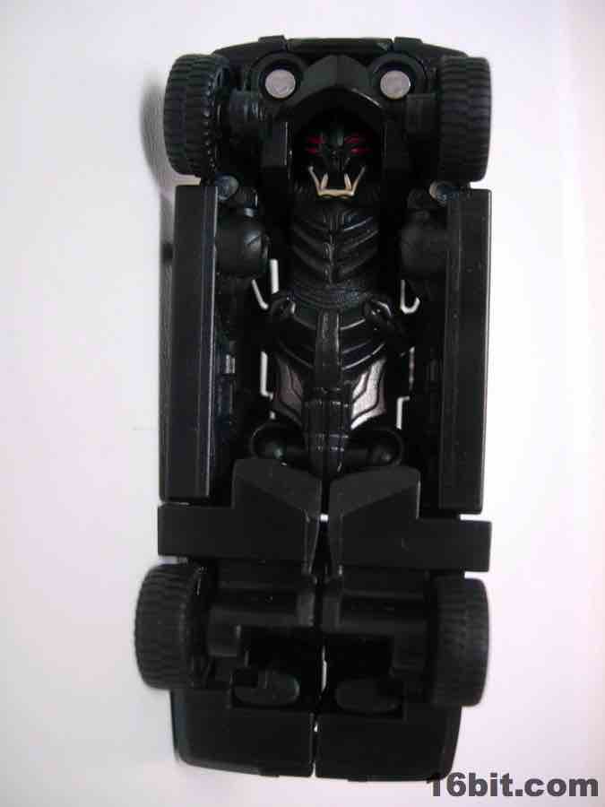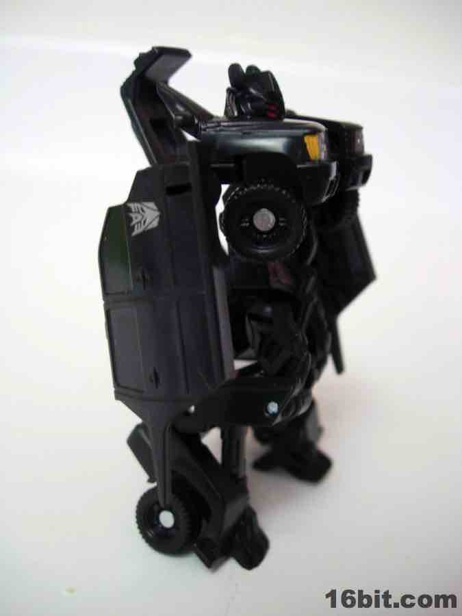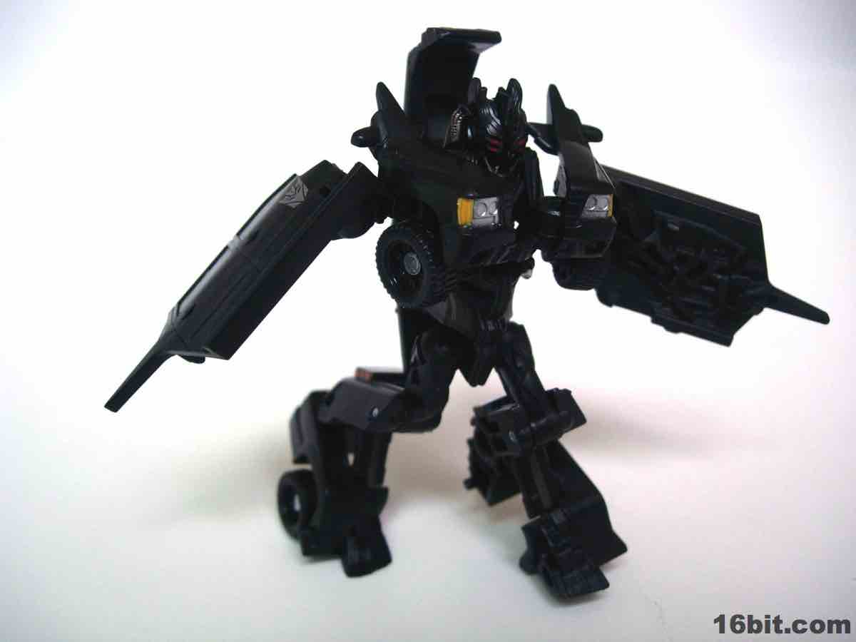 The vehicle is Chevorlet's Suburban, so now you have an evil spy robot in his own nondescript black van. Really, that's about perfect. The paint detail is a little weak-- the orangey lights on the roof on the sides is pretty sloppy-- but there are headlights, a Decepticon symbol, and even little yellow lights where the turn signals presumably are. It's a nice car, nothing supremely cool or weird unfortunately, so I wouldn't suggest picking this one up just because the Chevy Suburban is some amazing piece of automotive engineering. The toy is pretty solid, the wheels roll freely and nicely, and this is one of the better toys in this scale I've played with as of late. For $5, it seems a smidgen small, but that's true of the entire line. If you have a few bucks burning a hole in your pocket and love small toys, this is a worthwhile purchase. (The deluxe-class toy, though, is only twice as expensive at retail and is significantly more impressive.)