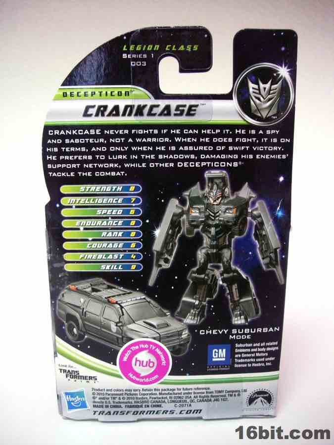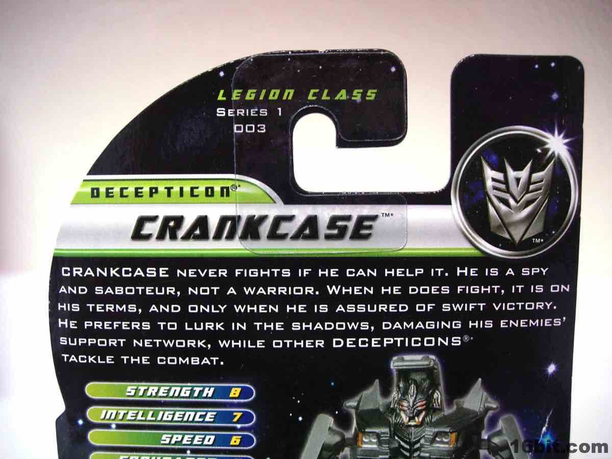 In the first few days of the Dark of the Moon launch, fans latched on to Crankcase because the bigger toy of him had a running change-- his middle finger got cut down. The "blade" weapon, or the bird, remains in his Legion-class toy in the miniature Cyberverse sub-line, which I bought because it looks vaguely like a robot version of the creature from Predator and is tiny. Despite looking like some sort of demon robot, his packaging indicates he's a spy who avoids fighting. Also notable, the packaging has a separate instruction sheet inside rather than showing it or any co-sells on the back, so if you see Crankcase you know he's figure #003 in a series, but no others are listed. Why is Hasbro avoiding the upsell?