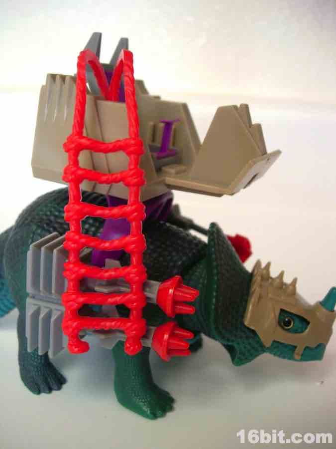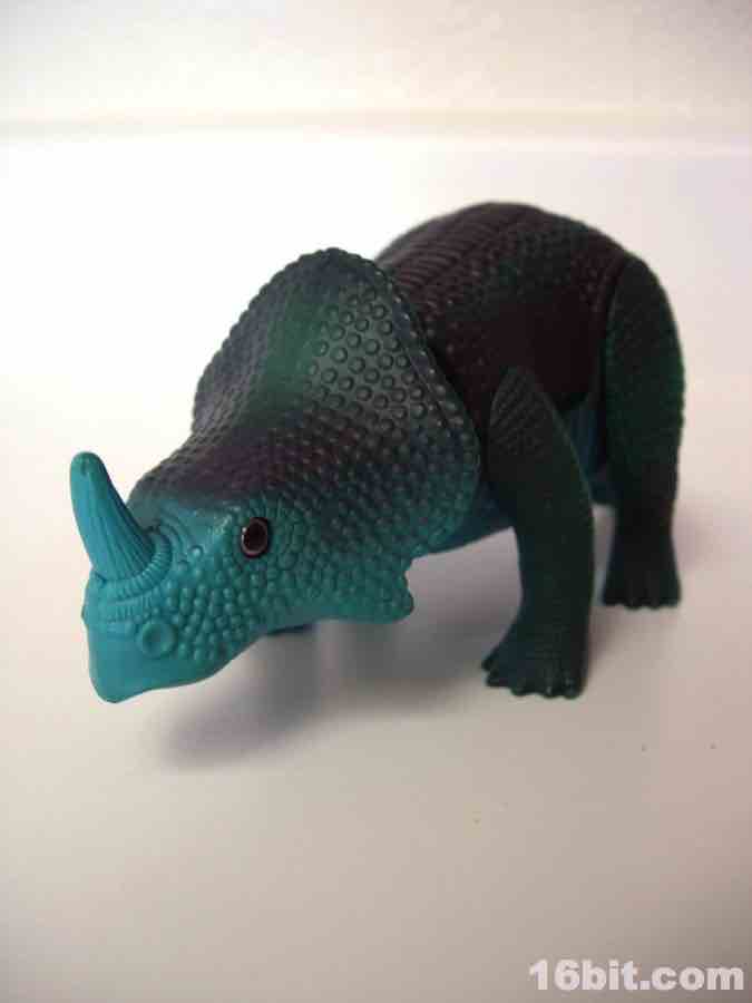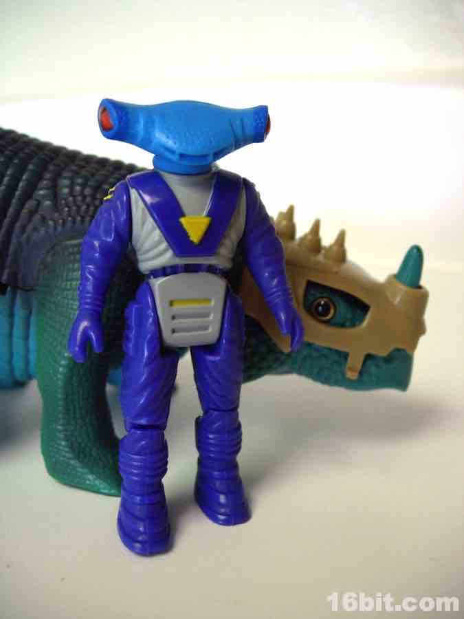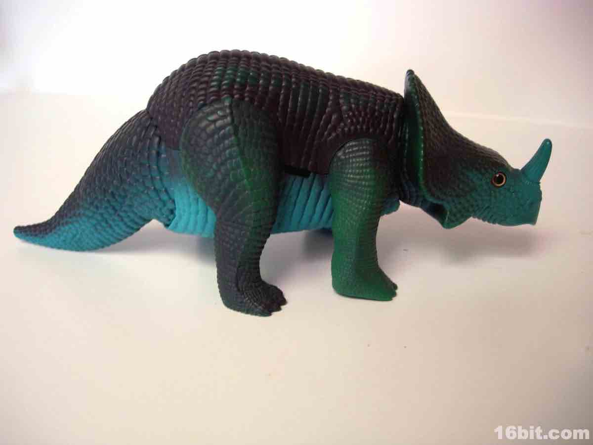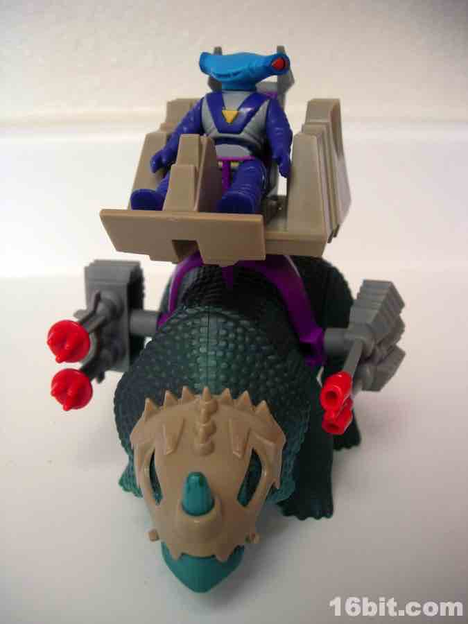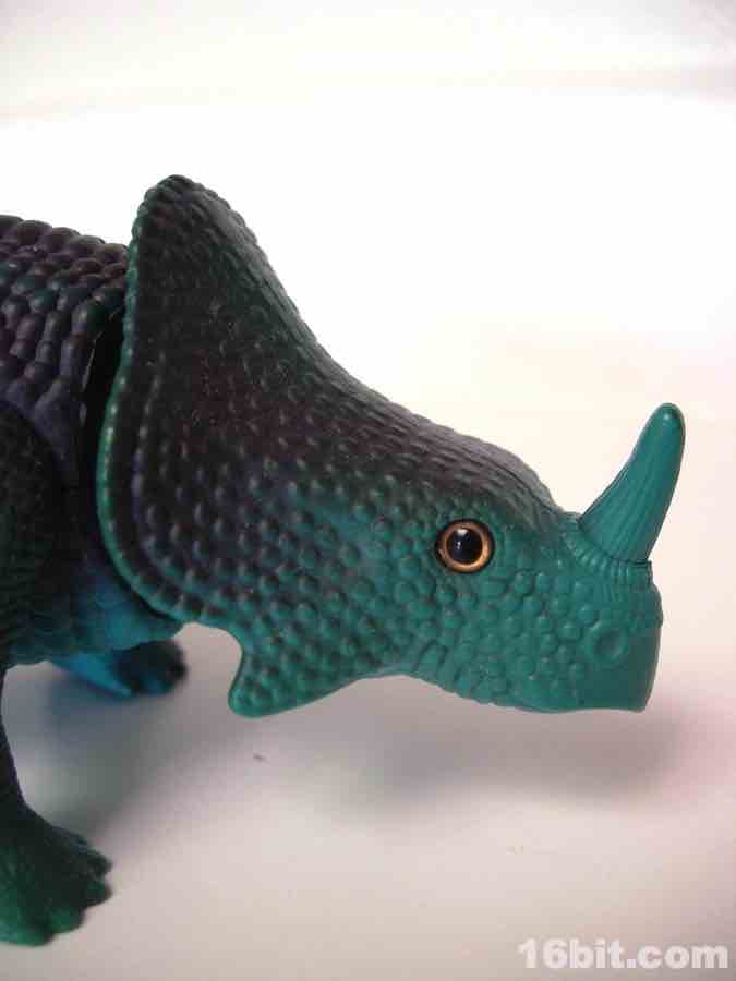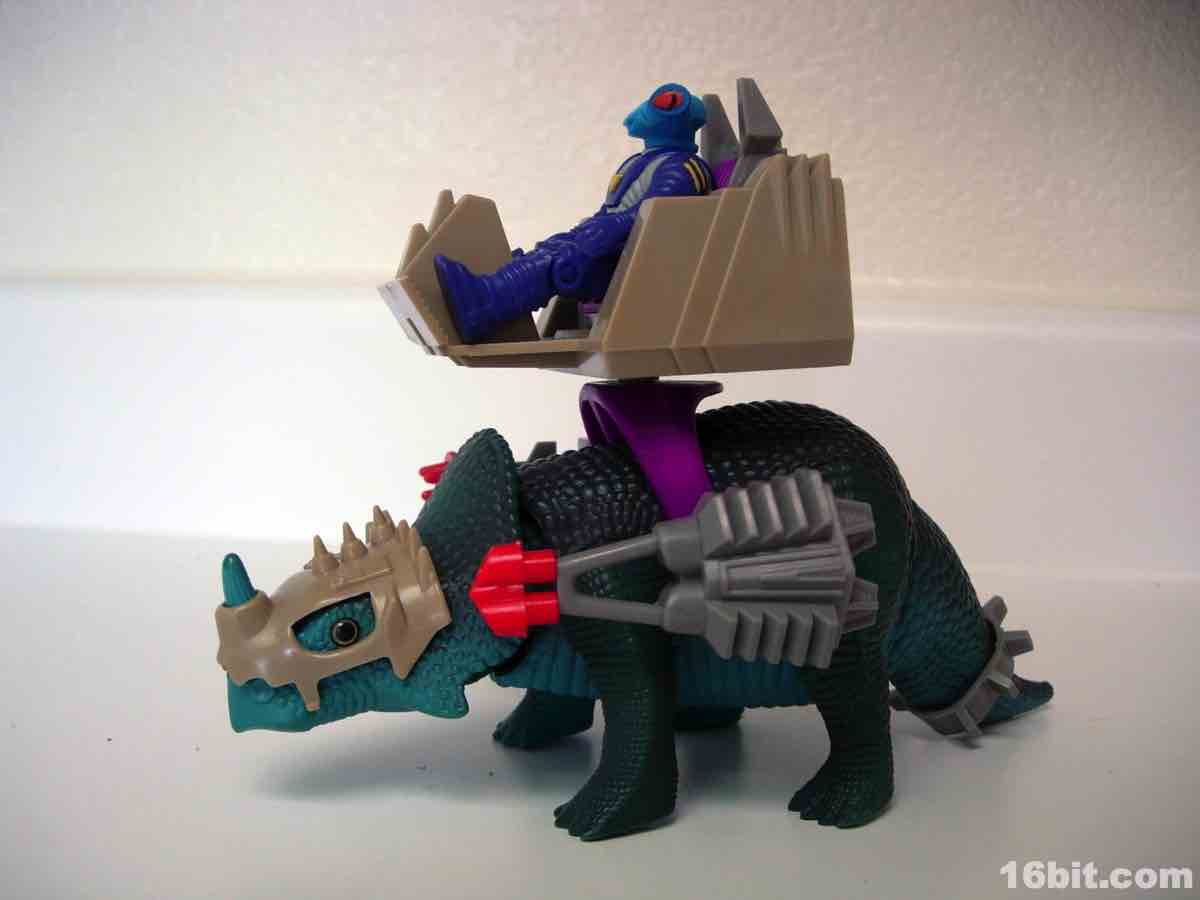 Time is kinder to some toys than others. The entire Dino-Riders line went from a modest hit to dead in no time flat, but Tyco managed to reuse the dinosaurs for two other toy lines, Cadillacs & Dinosaurs and The Smithsonian Institution Collection Dinosaurs. While the bulk of the dinosaurs aged quite well, the gear is all over the place due to rubber bands and a grey plastic which discolored due to aging, not sunlight. The Monoclonius with Mako sported a rubber band in a trap which dries out (and is easily replaced) as well as a seat and "brain box" dinosaur mask made of a grey plastic which discolored with age-- and is not easily fixed. (I have not yet dared to try the infamous Hydrogen Peroxide dip.) But aside from that? This thing is awesome.