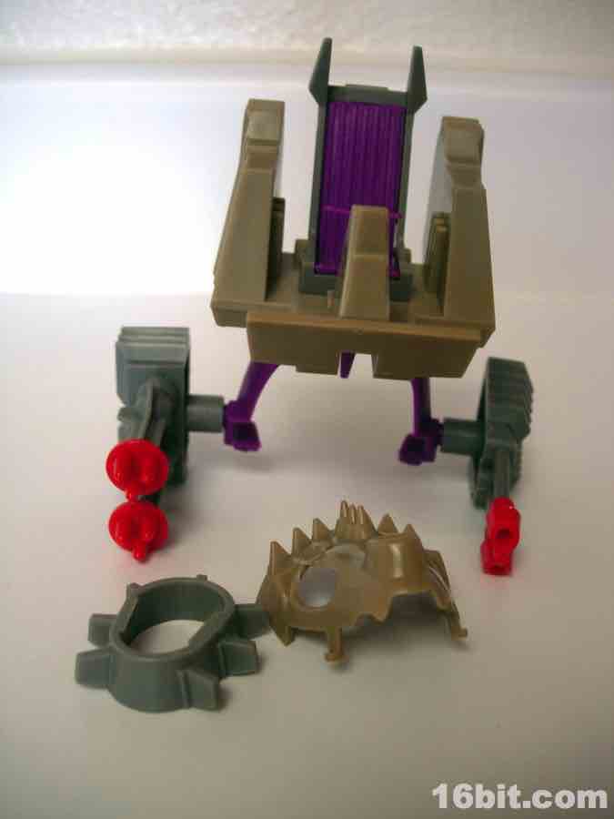 The "brain box" itself is quite interesting, especially in 2011. The thing is covered in spines and spikes, and they're quite sharp. Not just a little pointy, but definitely nicely-sharpened ABS plastic that could, I bet, hurt somebody if you really tried. Today they'd make this thing out of Nerf. (Damn hippies and/or lawyers.) Due to the grey plastic used by Tyco in this era, the brain box and parts of the seat may "brown" with age-- you can see the original colors in some product photography, and even sealed-box samples will discolor with age. Most of the pictures I found while researching this very article showed discoloration, so even a "mint" one might look a little funky. At least it didn't turn urine-sample yellow like some plastics.