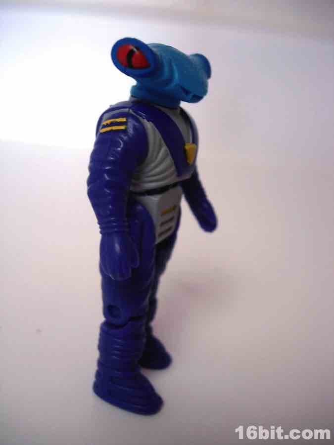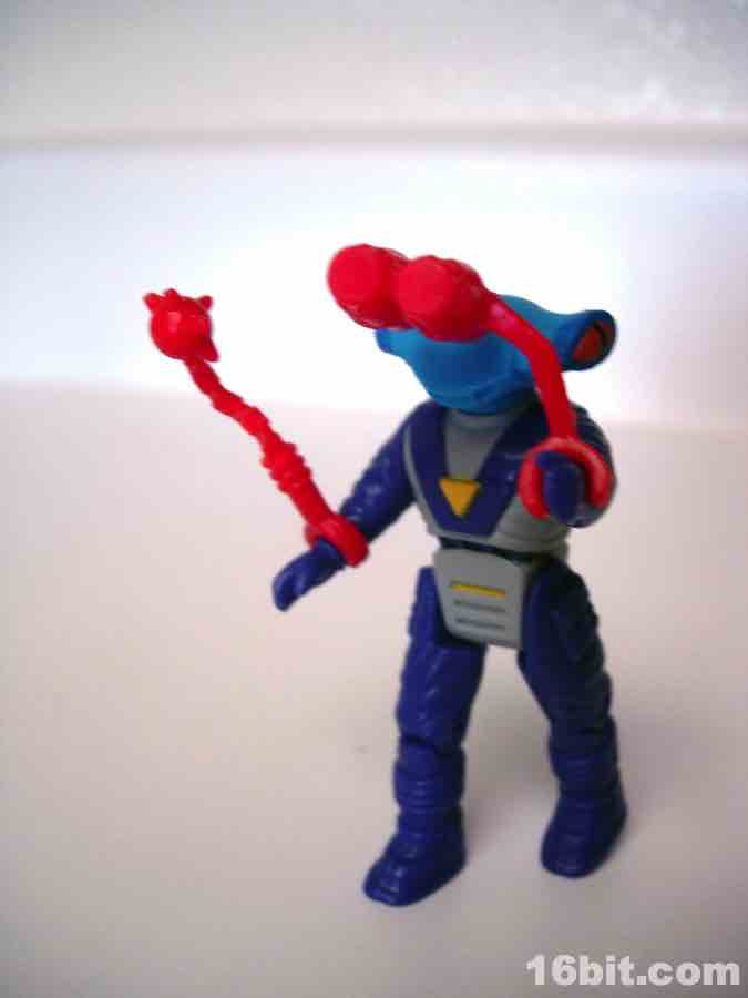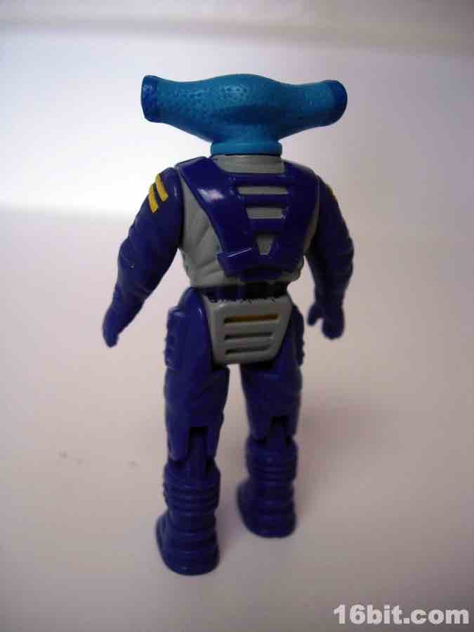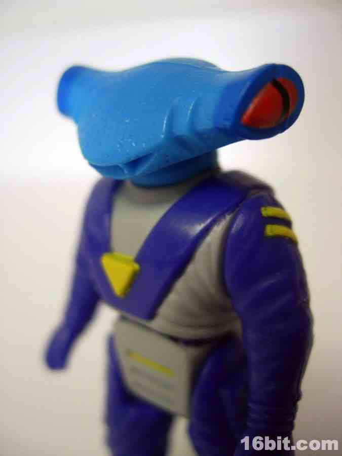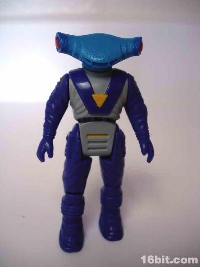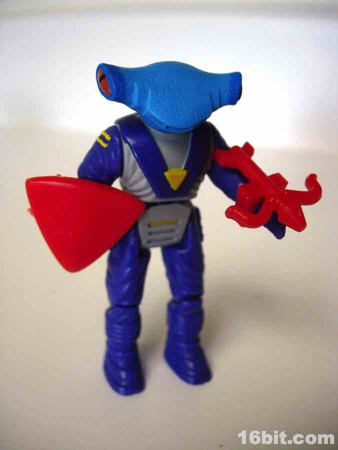 Mako is a shark alien man. Standing under 3-inches tall, he's similar to other small-scale figures of the age, like Starcom or M.A.S.K. The key difference, of course, is that he's got a hammerhead shark head. The body sculpt was reused on numerous Rulon figures, with new paint applications highlighting elements of the design like the chest or a stripe or something to give kids the feeling that it was something new and not the same body sixteen times over. Heck, they did the same thing with some of the dinosaurs, that's why the Monoclonius, Chasmosaurus, and Styracosaurus share everything but the head. Mako's a colorful figure and it's hard not to smile when looking at it-- the little guy is so weird you can't not love him. Several other figures shared this exact sculpt, head and all, and you can find those in figure 2-packs or with other dinosaurs. The names include Finn, Six-Gill, Hammerhead, Troilus, and mind-bendingly original Gill. Gill works for an ad agency in 1985 New York. Anyway, the weapons snap-on to his arms, and with 7 points of articulation he's an example of one of the more poseable figures of his day.