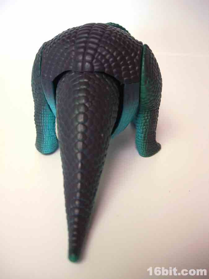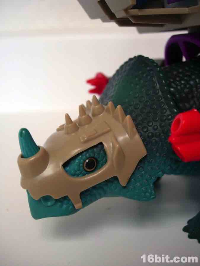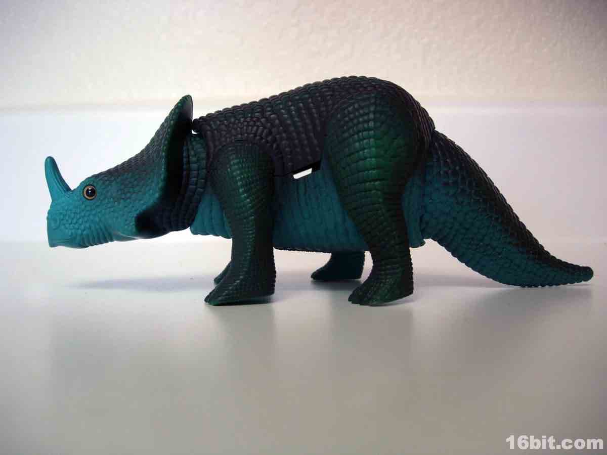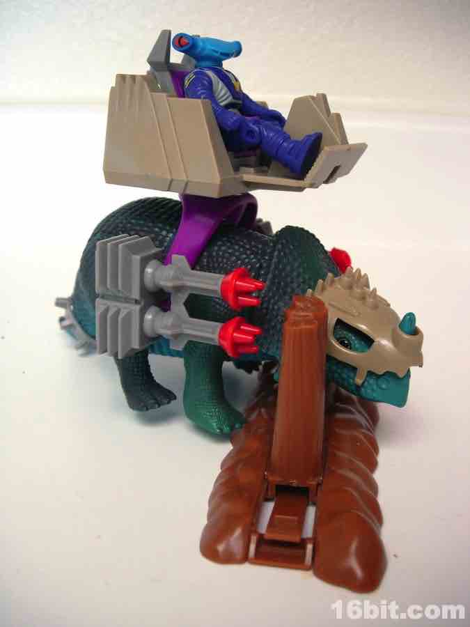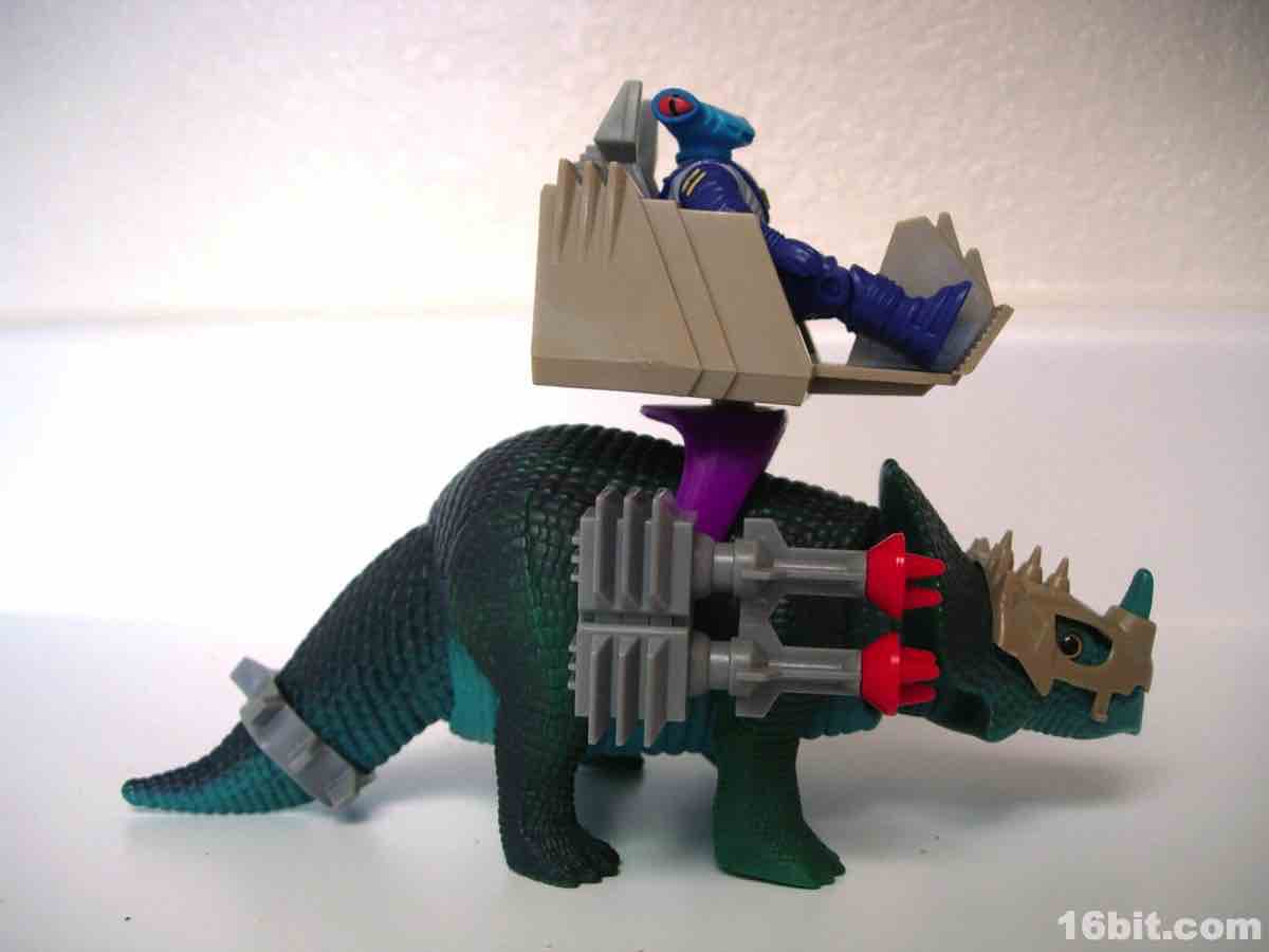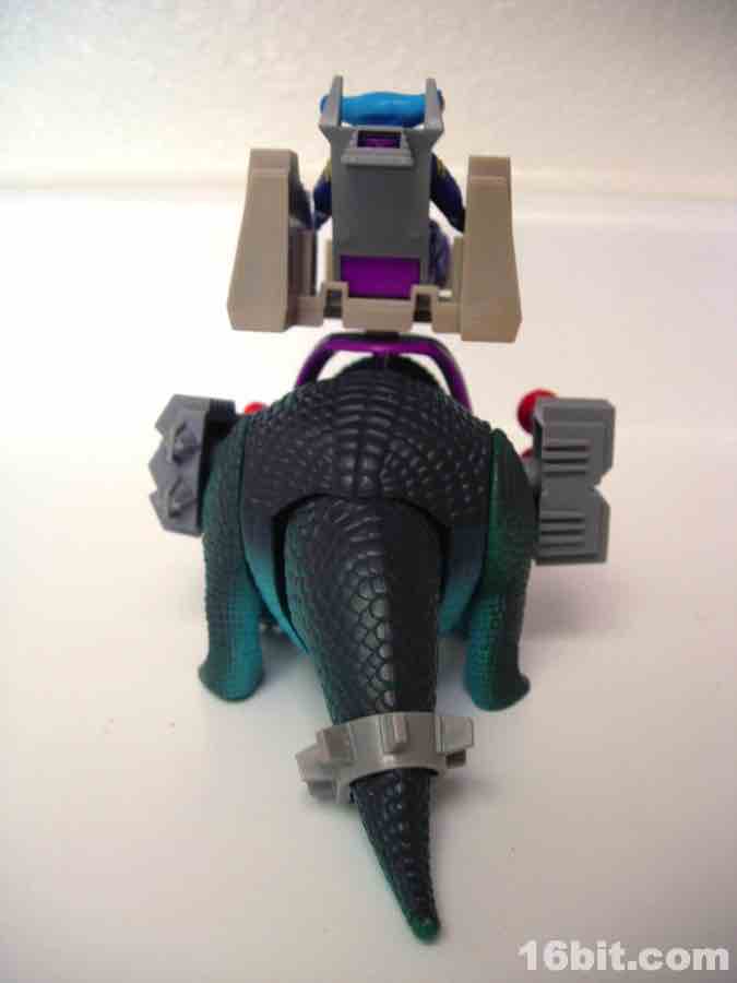 Once you get all the stuff on him, you've got a tricked-out dinosaur that looks a little better than his good guy counterparts. The guns look more savage, the chair more comfortable. Heck, Tyco even included some form of brass knuckles for a dinosaur's tail, and that's a pretty awesome extra right there. The tail's weapon can be tricky to keep on, but gravity holds the mask in place while clips keep the harness where it should be. Also, the dinosaur shares the same mechanism as the Styracosaurus, which is the "push the tail to the side and the head turns" motion you've come to know and love in other old toy lines. The legs are also articulated.