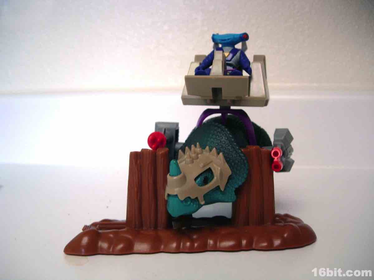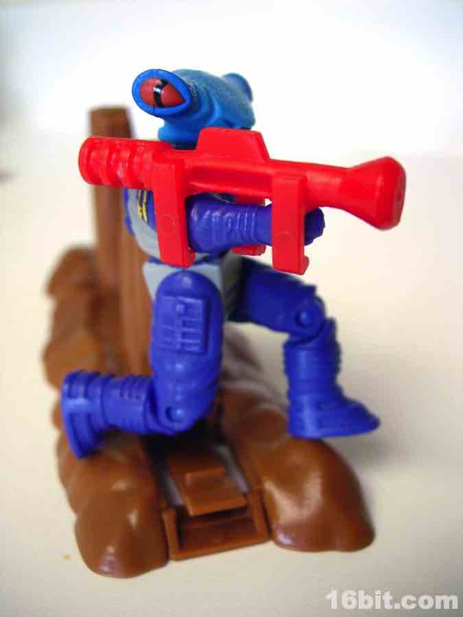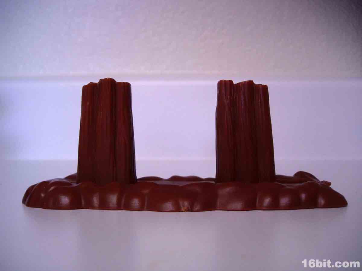 The good guys ("Dino-Riders") were futuristic space hippies with telepathic whatsis and love and all that crap. The bad guys were the Rulons, and since they didn't want to be pals with the dinosaurs they just slapped on a "brain box" to control them after trapping them. Naturally, Tyco thought they should include traps with some of the toys and sure enough, the Monoclonius has a funky log trap. The box says it's "spring action" but it's just a simple rubber band mechanism-- you push the log to the side, and it locks in place. Push the button and it grabs the poor monoclonius by the neck, until you slap a mask on his face and his friends make fun of him for dressing strangely. It's a cruel, cruel toy line.