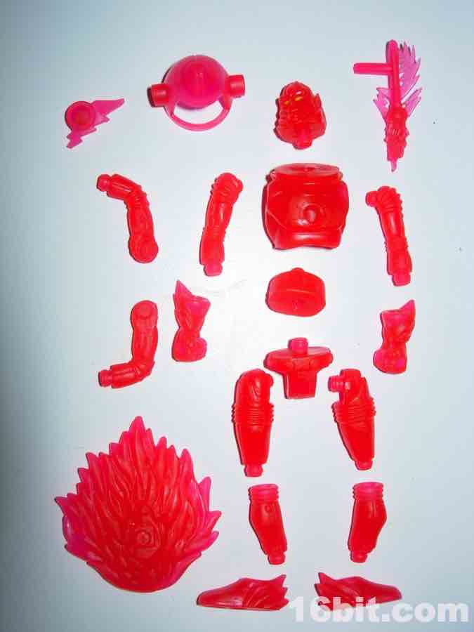 His helmet and chest symbol are removable, so you can swap the chest design with other figures like Mystron, Commander Comet, Electron+, and Metamorpho. He has no problems holding his blaster, which is the same peg size as non-Buildman Glyos fist holes. (So Pheyden, Savros, or Exellis can make use of this line's weapons, but the Gendrones are out of luck.) I believe this figure-- this whole series, actually-- to be some of the most delightful action figures released in 2010. With four (or five) paint jobs each, their action features work, the construction feature is tons of fun, the designs are all incredibly strong, and they're fun. Since there are tiny little parts which may look like candy, it's no surprise that this line wasn't designed for the mass market but rather, was sold at conventions or direct to the customer.** If money is no object, get this figure. If money is an issue... consider skipping a few lunches. The clear red works well with the design, and the yellow eyes are a nice touch. Plus as "upgrade" parts to the painted figure, there's no better choice!