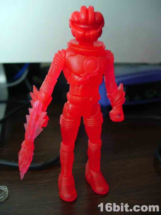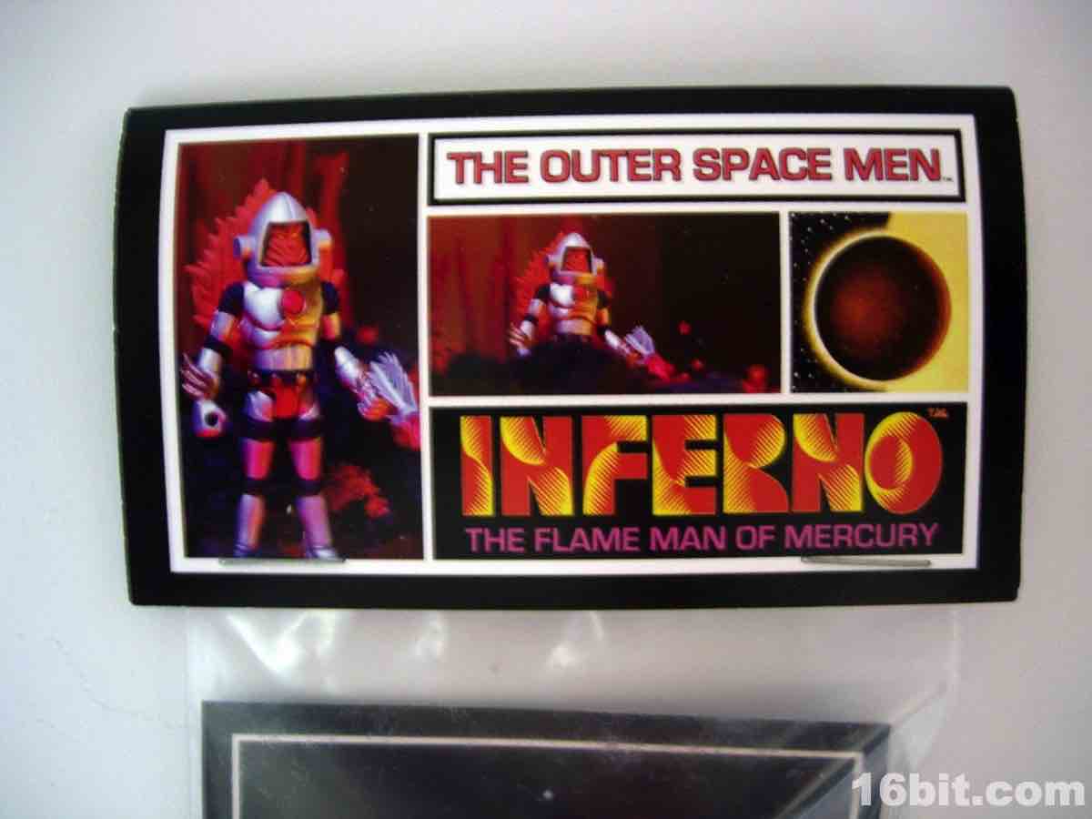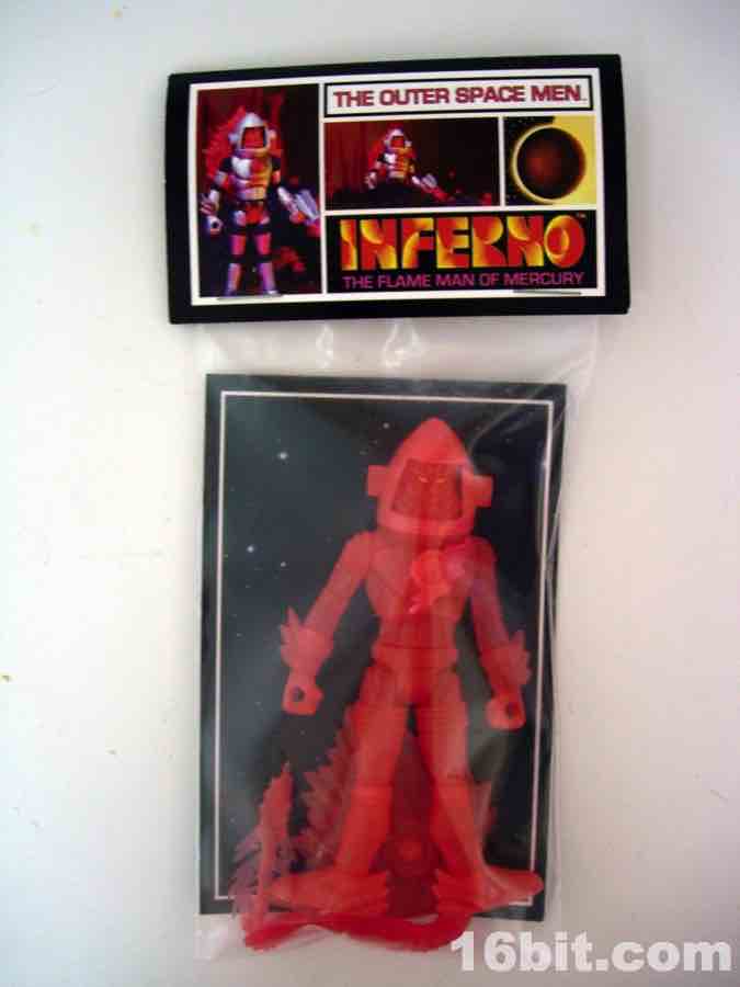 I should note that this was not only one of the first modern Outer Space Men toys, but was the first official release of Inferno in any form. A 1969 "The World of the Future" figure prototype was designed, but never released or mass-produced. It had a clear red head and a light-up feature, and if you want to replicate that 1969 look, you can come pretty close. Just take the Alpha Phase figure's head and flame backpack, and plug it in to the fully-painted Infinity series body. Of course, this is easier said than done, as the Alpha Phase Inferno sold quickly and shot up on eBay-- right now, getting one will cost you. As such, cross your fingers someone at the Four Horsemen or Onell Design see it in their hearts to release another version of this figure in a red glow-in-the-dark plastic.
