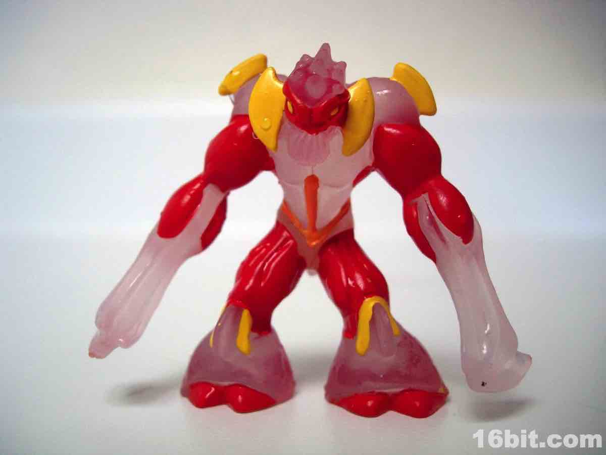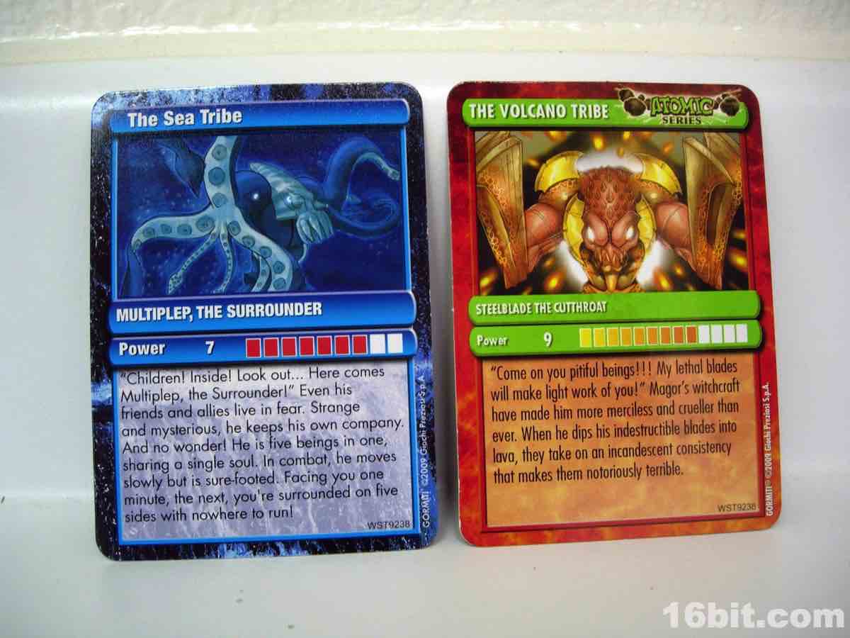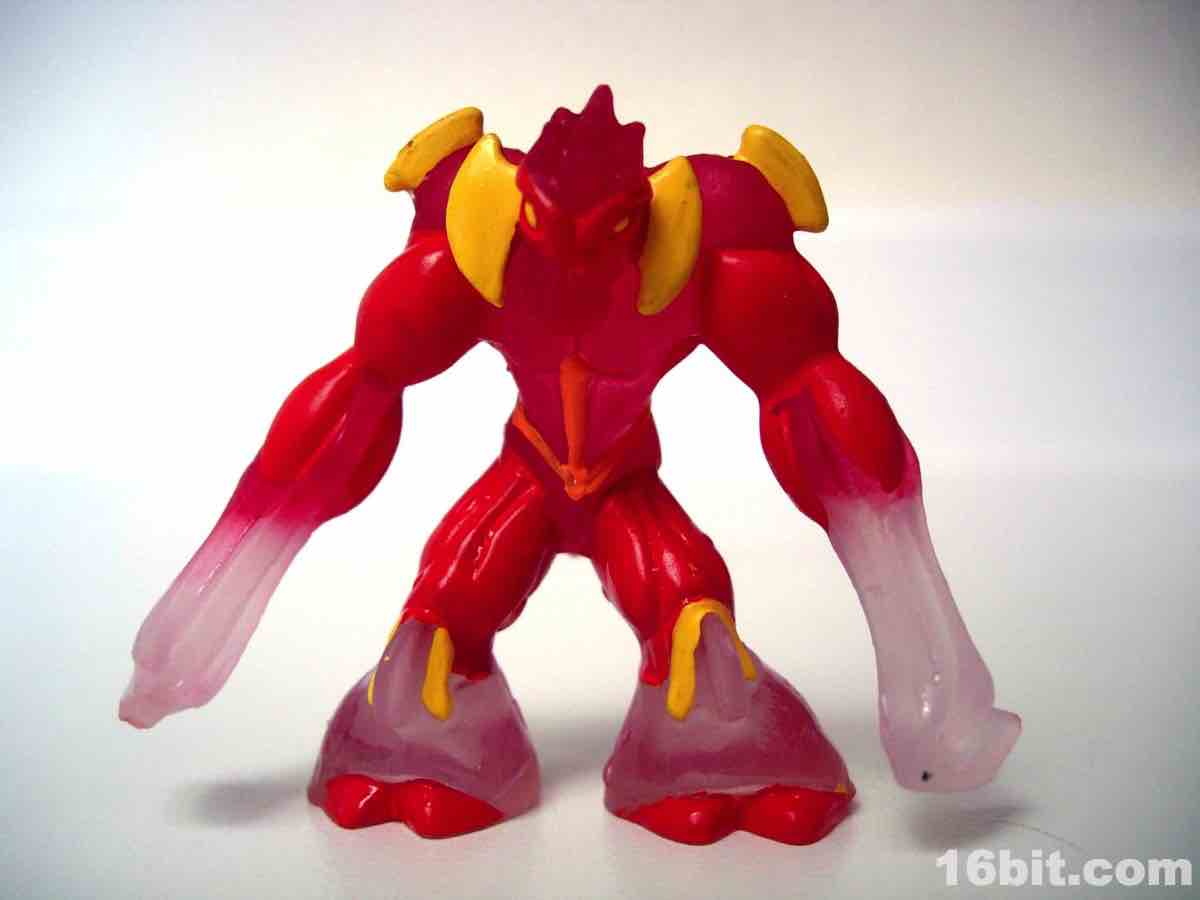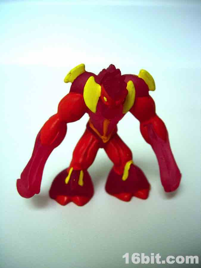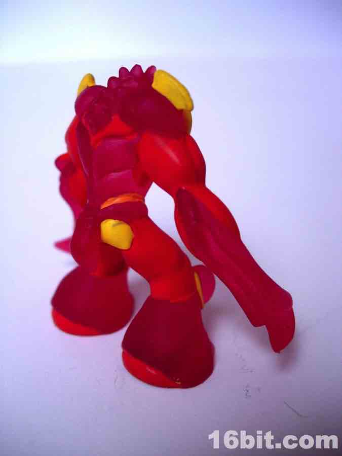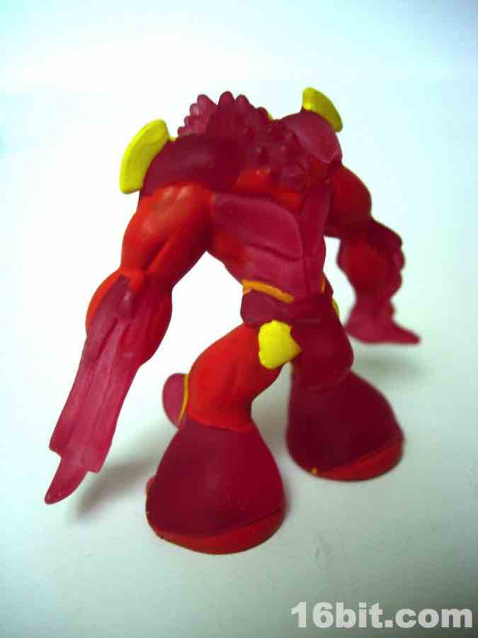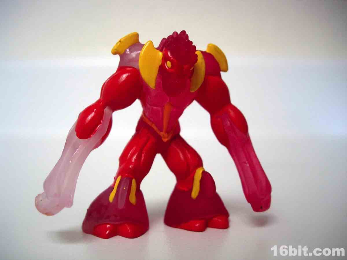 The figures are not sold individually, so the "Sea Tribe" monster is joined by the "Volcano Tribe" member Steelblade the Cutthroat. Described on the packaging as an "Atomic Color-Changing Figure," this red figure is painted yellow and red, but his red plastic pieces will turn clear when heated. I set him up on my computer so I can see visually how my machine is heating up. He has a little more texture than his blue counterpart, but the added details and scales don't make it obvious just what the heck he's supposed to be. I'm assuming it's a rock/reptile hybrid, and he has hooks for hands. Both figures stand on their own quite well, but outside the game (which I'm not going to describe) the only real play is picking one up and smacking the other with it. Which, I might add, is a classic play pattern.