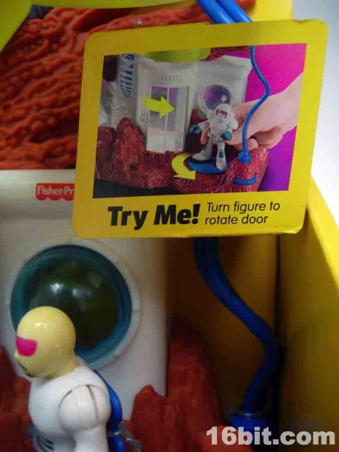 Fisher-Price Imaginext Space Station Toy SetThe action features all work well. The little mini-ship has an opening canopy, and its design allows "feet" to extend over the landing platform so it won't fall off. On the adjacent platform is a rocket launcher, both of which may be manipulated via controls on the inside of the station if you're so inclined. The rotating door works with a dial, which has a peg on it you can use as a lever or you can plug in a figure and use that. On each side of the planet are two long blue cables which extend into space with a big claw on the end, ideal for holding up "floating" astronauts. With no motors, lights, sounds, or that sort of thing, everything just functions nicely. Assuming you don't break it, odds are you could pass this down to the next generation in reasonable shape.