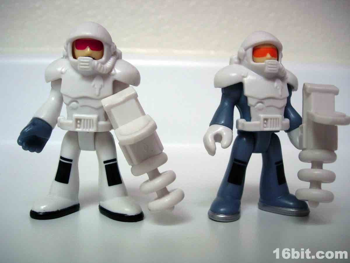 The figures are nice-- there's now a standard Imaginext body with few sculpted features, so these little guys are sort of like Mighty Muggs. Each one has painted facial features and some decoration on the torso, plus articulated shoulders, wrists, neck, and leg-- the legs are one piece, just like Playmobil, so they're going to move together. They sport snap-on helmets, blasters which fit right in their hands, and a little alien which can clamp over their heads. It's not a facehugger, but let me tell you that if you play with this for 10 minutes you will wish they did a repaint of the planet as LV-426.