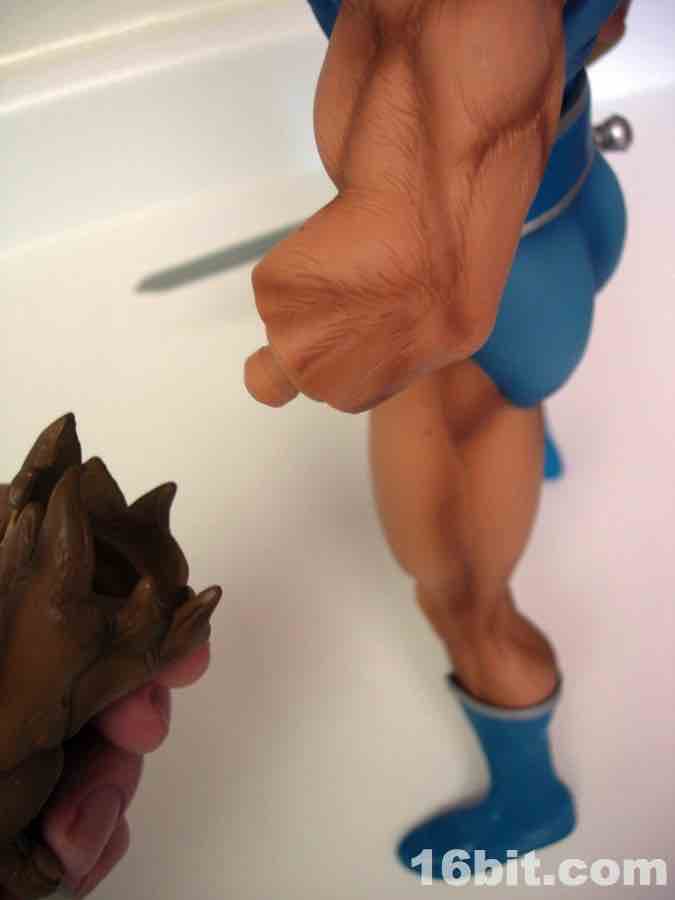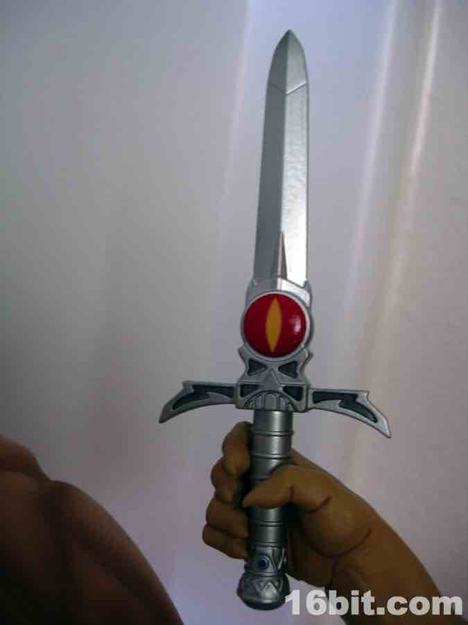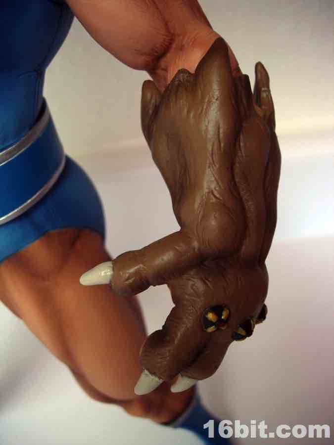 His shorter sword cannot be stored in the claw, but it does have the red and yellow design on the side and the uniquely sculpted handle, which changes position and appearance for the "larger sword." In the show, I mean, the toy doesn't change, you just get two different weapons. He has no problems holding the blade proudly but he can't be posed to see with Sight Beyond Sight due to the figure's design. (Perhaps if Mezco does a third run?) The big figure is more of a collectible than a toy, but that's OK-- I want something big and impressive, and this is it.