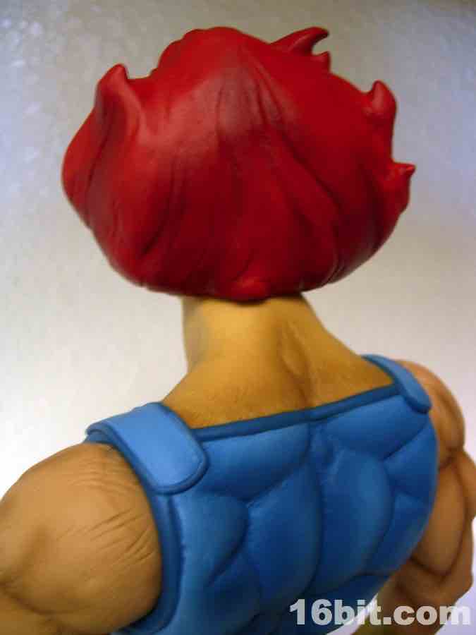 Mezco has a fantastic design team and they created Lion-O to be fairly detailed-- not too cartoony, but not too realistic. The face deco matches the show, with subtle shades of paint on the face setting off the eyes and mouth from the rest of the head fairly well. The toy understates the facial coloring and emphasizes the eyes a bit, plus the thicker lines around the eyes for the eyelashes do a great job of more closely matching the stills from the show. His torso has a little fur on it, while his arms aren't quite hairless-- there is a subtle hint of fur in the sculpt, though. His trademark "ThunderCats" belt buckle is present in lack and red, just like the t-shirts you see on kids at the mall who don't know what this is, plus he has bright blue boots with a silver lining on top.