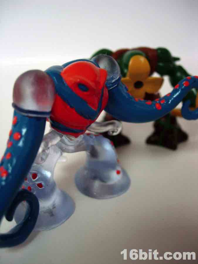 Even more Gormiti! The Clear Ancient Jellyfish comes with the Florus the Poisoner, and they seem to be based on an octopus/jellyfish hybrid and an flower mutant, respectively. For those of you just joining us, Gormiti sort of combine Battle Beasts and MUSCLE elements, and are little plastic guys who can fight with a trading card game. When I got this-- on clearance, deeply discounted even more by a closing retail store-- all the "Series 1" packs included one normally painted figure and one "variant," generally cast in a translucent color. The Sea Tribe were given clear blue plastic with blue and neon orange painted highlights.