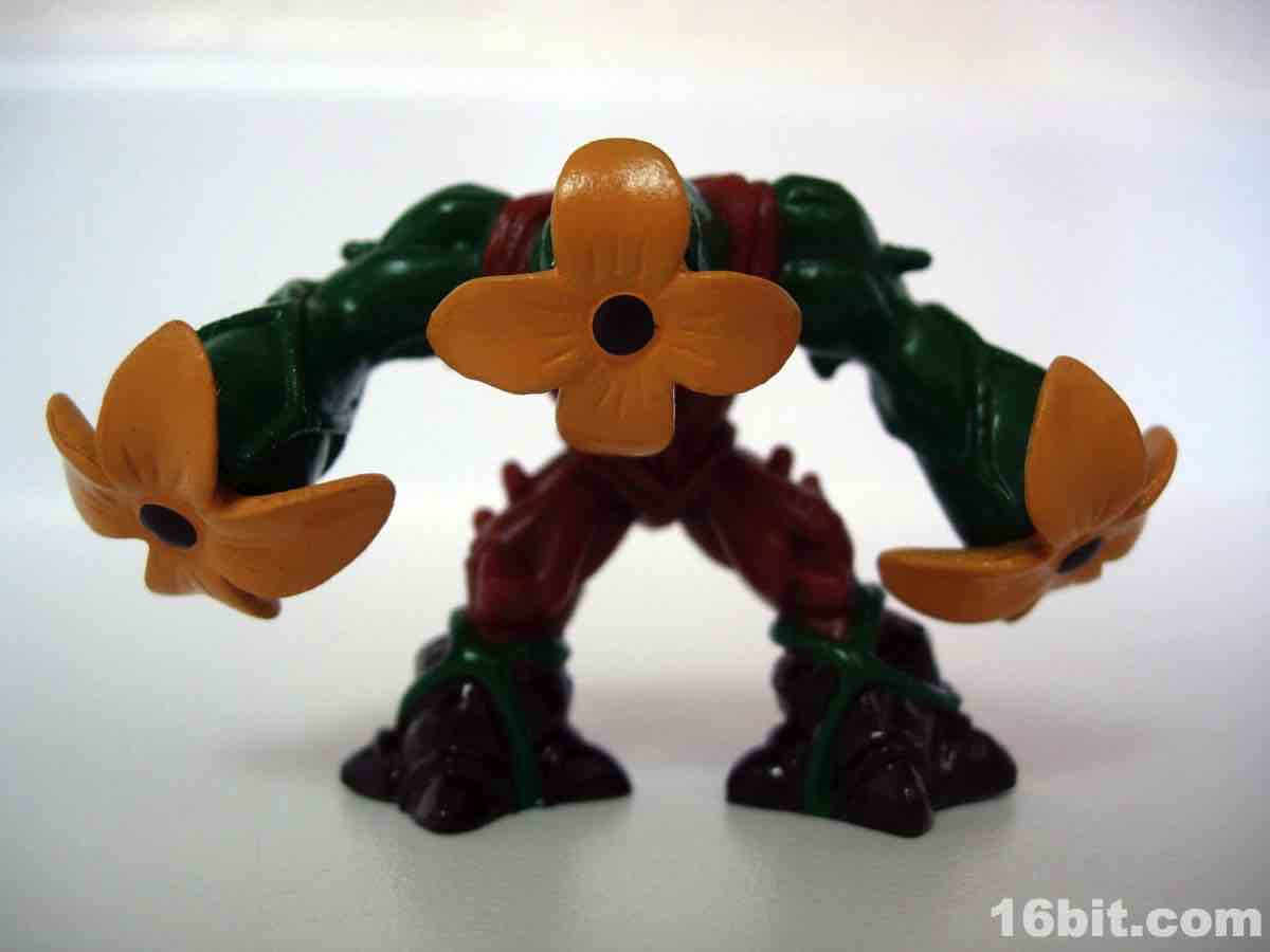 Just barely shorter is the painted version of Florus the Poisoner, a plant mutant cast in brown plastic with dark brown feet plus green and yellow highlights. A flower head and flower hands are not particularly threatening, but the body is an interesting mix of bark and vines with some twigs mixed in for good measure. I get that he's deadly and poisonous from his trading card, but bright yellow is a tough color to take seriously on a vicious monster. I understand why they went with it, you have to make these toys colorful for the kids and such, but it is a little silly. And that's why I went for it-- the Forest Tribe is the neatest one after the Sea Tribe if you ask me, so grab either of these guys if you can. Again, he has no articulation, but looks good standing there. There's also a clear variant of this one.