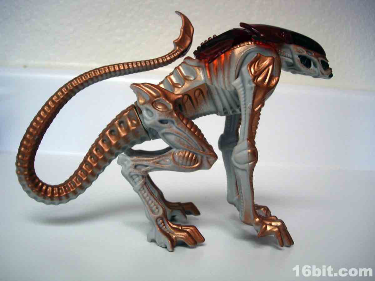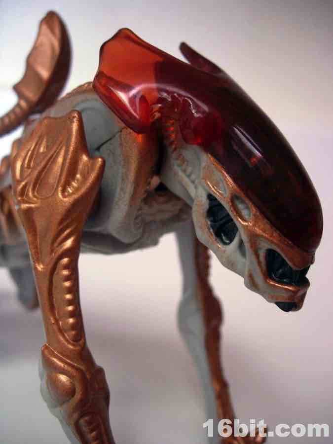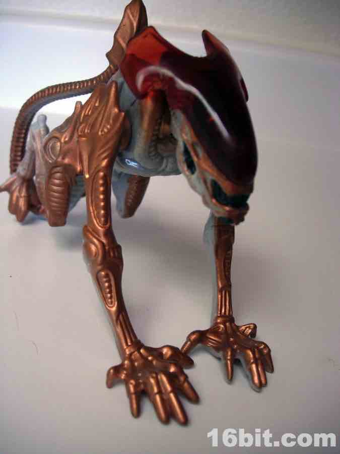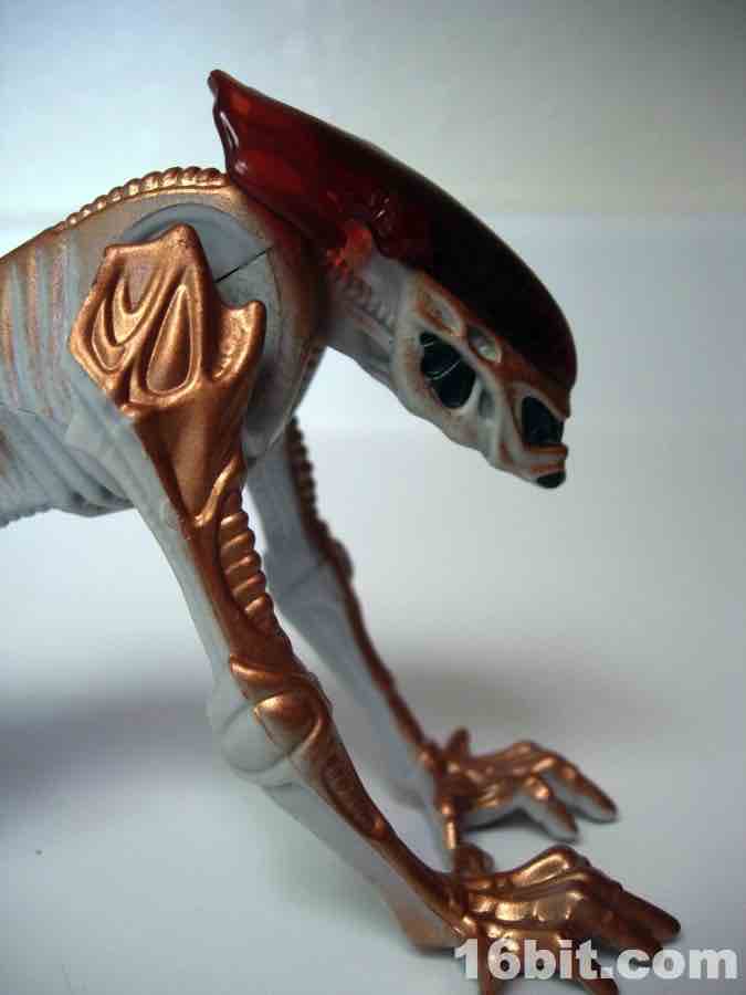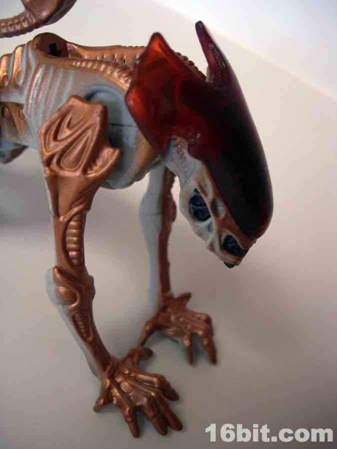 Arguably every alien in the line is an army builder, so you could have a pack of these if you wanted. (Did anyone want a pack of these?) When I first got the figure, its grey coloring with a orangey gold paint over the skin really brought it to life, and its dark grey teeth really stood out against the gritted mouth. It's a very striking image but it doesn't make for the best "action figure" in the world. It is, however, a fine toy. He can sit, and has limited ability to be posed. The head is geared to his two front arms, which move in unison and act as the lever to launch the parasite. Push them forward, and it shoots. The back legs move individually, and the tail rotates. It's really fun to play with, but I could see it being boring as a shelf-doomed collector's piece. This is a piece designed for you to have fun with your kids, or cats, launching the parasite on the floor while having fun on a nice afternoon.