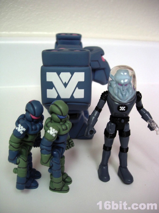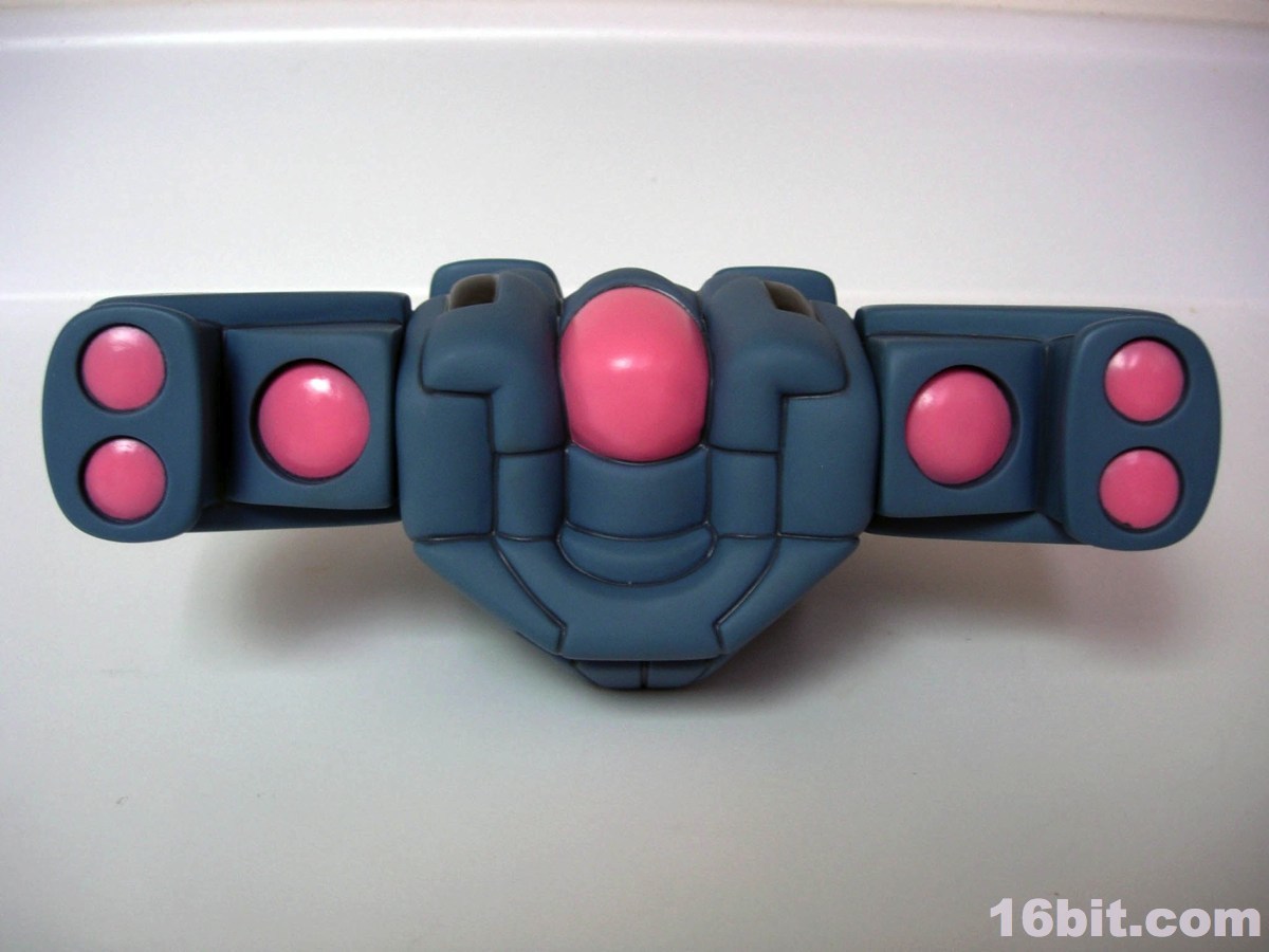 The body is fundamentally the same as previous Rig figures, but what makes this one extra-special are the new wing-like arms. Now, the greayish-blue body is augmented by extra-wide wings with pink circles with match the "windows" on the body, plus Relgost tampograph symbols to add to the mix. The interlocking, DNA-esque design would look super-cool on a t-shirt, but for now you'll just have to enjoy them on this figure's wings and on the back (or top) of the figure, depending on how you look at it. The same logo has also been used on a pair of Glyan figures as well as the Glyaxia Command Xodiac.