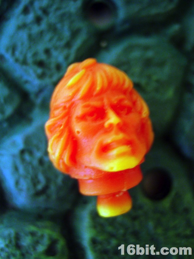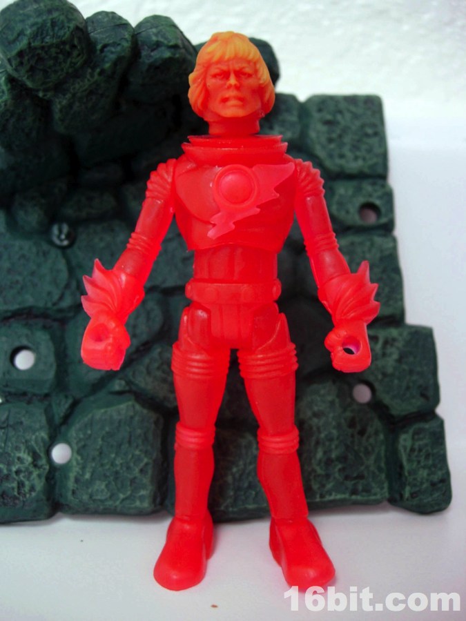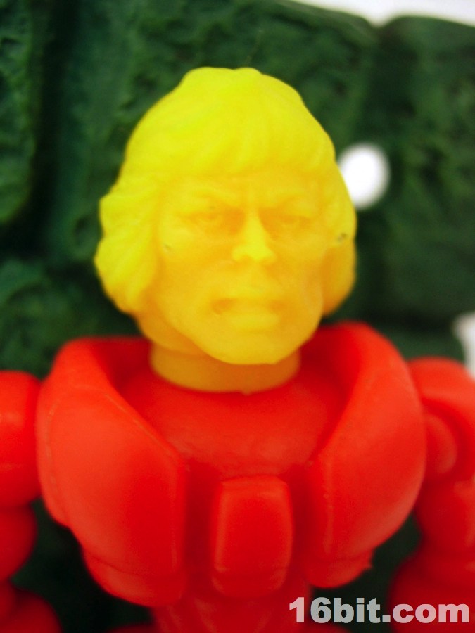 What's particularly neat about this accessory is that it changes color from red to yellow. I've seen a lot of red to clear, or glow-in-the-dark, but to see such a dramatic change from one color to another is unusual in action figure parts. I know customizers and do-it-youselfers use stuff like Solar Color Dust and I'm not seeing a whole bunch of that from Hasbro or Mattel just yet. (Could you imagine MUSCLE men made out of this stuff? That'd be amazing.)