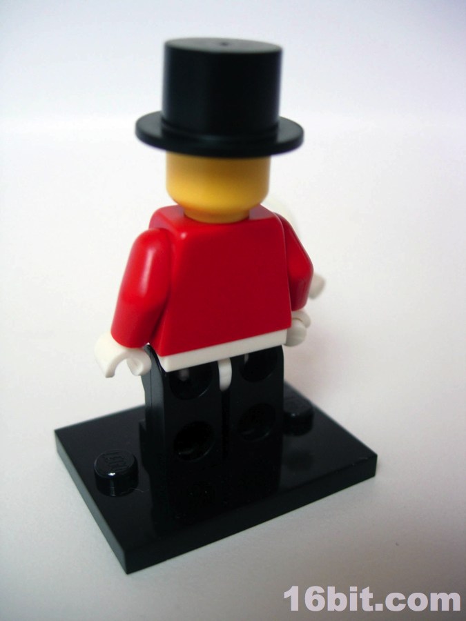 There's really nothing new here, it's just an example of deco trumping design. LEGO has the one mold and isn't afraid to exploit it. The whole black tophat on a red coat figure has been done to death in Playmobil as its circus motif seems to cycle in and out every few years, but that kind of play is absent from LEGO and I'm not sure what it is you're supposed to do with this figure. I mean, sure, it has impressive deco, a little bow tie, buttons, and the works-- it's a very impressive paint job. But once you get it, where does he live? You could put the dude in a gorilla suit on any LEGO street corner, but this guy seems like an odd pick. He's neat, but it's hard to get past the "why" of it.