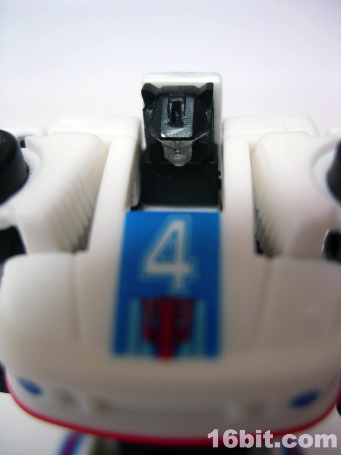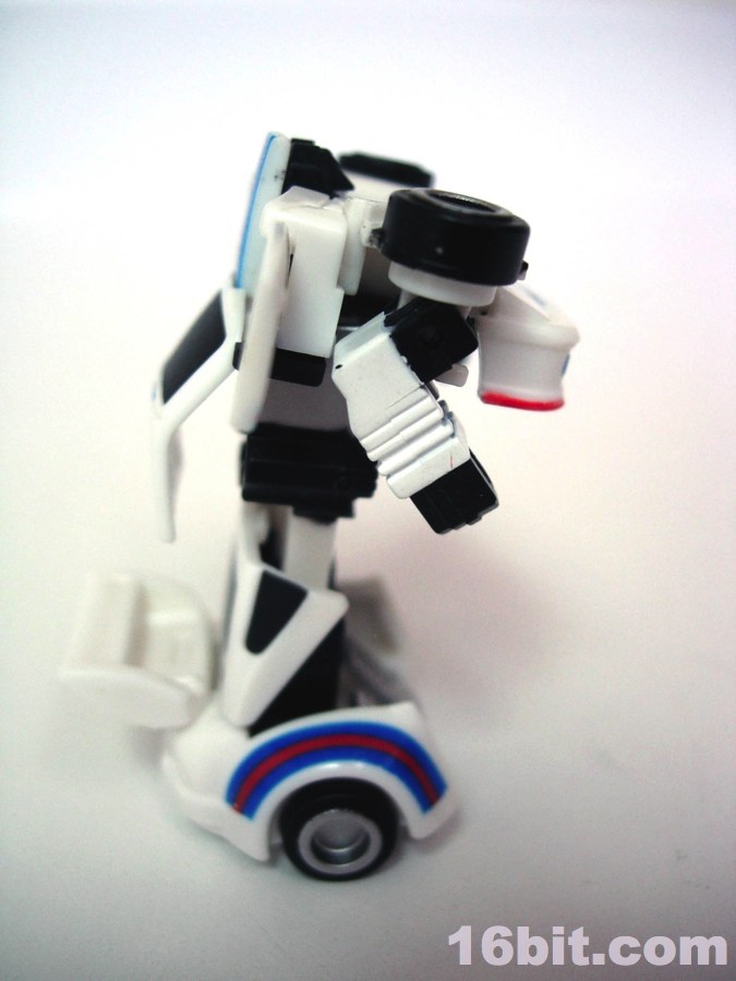 At about 2-inches tall, this figure goes from a pretty good replica of Jazz' robot mode to a pretty good replica of his vehicle mode. It has no weapons or accessories, and the paint job is pretty decent in how it replicates the transformation process. The robot has some silver, plus blue and red stripes and an Autobot symbol on the chest. The Autbot symbol looks sloppy, but aside from that the deco is pretty clean and there's a "Meister" on it. Nice stuff, and about sized right for your MicroMasters displays. However it's still pretty fiddly in spots and clearly not meant to be played with-- the joints will get loose if you mess with them too much, and it feels like the pieces are not designed for rough play.