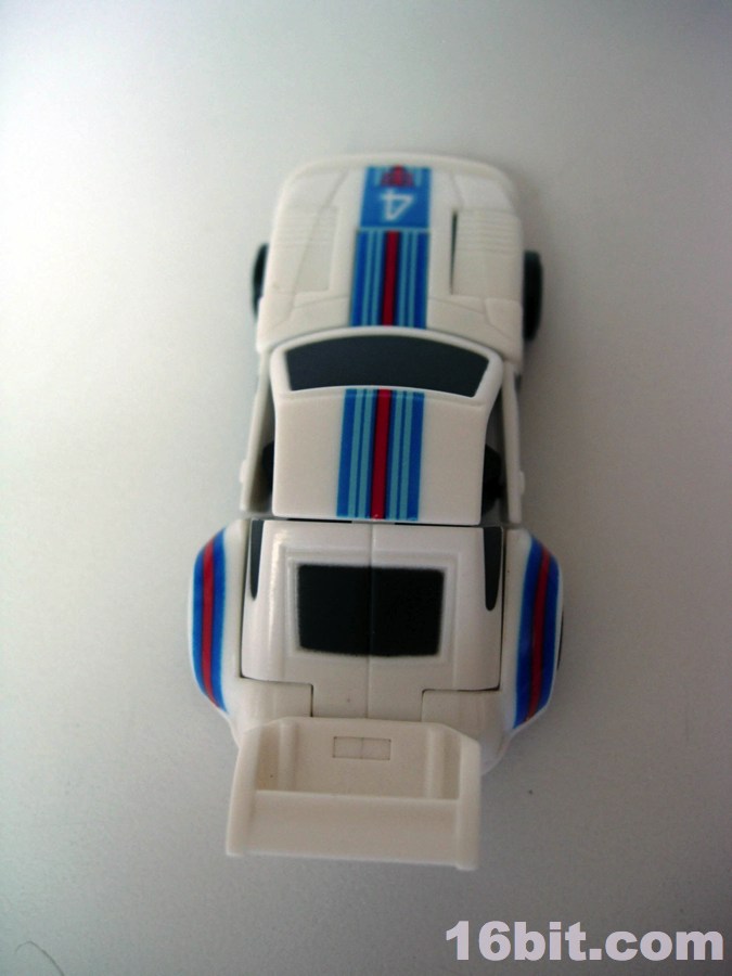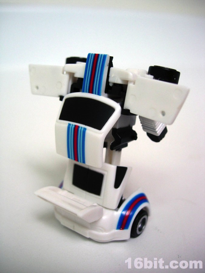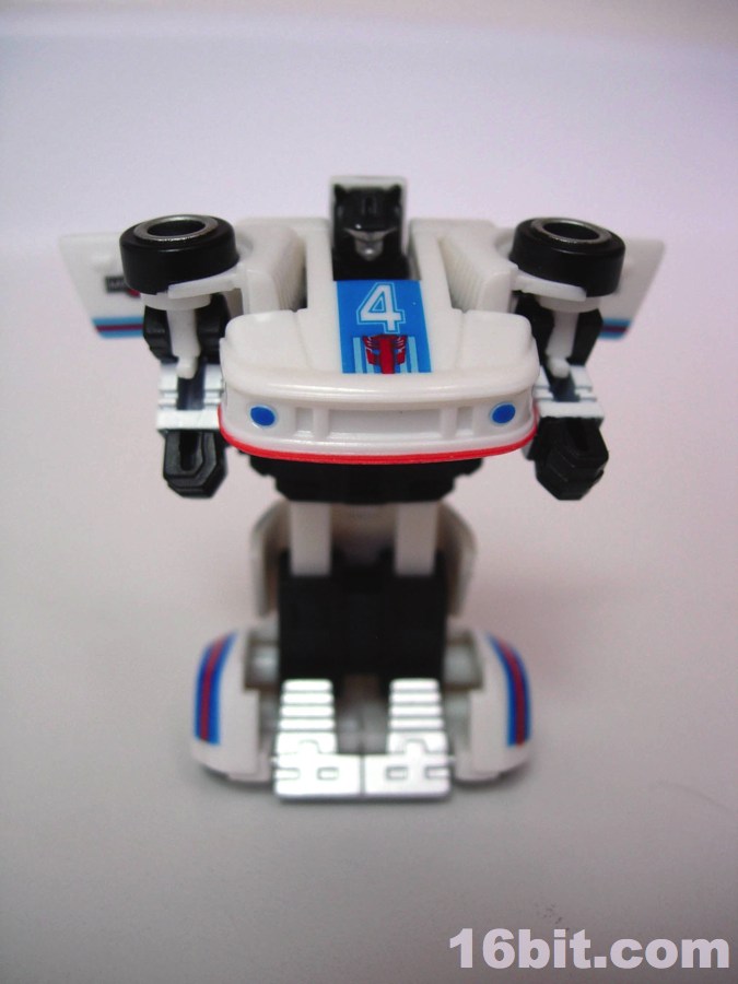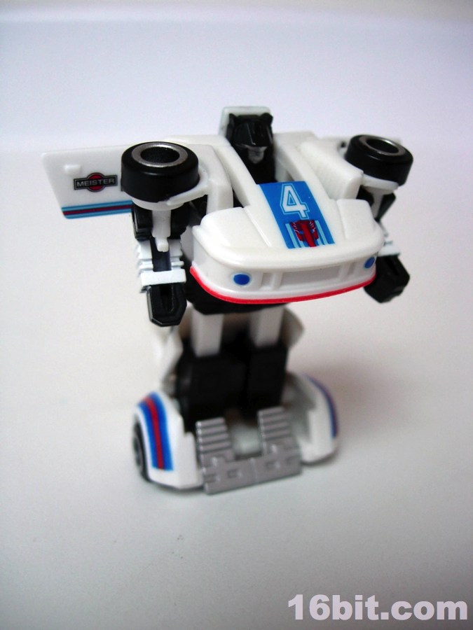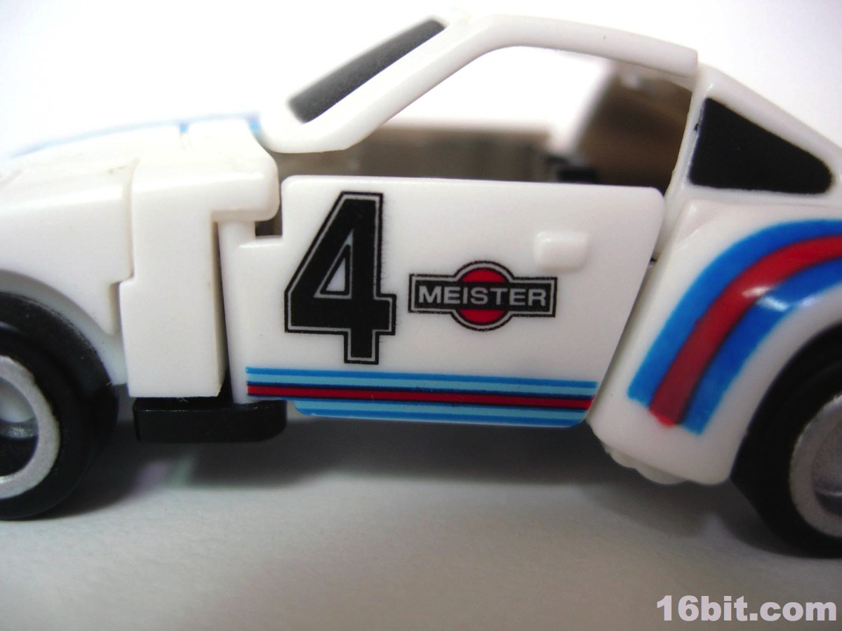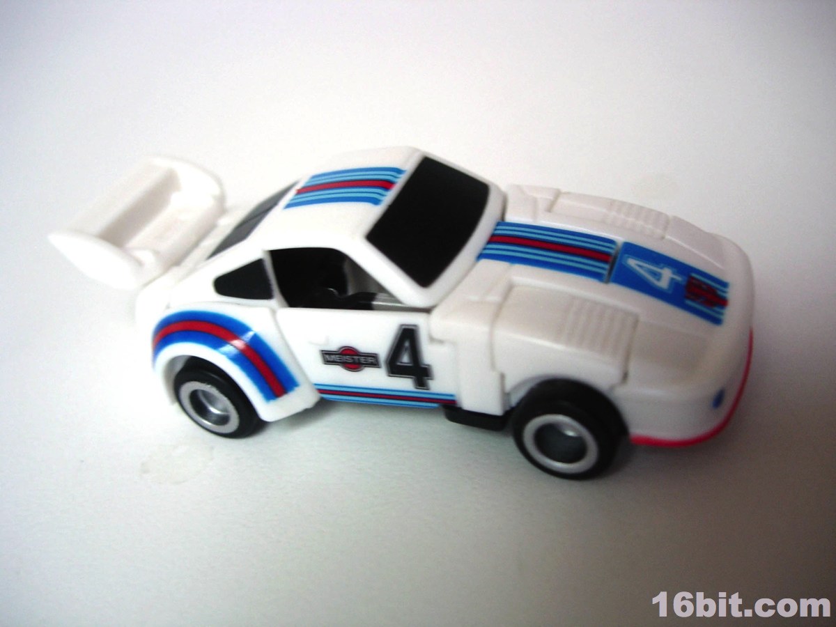 The Smallest Transforming Transformers line was an odd duck, with lots of "chase" pieces and countless bootlegs making it difficult to pick out the rare figures from the fake figures. One of the first new molds that was really tough to get was Jazz, sold there as Meister. Today he sells for about $30, but he used to go for a lot more-- and even $30 is a fair amount considering the guy is about the size of your average LEGO figure. With spoiler, the car mode is only about 2 1/2-inches long and the wheels do not, I repeat not, spin. It's clearly a collectible for adults, despite looking like a children's toy from 1984.