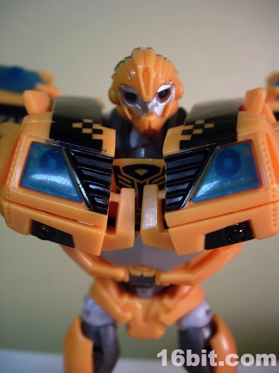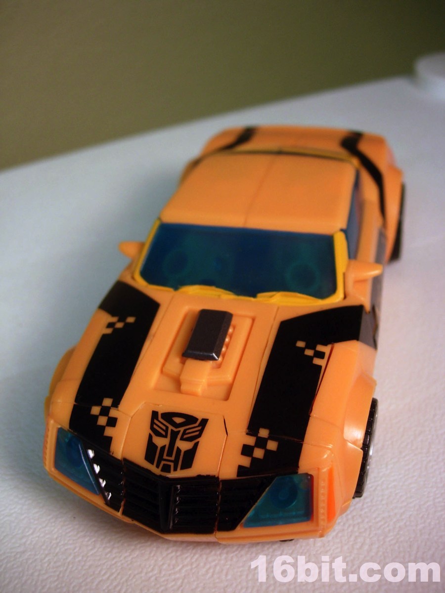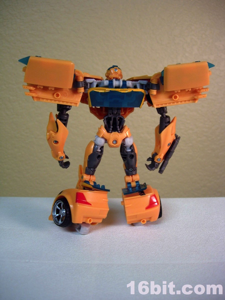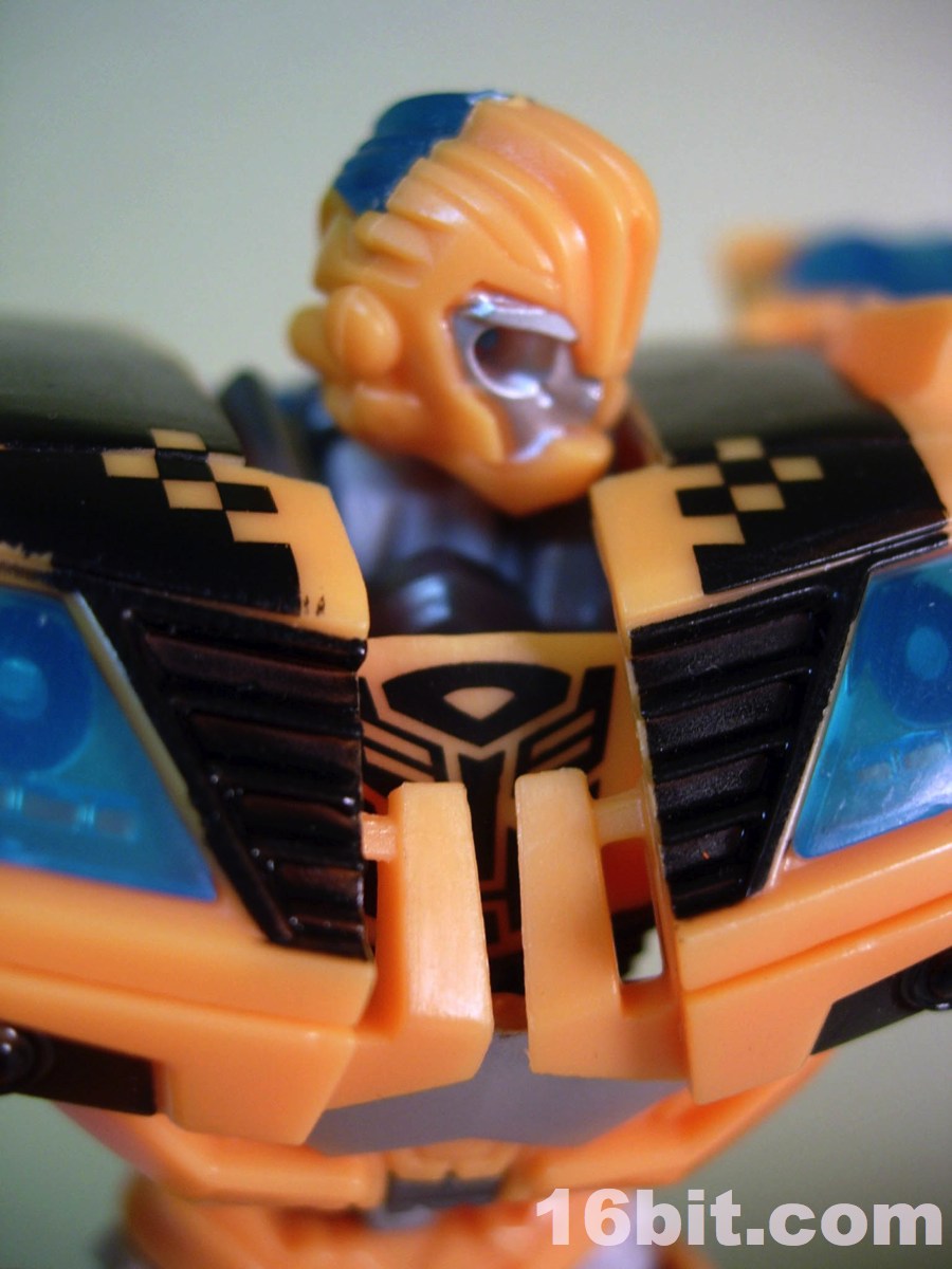 Bumblebee isn't as solid of a design as Arcee, and the transformation is something of a trial-- it doesn't help that the instructions are hard to get right, and most photos of the toys have the chest area done incorrectly. I'm not even 100% sure that I got it right, but no matter what he will stand roughly 6-inches tall. Slightly orange in color, the figure is that bright color with some clear blue, silver, and grey to make up the rest of the design. Detail is light, with lots of flat surfaces on most of the toy. So, on many levels, it looks like the animation model minus the taxi stuff.
