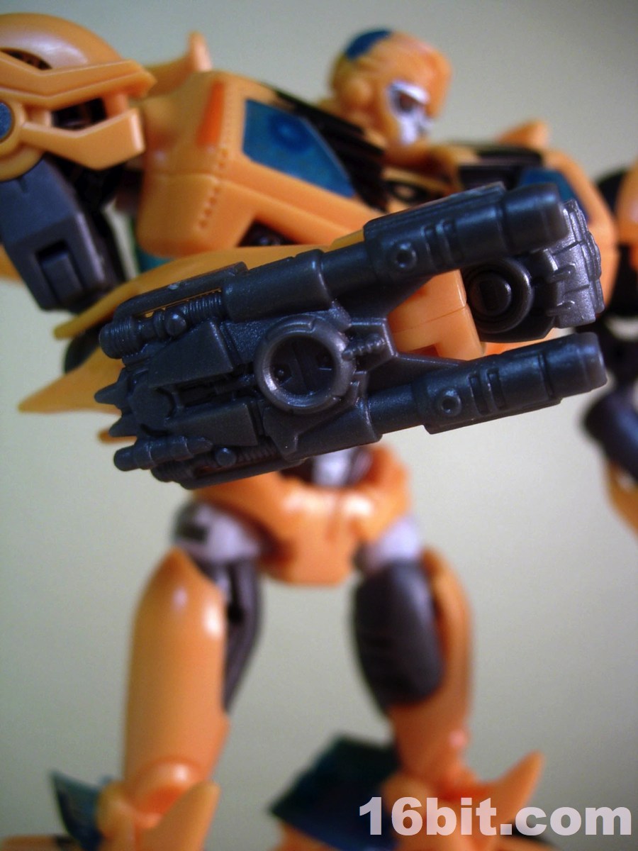 I dislike transforming and playing with this one. The legs are fine, but the arms are somewhat awkward to position and the chest just looks wrong. In taxi mode he looks fantastic, but his Autobot symbol is partially covered when he changes into a robot. The arm positioning seems arbitrary, much like in Beast Wars as the line wrapped up, so I suppose the true form of the robot mode is somewhat subjective. At least in the arms and chest-- the legs are pretty straightforward, and the toy's overall look and feel fits in with a lot of recent Reveal the Shield and Generations toys. Bumblebee isn't unarmed, as he's got this swell snap-on arm cannon which fits into a port on either forearm. Arcee has a similar setup, so they can swap weapons if you're so inclined.