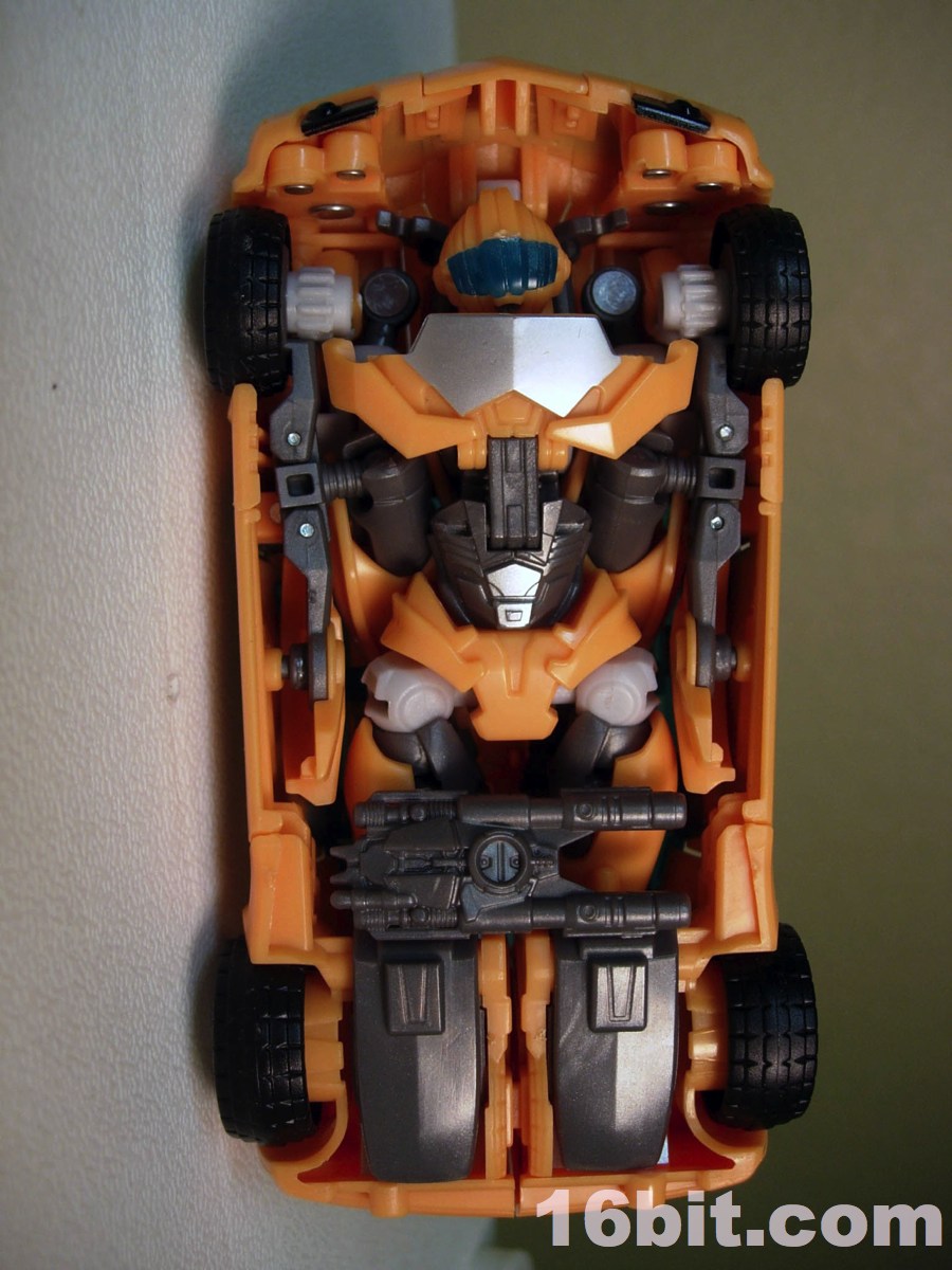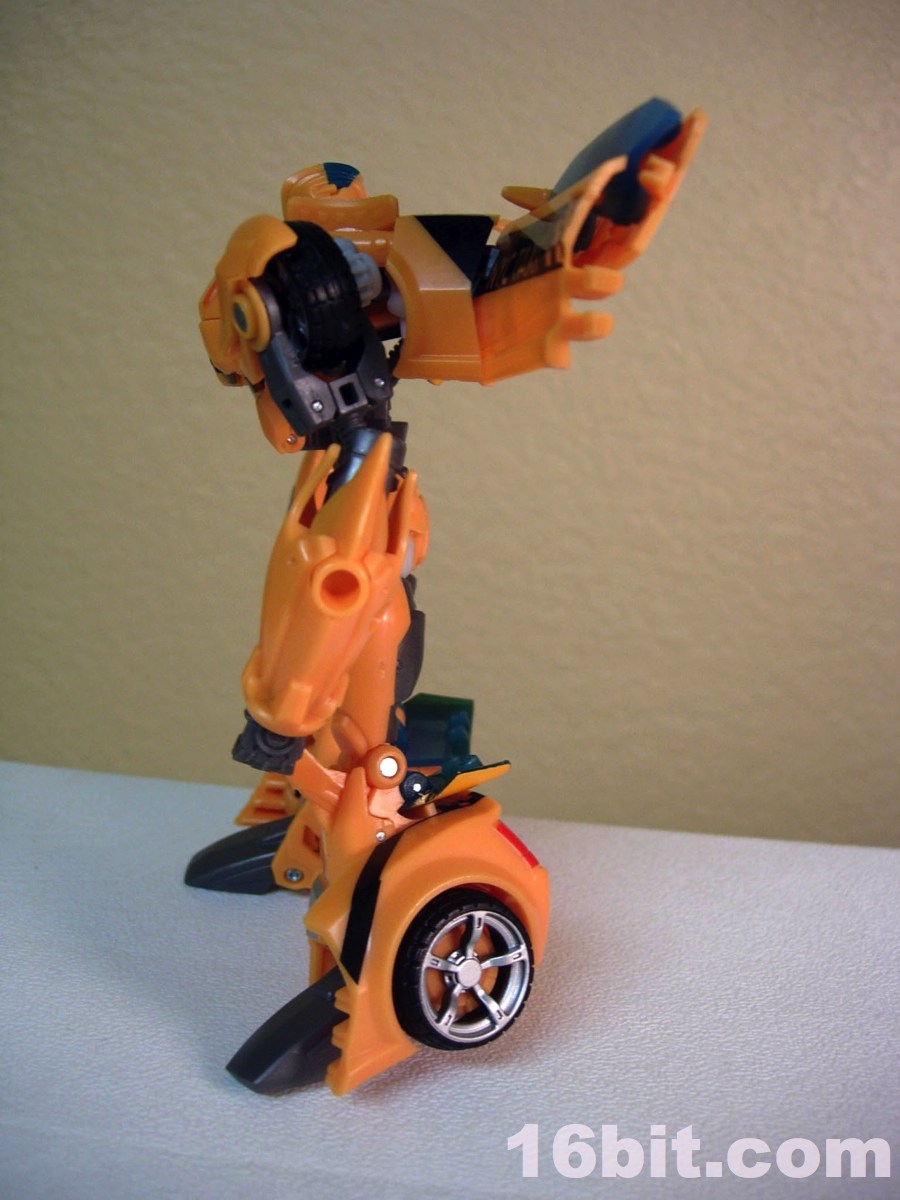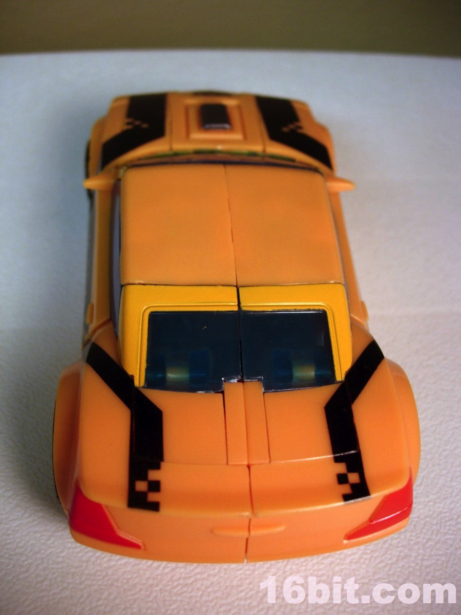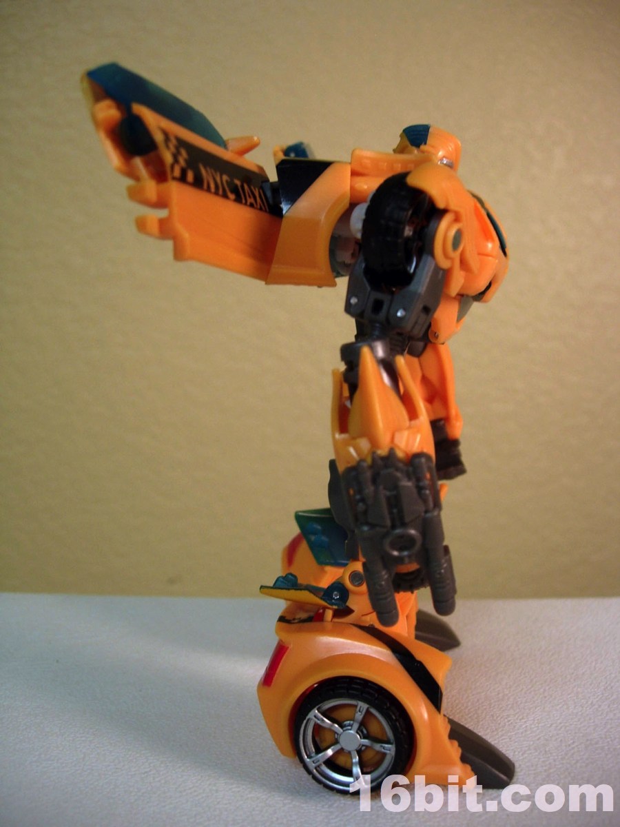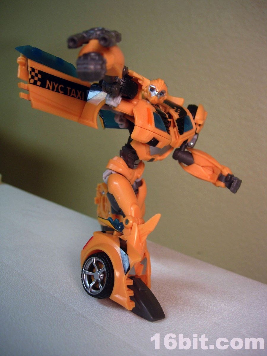 In vehicle mode, Bumblebee is a sportscar painted like a taxi and it turned out great. His wheels roll... and that's about all he does. I personally think that the vehicle mode is cooler than the robot mode, so if you were to buy multiple versions of this mold you would probably want to leave this one as the cab. I don't have much more to say that isn't represented by the pictures... it's a nice car, the wheels roll, and the gun stores under the vehicle mode. What else could you realistically ask for these days?