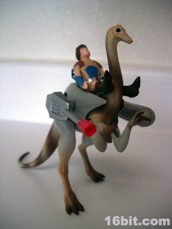 His companion figure is, at least, not blue. Most of the good guys are blue, but Nimbus is brown, with brown hair, and... well, he does his job. The figures in this line were the accessories, and that's a mentality in toys that's long since left the building outside Imaginext, Playmobil, and LEGO. The vehicle, the playset, the creature is what's important-- the figure is just some dude to sit in a seat, a proxy for the child playing with the toy. Action figure collectors have moved to focus solely on the figure, the character. The toy element is a thing of the past, which is a shame as while I like my action figures, as a kid, the vehicles were damned exciting stuff. I mean, look at Nimbus-- this is a kid who'd lose his lunch money. But he's got a cool dinosaur to ride around on, and I don't care how much of a putz you are-- you can make friends if you ride around on a dinosaur.