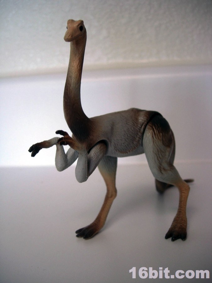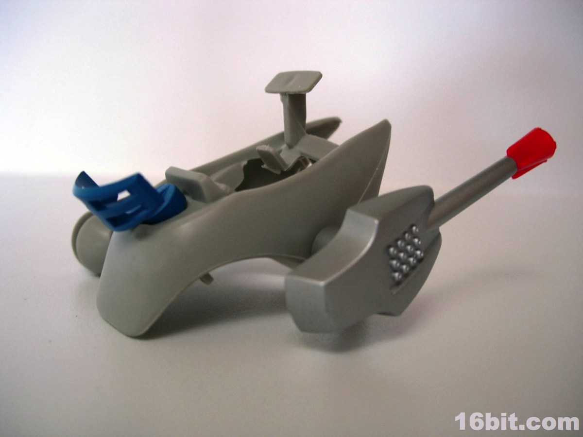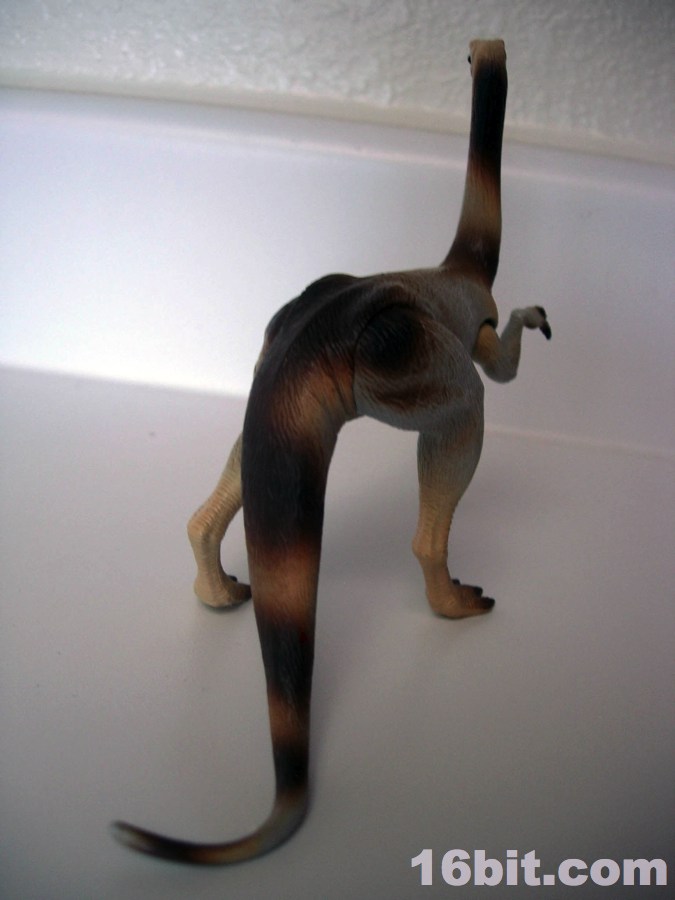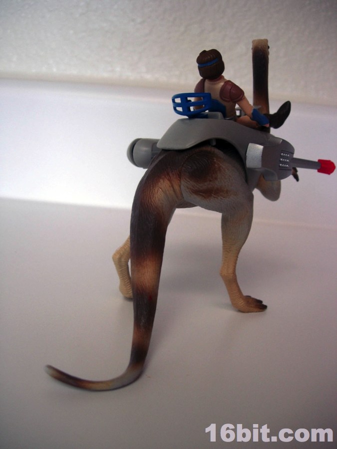 The dino-ostrich stands just fine, the third leg acting as a tripod making a display stand unnecessary-- even with all his gear, he had no problem standing up on his own, which is the way I think most 1980s toy fans remember their toys. Today, toys need display stands-- back 25-30 years ago, they just friggin' worked. The Struthiomimus has no action features and only 4 points of articulation, so he's really more of a display piece than he is an Awesome Toy. The saddle has a gun and storage for spare red gun tips, should you lose any, and the silver, grey, and blue design matches the good guys nicely. I've had this one since I was a kid and I remember not being as excited about it as some of the four-legged lizards, and as an adult I can see why. It doesn't do anything-- it's a model, it's a shelf item.