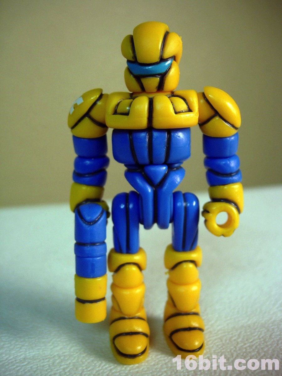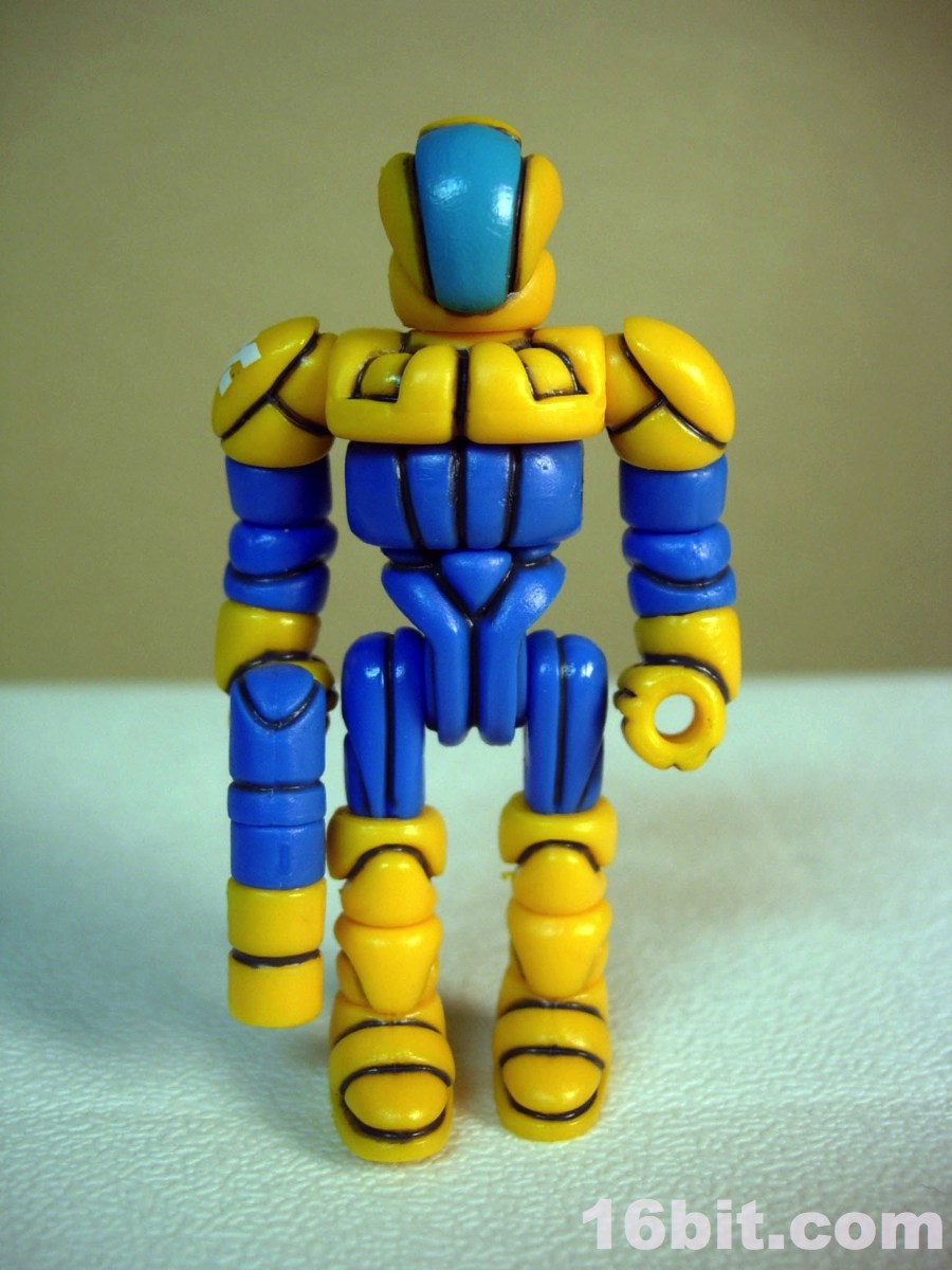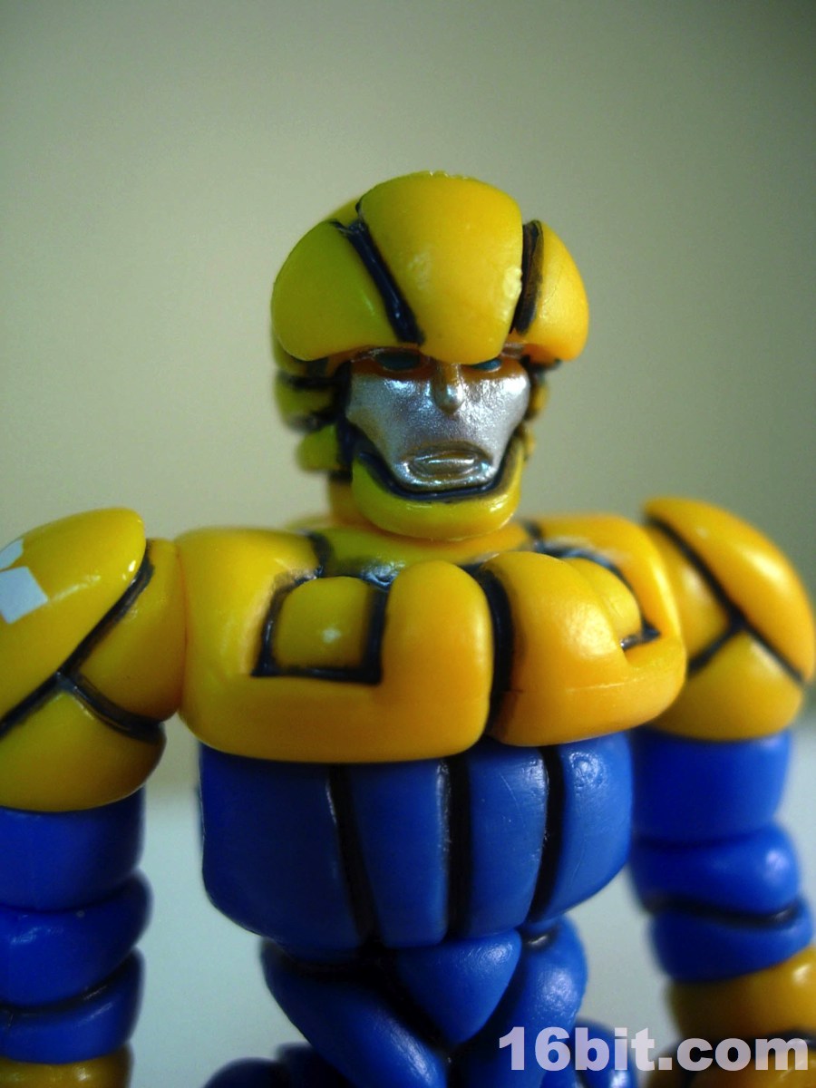 Made of 25 pieces (roughly), this figure is jointed at every seam. For those unfamiliar with Glyos, you can also pop him apart at every joint and swap with other compatible figures. If you wanted to make an entirely blue or yellow figure, that's possible-- but I like it as is. He has no problems standing, sitting, or g.shtmling his gun. In short, he's a good toy.