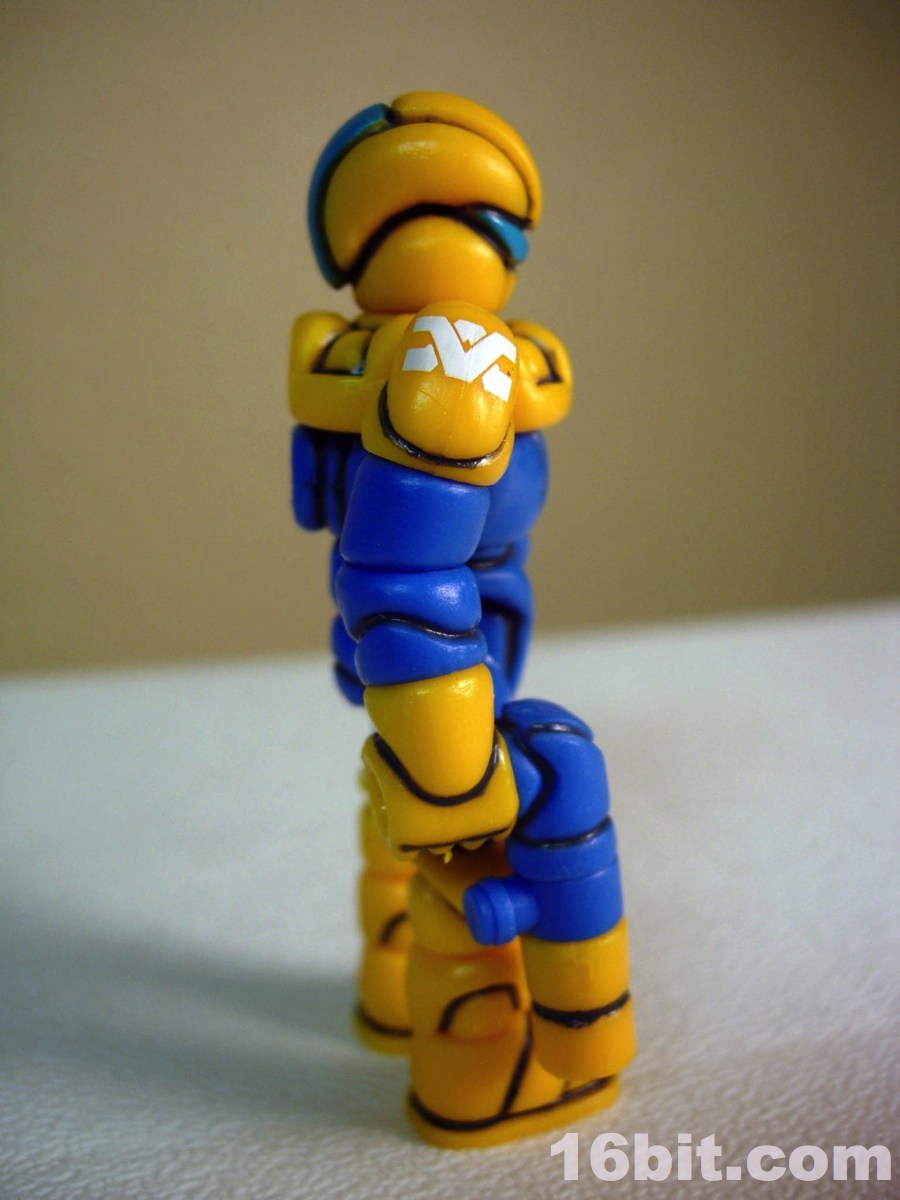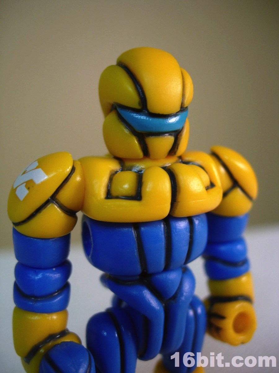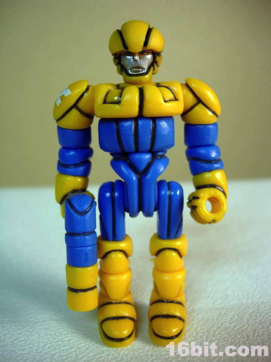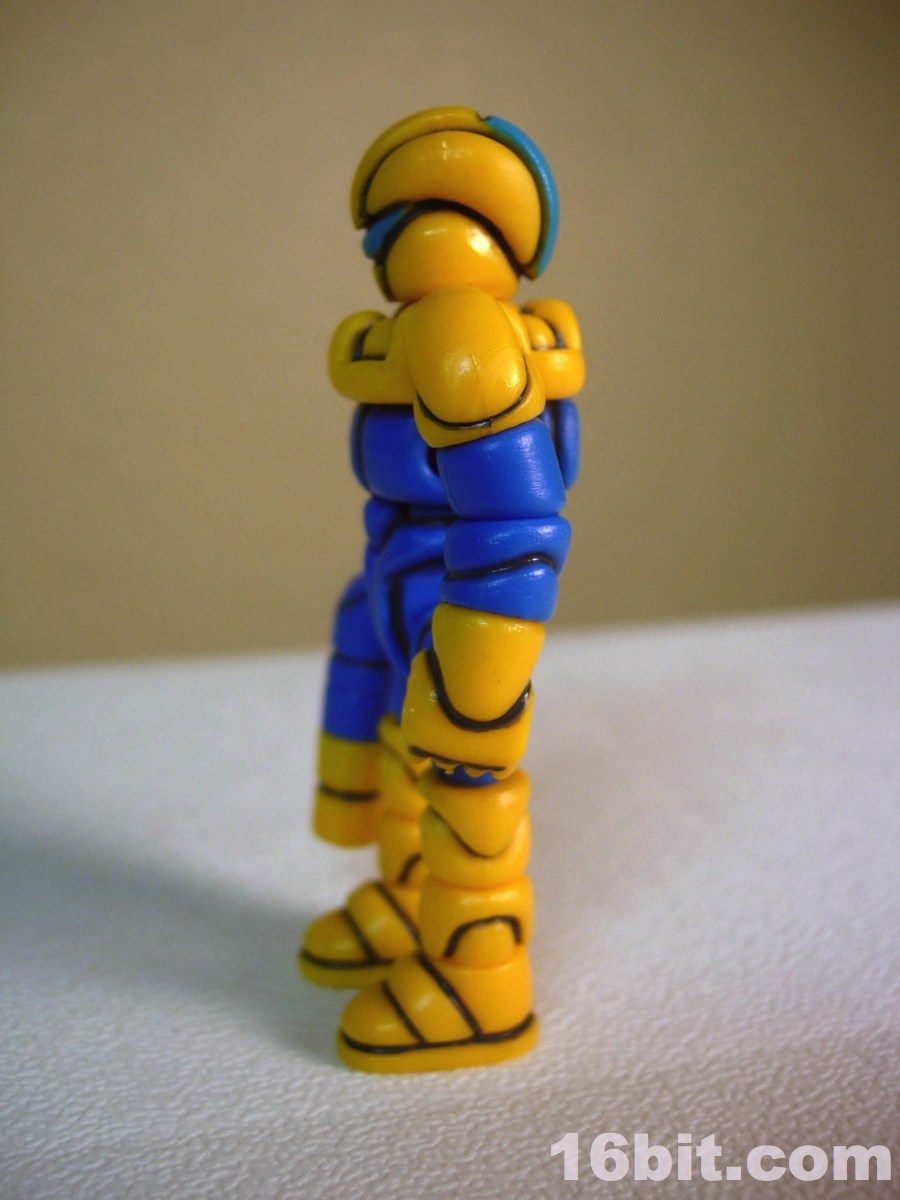 Made of 25 pieces (roughly), this figure is jointed at every seam. For those unfamiliar with Glyos, you can also pop him apart at every joint and swap with other compatible figures. If you wanted to make an entirely blue or yellow figure, that's possible-- but I like it as is. He has no problems standing, sitting, or g.shtmling his gun. In short, he's a good toy.